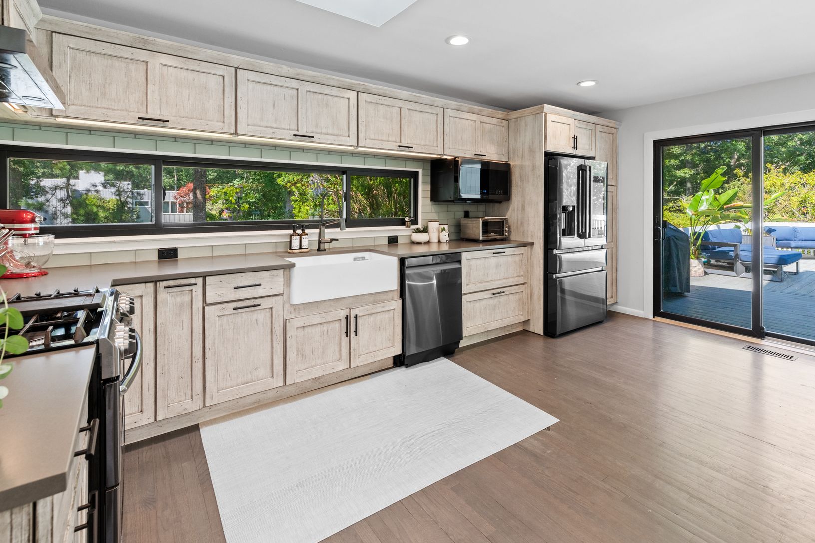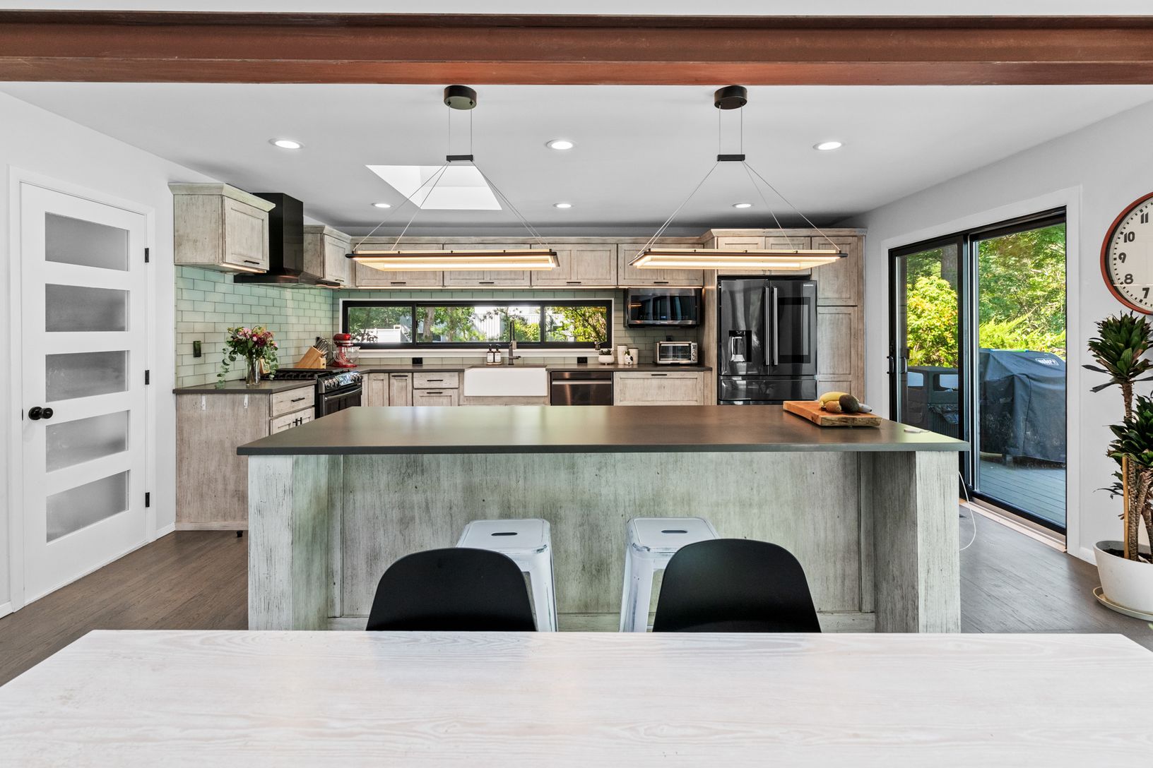 This exceptional property has been meticulously renovated and is turn key for your immediate enjoyment. As you enter you are welcomed by tall ceilings and exceptional natural light that floods in through brand new Anderson sliding doors and windows. The airy living room features a 360 degree fireplace and flows into a br
