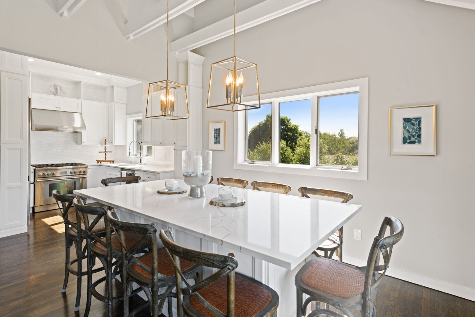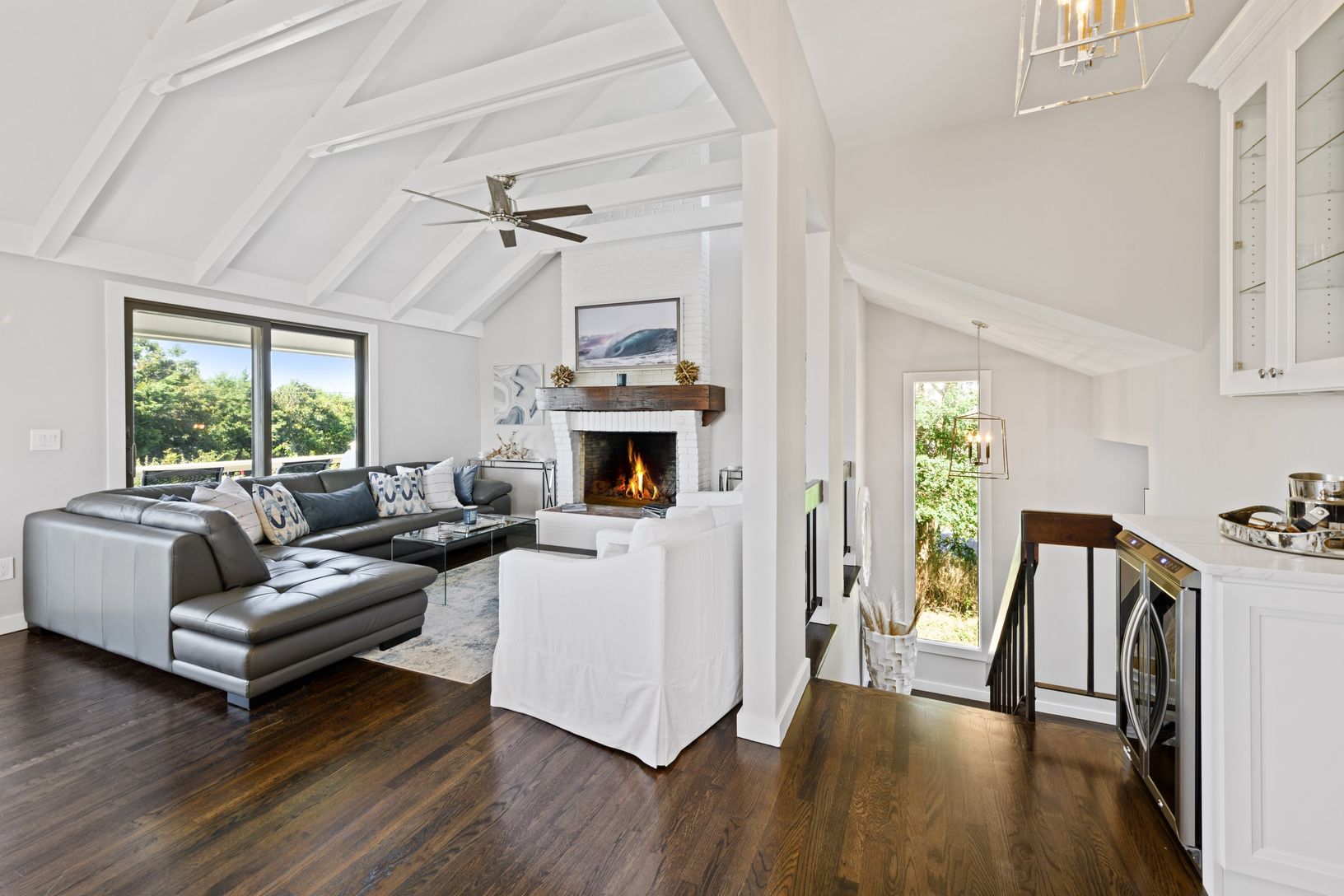 Located in coveted Culloden Shores, this newly renovated, light-filled contemporary is your Montauk dream home. The house sits directly across the street from a beautiful private community beach with beach rights. The lower level consists of 4 spacious bedrooms, laundry area, owner’s closet and access to large, private yard. The bunk rooms have custom built-in bunks. The second floor showcases a great room with cathedral, beamed ceilings, gour