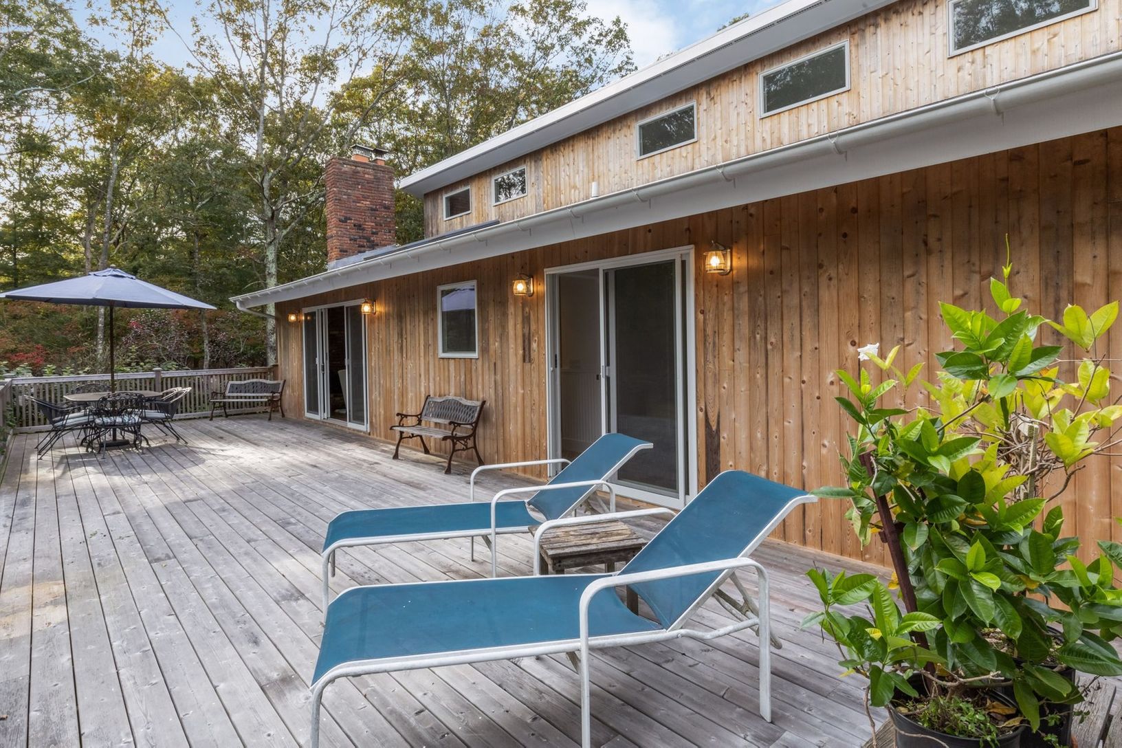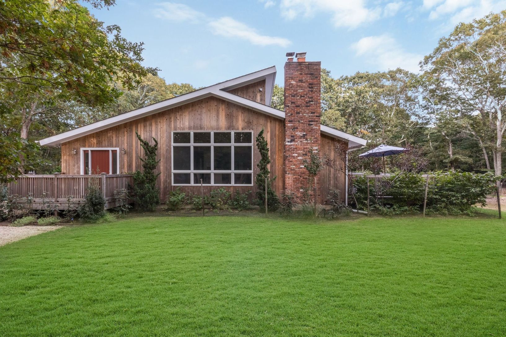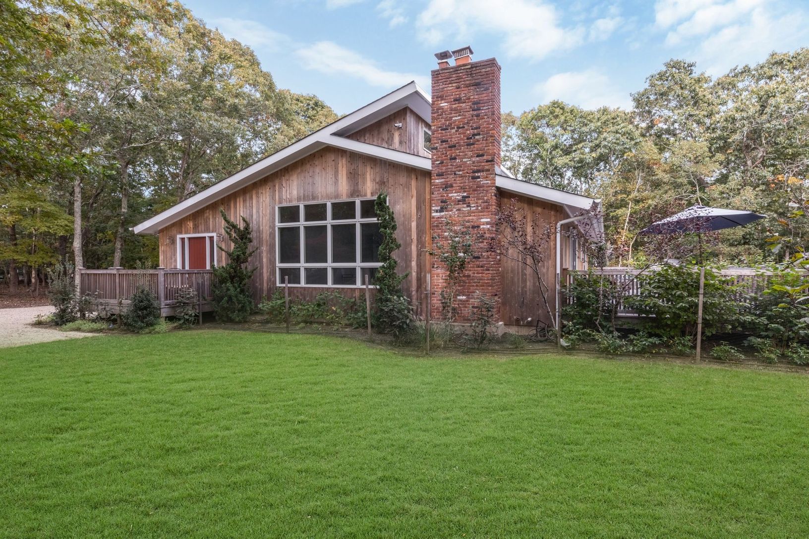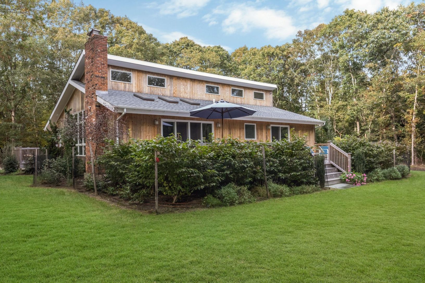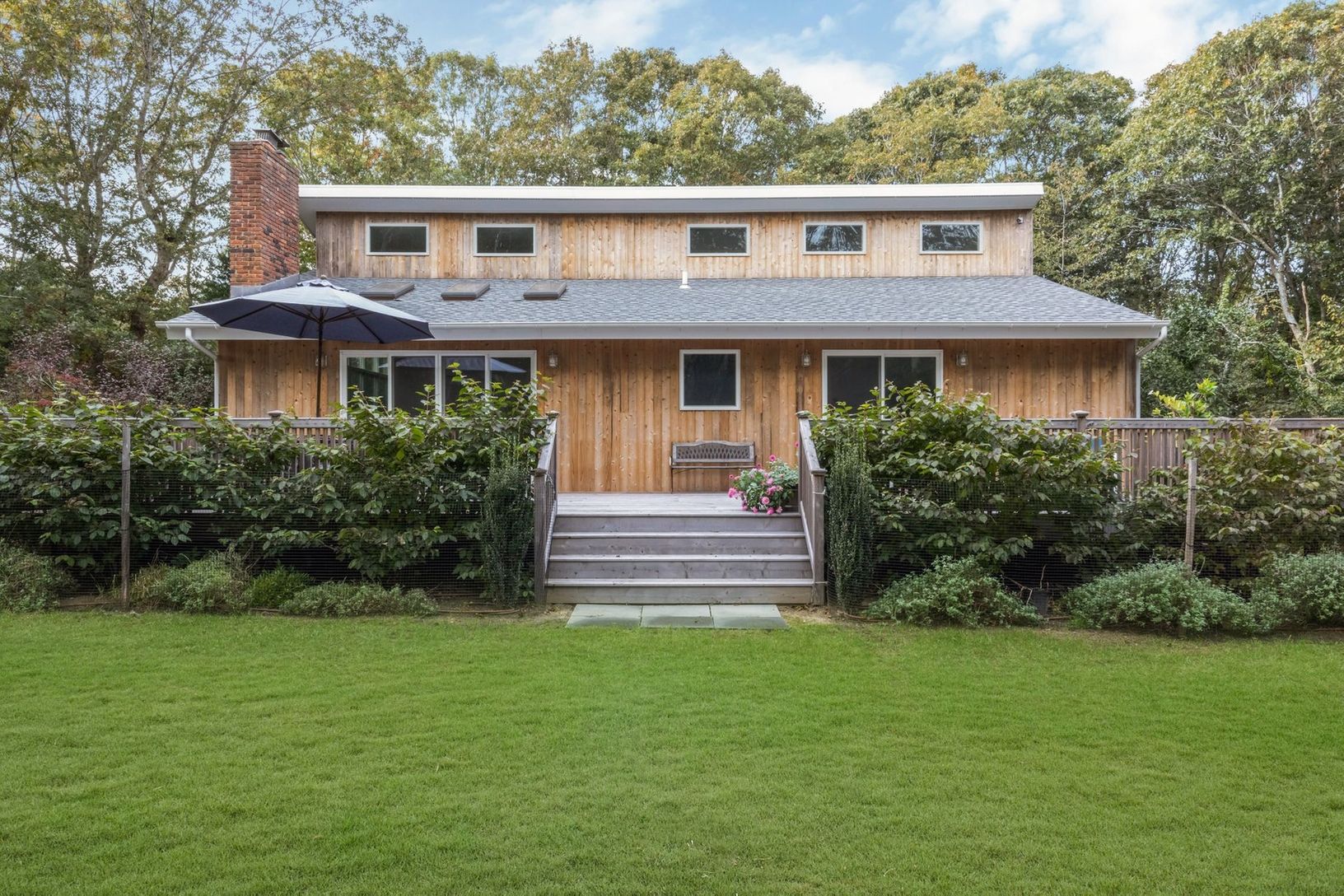 Completely renovated light-filled Traditional located on a private flag lot less than three miles to East Hampton Village. Featuring a living room with cathedral ceiling and cozy wood burning fireplace, brand new gourmet kitchen with Viking gas stove and stainless steel appliances, four large bedrooms, two which have ensuite full bathrooms, an additional hallway full bath, and two bonus spaces to use as you wish. The renovations also include n