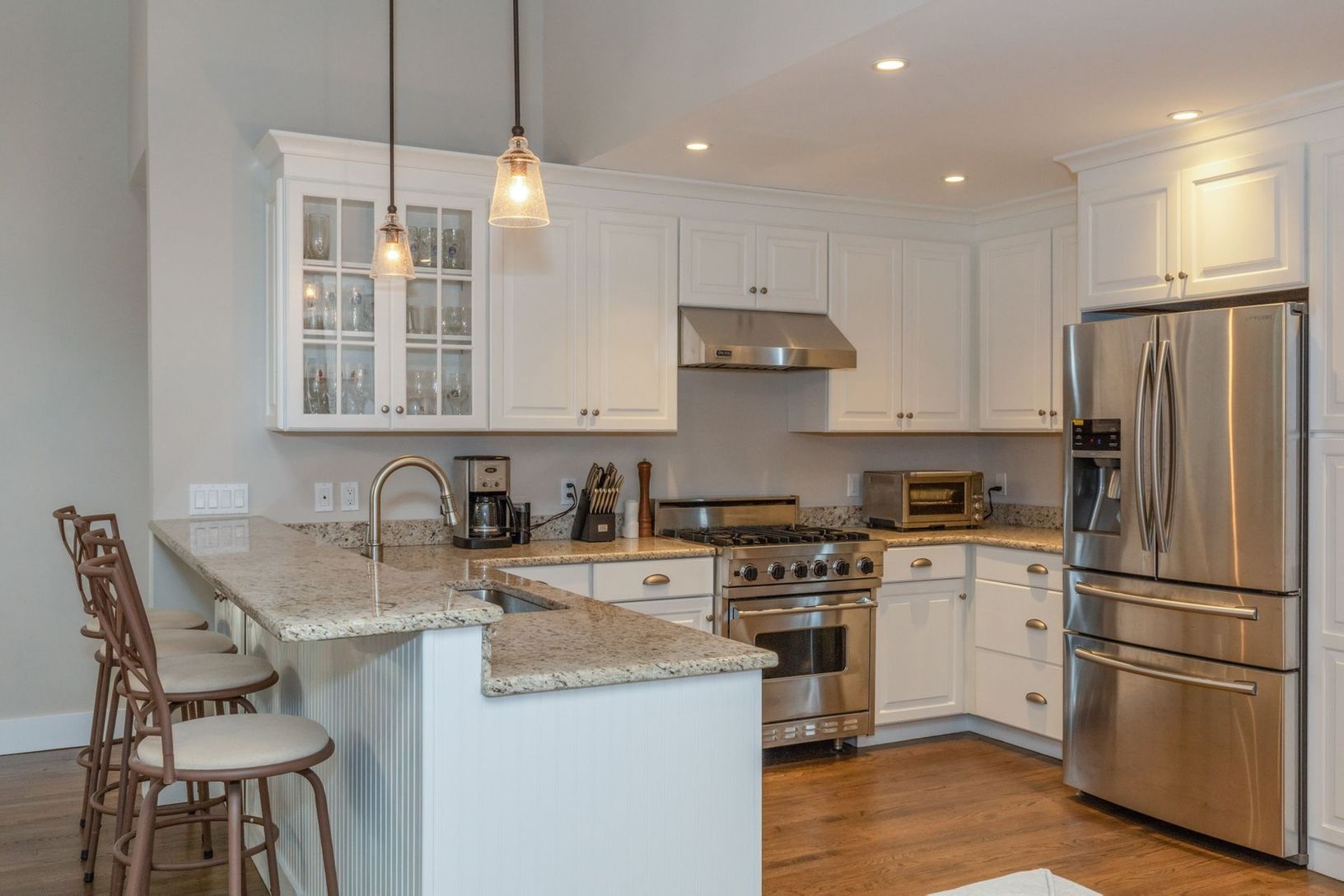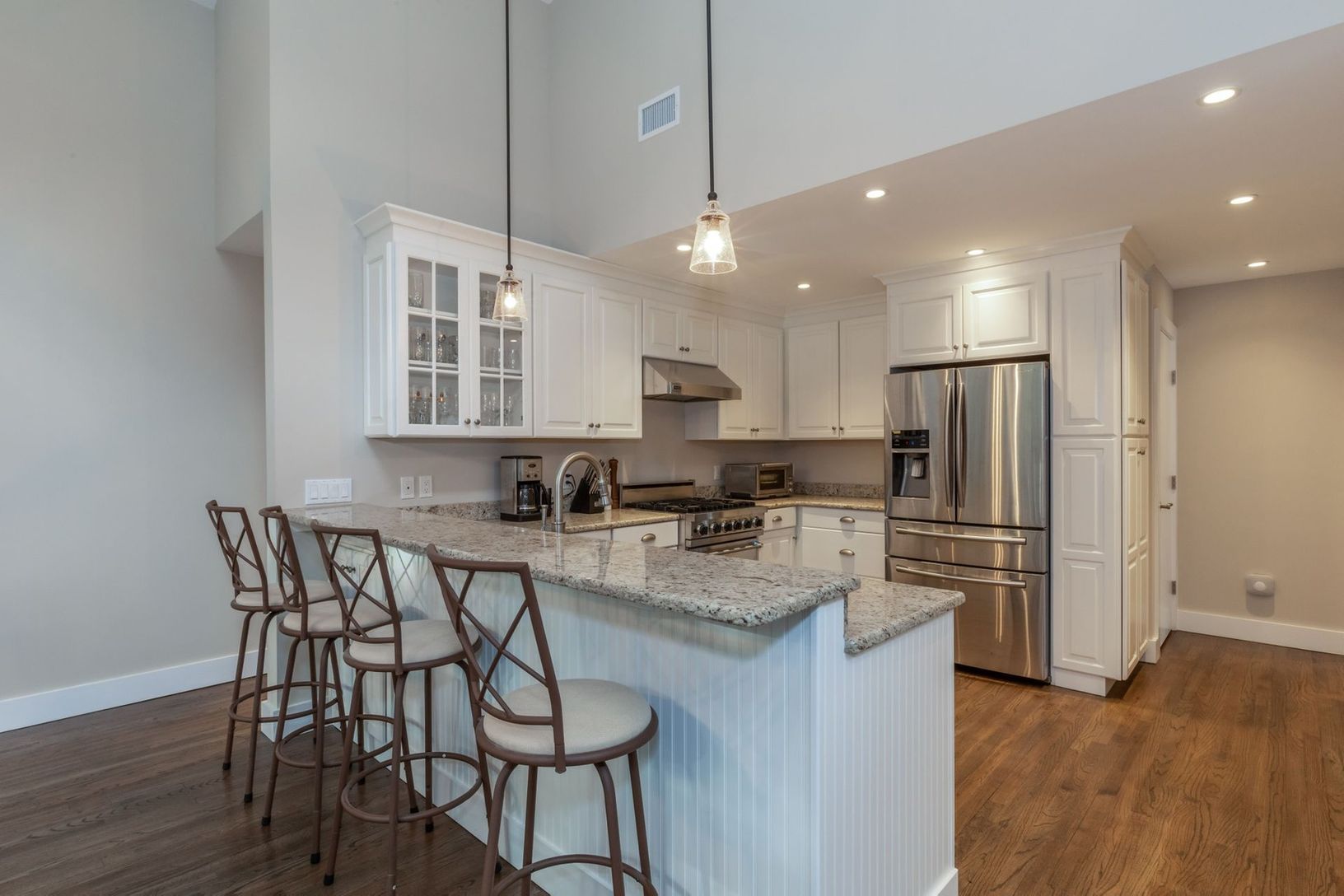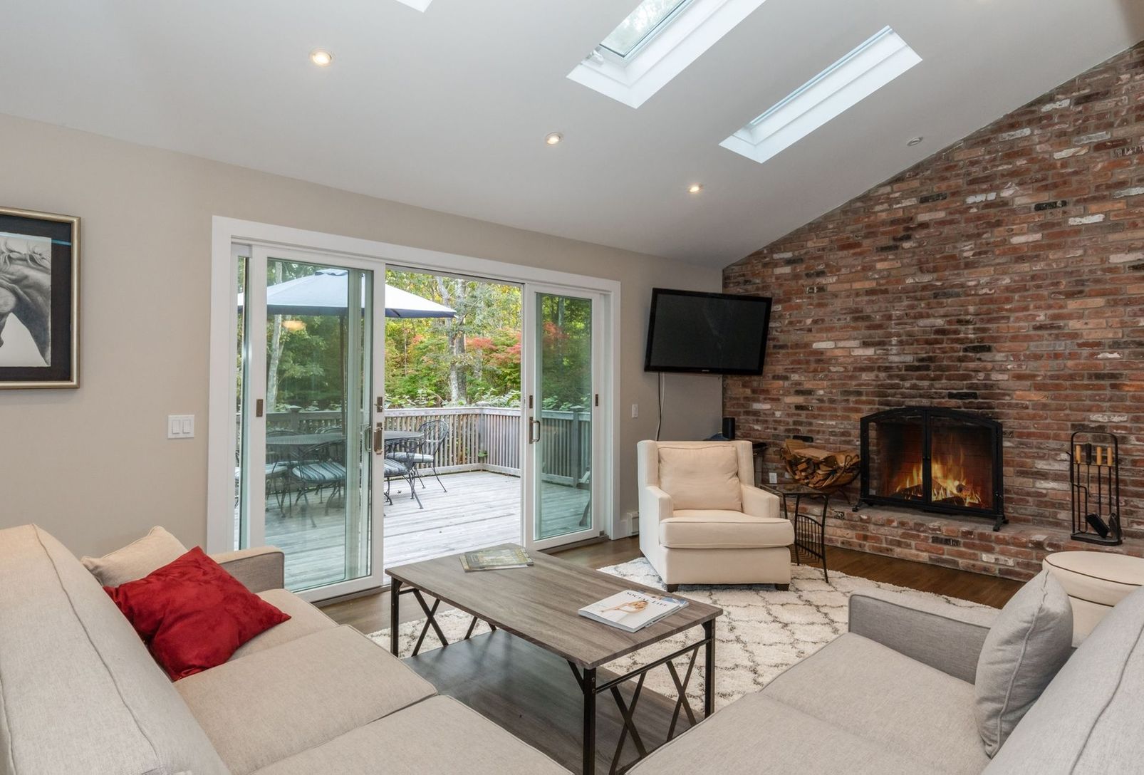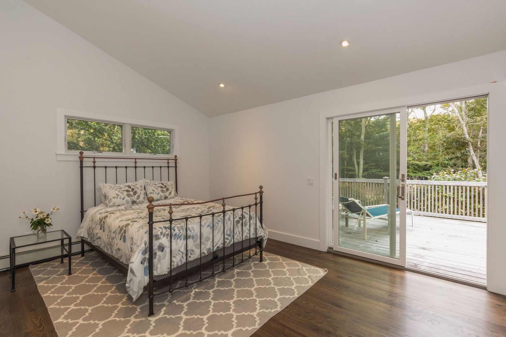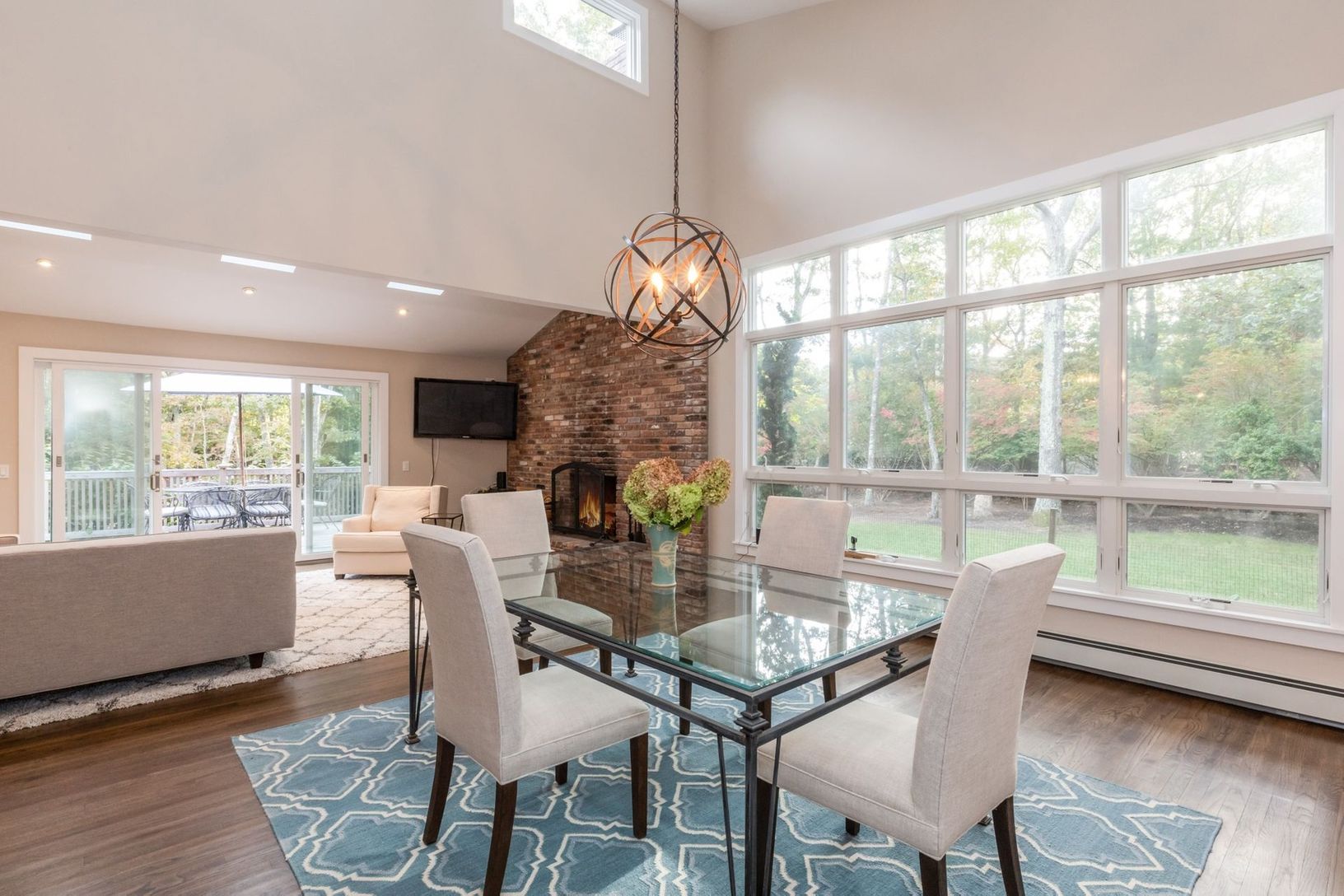 Completely renovated light-filled Traditional located on a private flag lot less than three miles to East Hampton Village. Featuring a living room with cathedral ceiling and cozy wood burning fireplace, brand new gourmet kitchen with Viking gas stove and stainless steel appliances, four large bedrooms, two which have ensuite full bathrooms, an additional hallway full bath, and two bonus spaces to use as you wish. The renovations also include n
