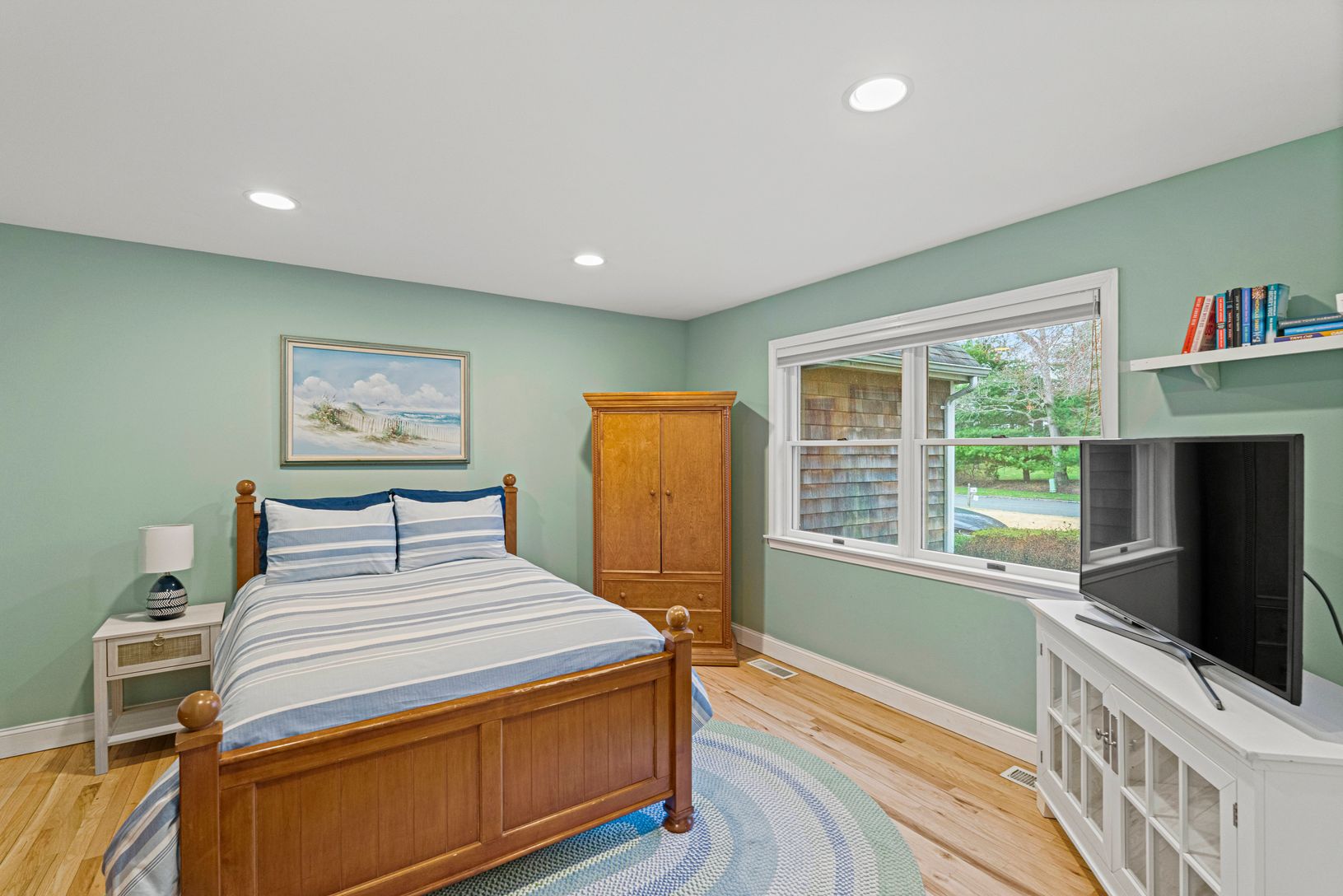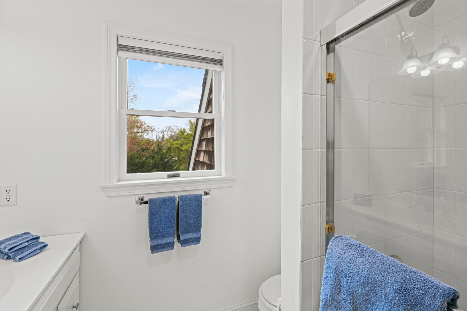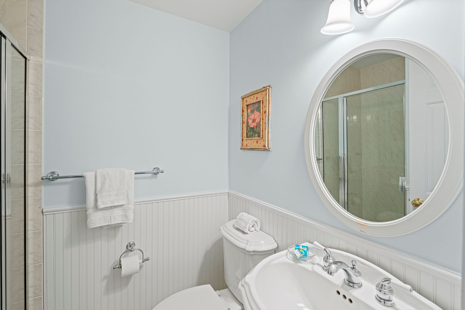 First floor primary suite (queen bed) w/ bathroom and one other bedroom (full bed) and bathroom downstairs. Second floor has two more bedrooms (one queen a