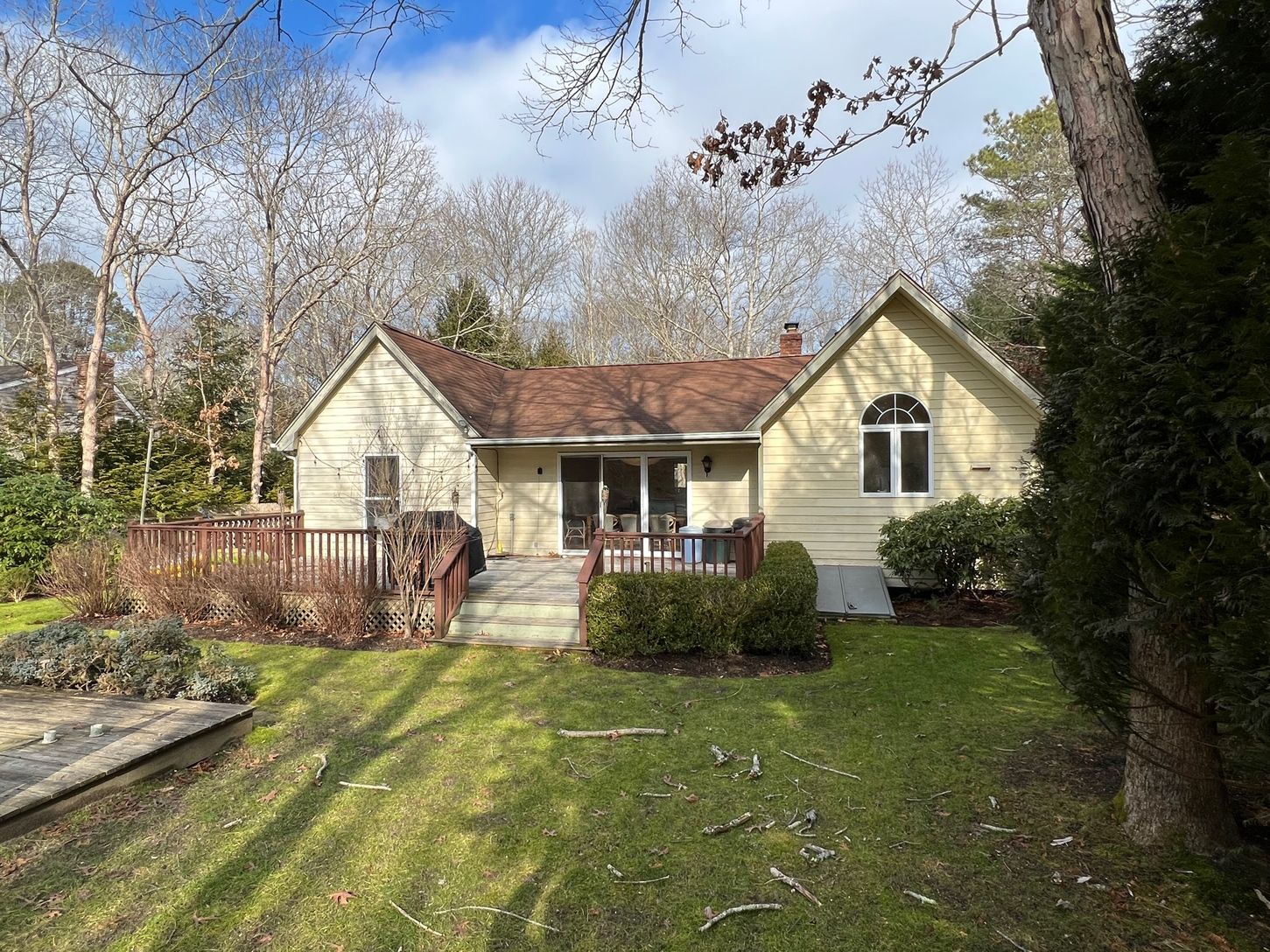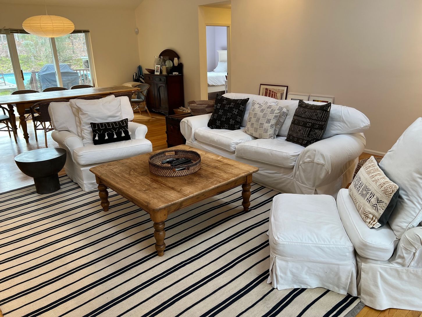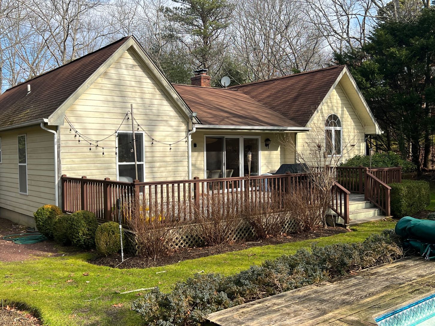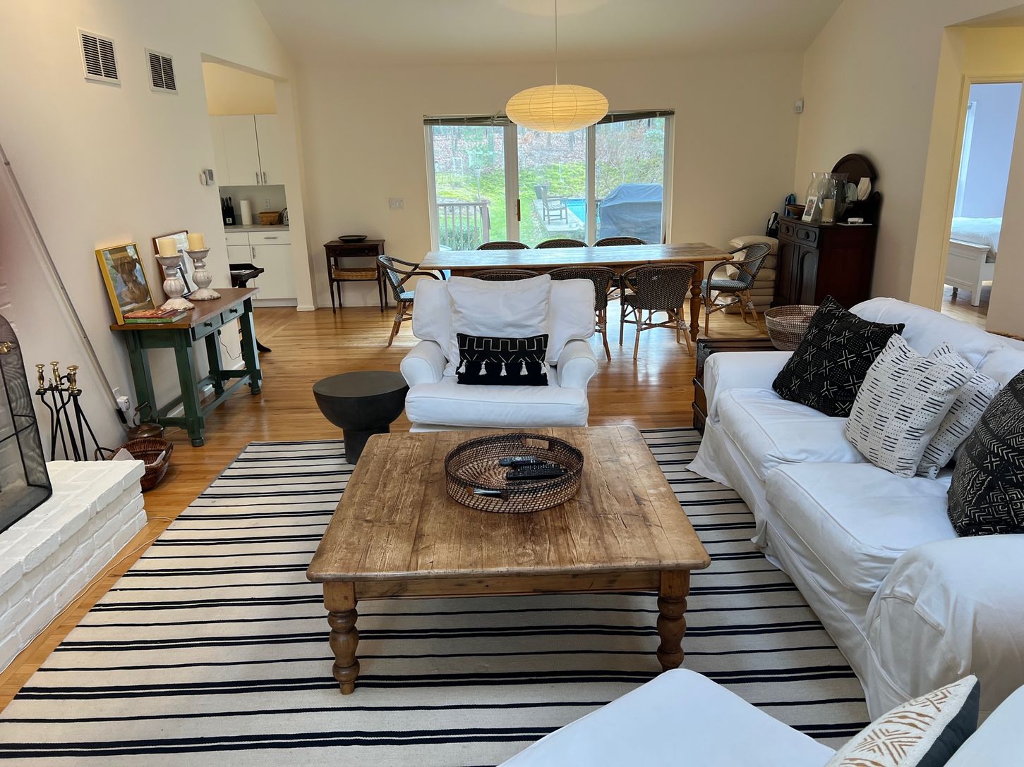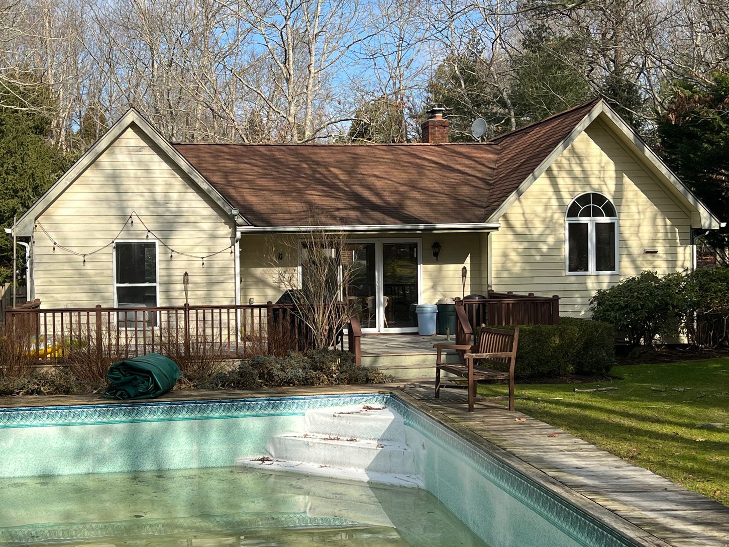 Just listed and situated on.59 acre. Great Location, close to town,convenient to East Hampton Village, ocean, bay and Sag Harbor. One story living at its best with vaulted ceiling living/dining room, fireplace, open plan kitchen and sliders to pool. Three bedrooms with primary and ensuite bath on one side of house. Two guest bedrooms and shared bath on opposite side of house. Full basement suitable for finishing