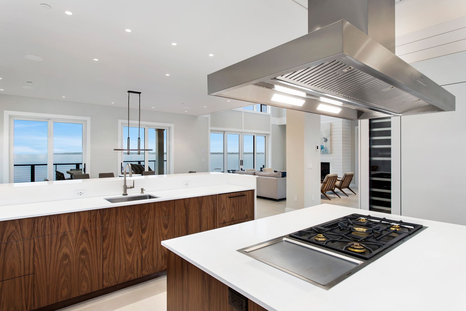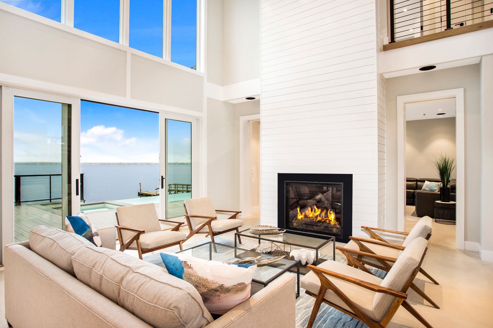Sitting at the edge of the water, this modern new construction home offers stunning views overlooking the bay! The foyer's 30' ceilings open into a spacious two story great room and an elegant dining room, which are highlighted by the expansive windows and sliding doors that offer year-round water views from every window in the house. The chef's kitchen, full of custom cabinetry and quartz counter-tops, is comprised of a Gaggenau gas cooktop a