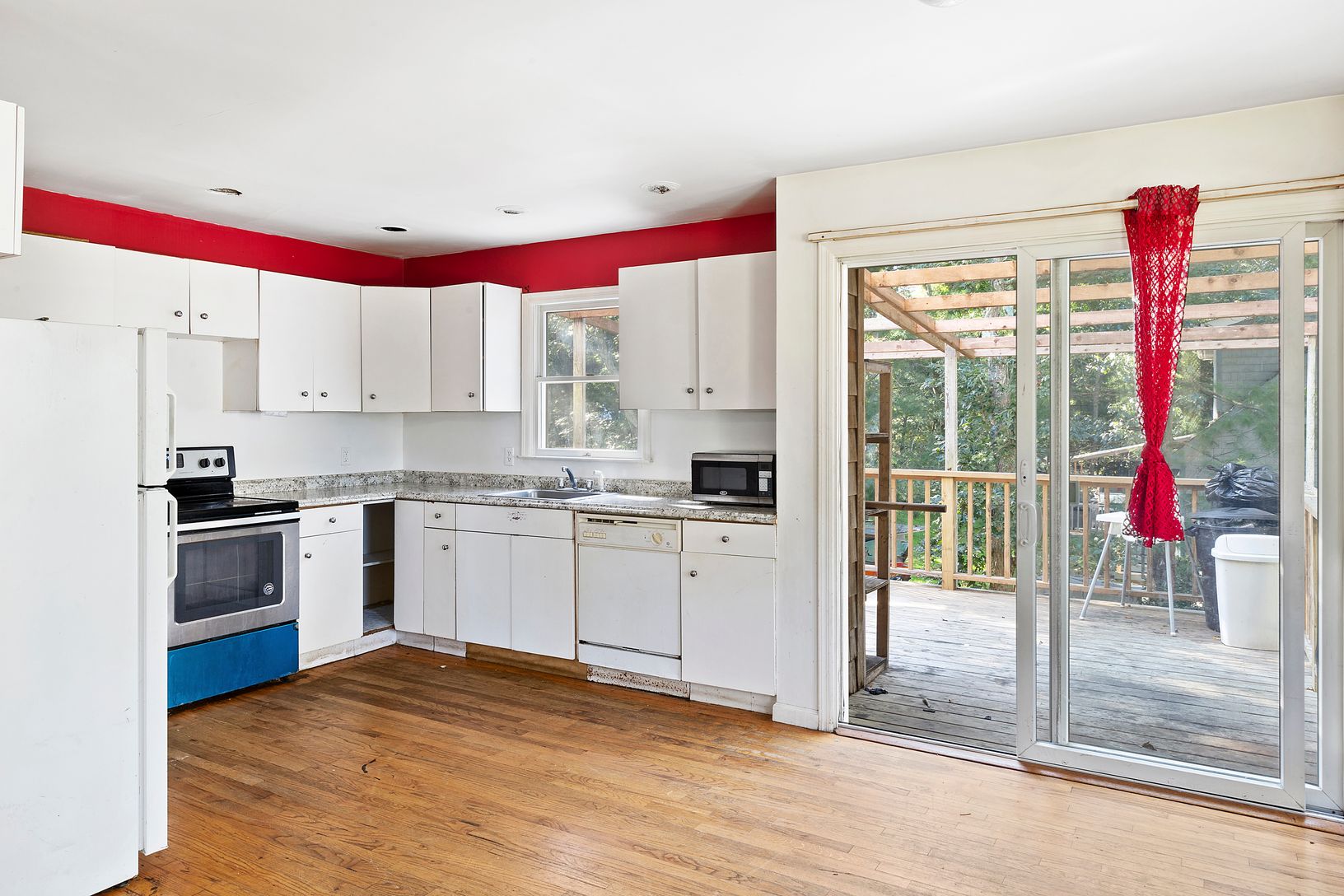 This home is being sold as is and is priced to sell. A four bedroom and two bath home with enormous potential. The first level features a large living room with fireplace, dining area which opens up to the back deck, large kitchen and two bedrooms that share one full bathroom. Upstairs there are two more bedrooms which share one full bathroom. Between the upstairs bedrooms there is a hallway closet for extra storage. The home also features a f