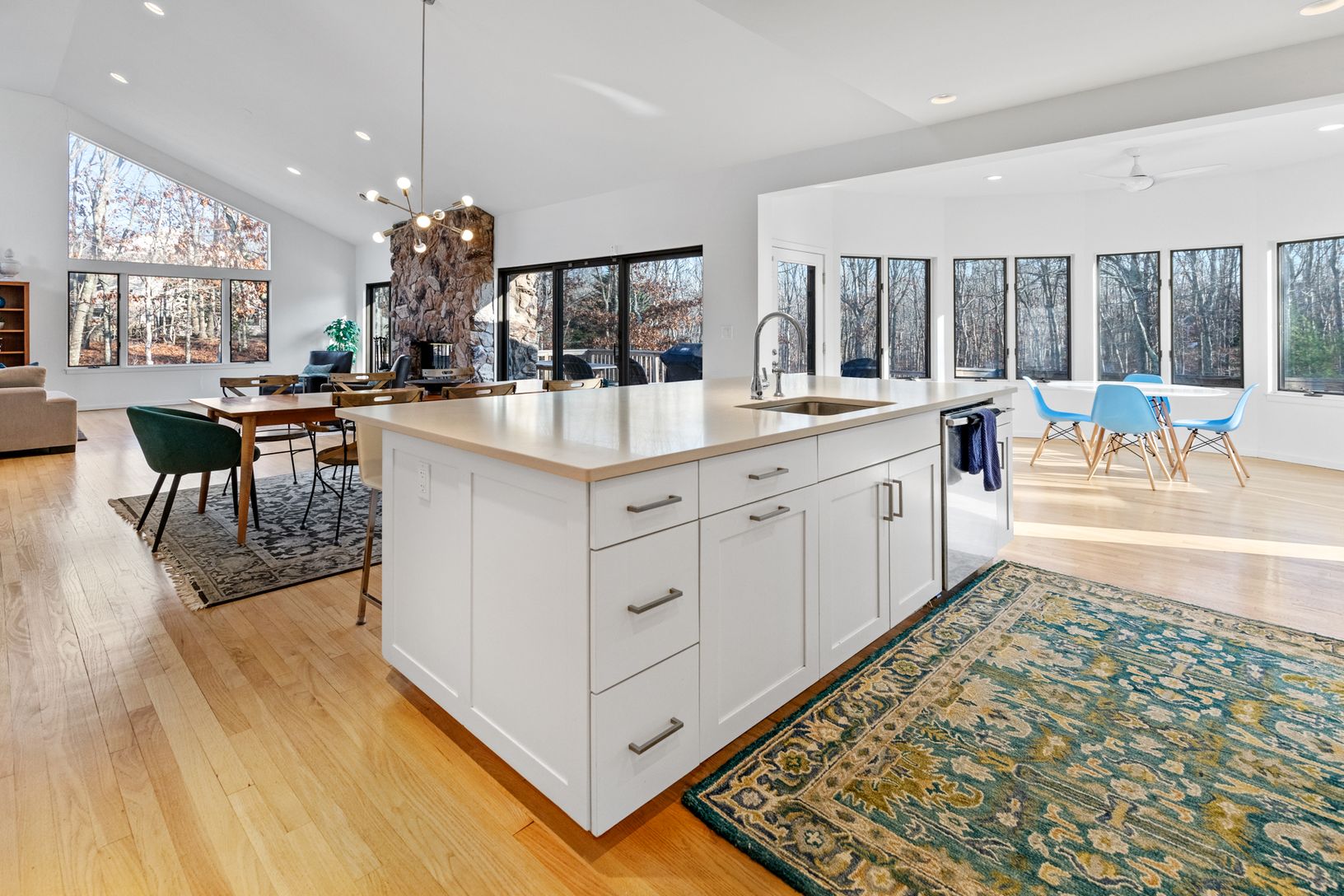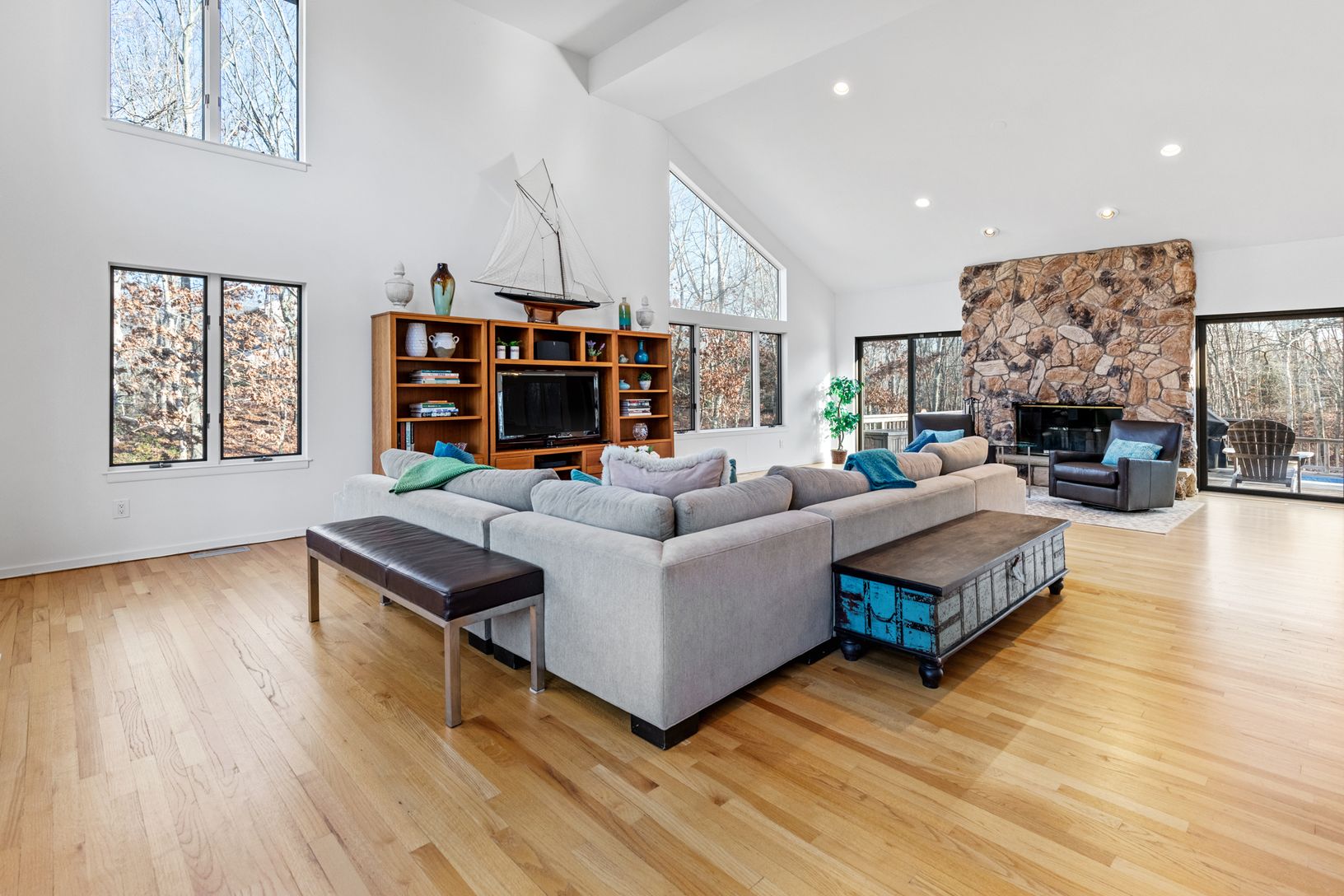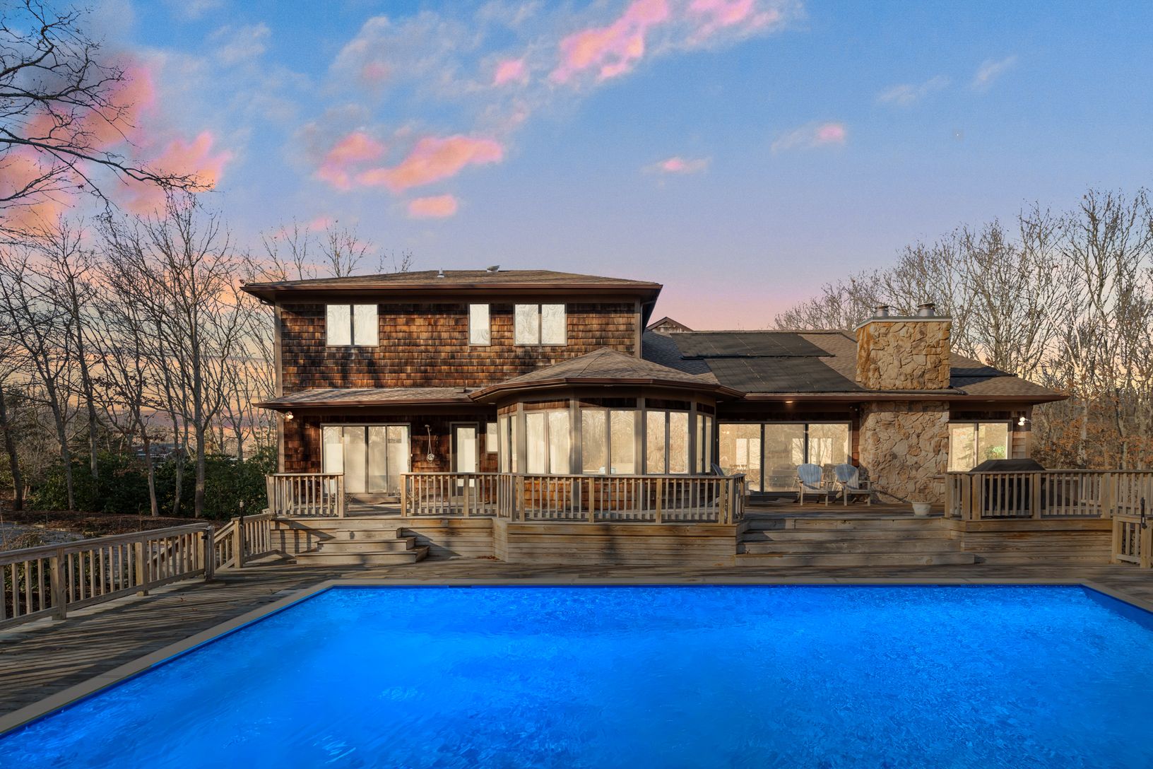 This stunning contemporary rests on 1.4 acres with a heated pool. The two story living room has walls of windows, lots of natural light, and a soaring stone fireplace. The gourmet kitchen is open to the living room, with custom-made cabinetry, a large center island with Cesar Stone countertops, and hi-end appliances. A windowed breakfast area overlooks the heated 20 x 40 pool and deck and a peaceful wooded setting. The four large bedrooms in