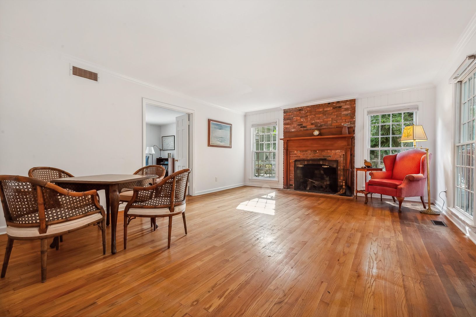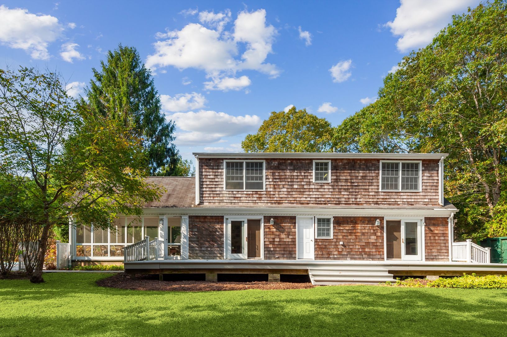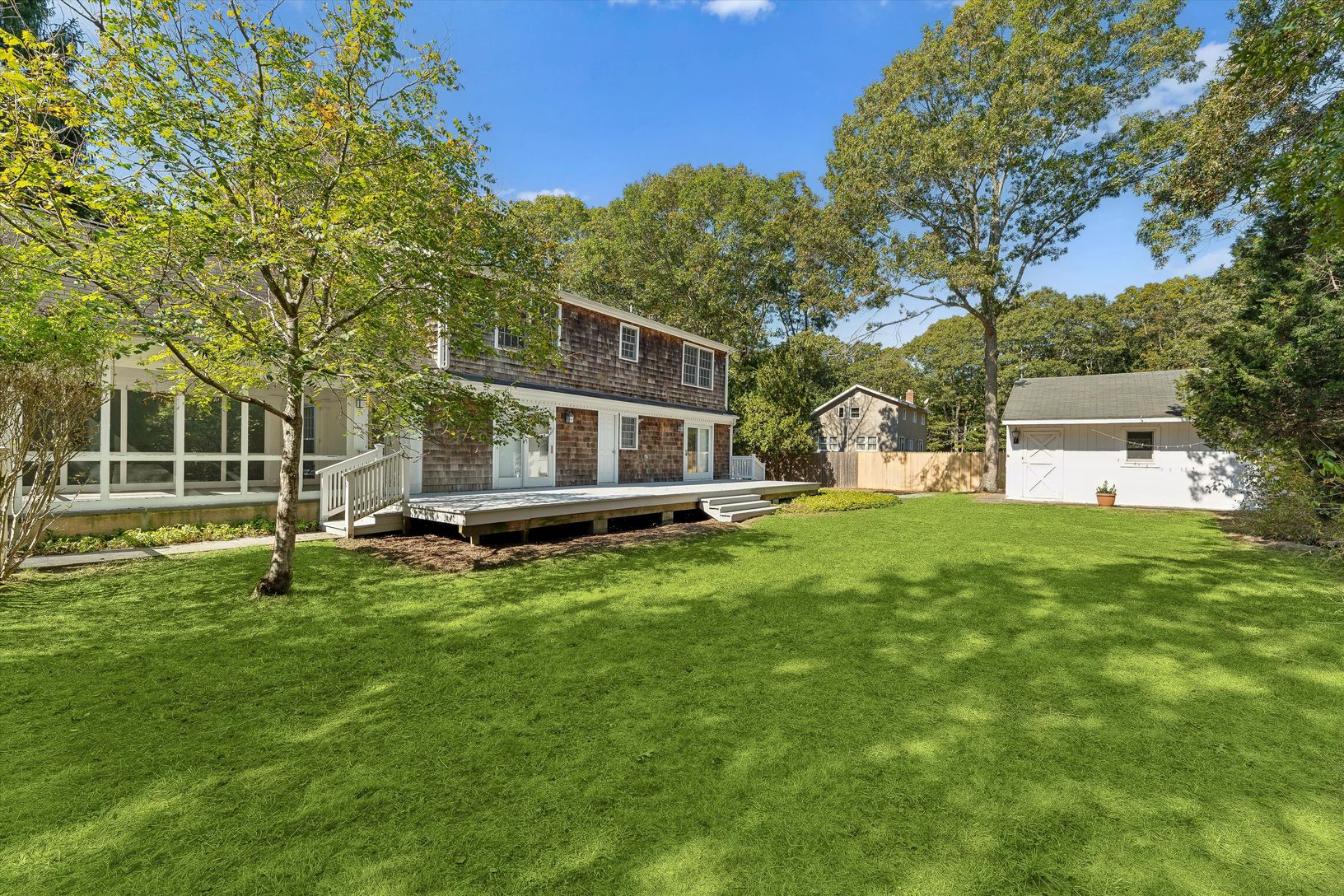 New to market: a cheerful 3 BR/3 BA shingle-style cottage located on a quiet street in the heart of desirable Quogue Village. The main floor offers plenty of living space: there's a large living room with wood-burning fireplace, a family room/den that opens to an airy screened porch, a formal dining room, eat-in kitchen, and a full bath. Upstairs is a generously-sized primary bedroom with en-suite bath and walk-in closet, two guest bedrooms, a
