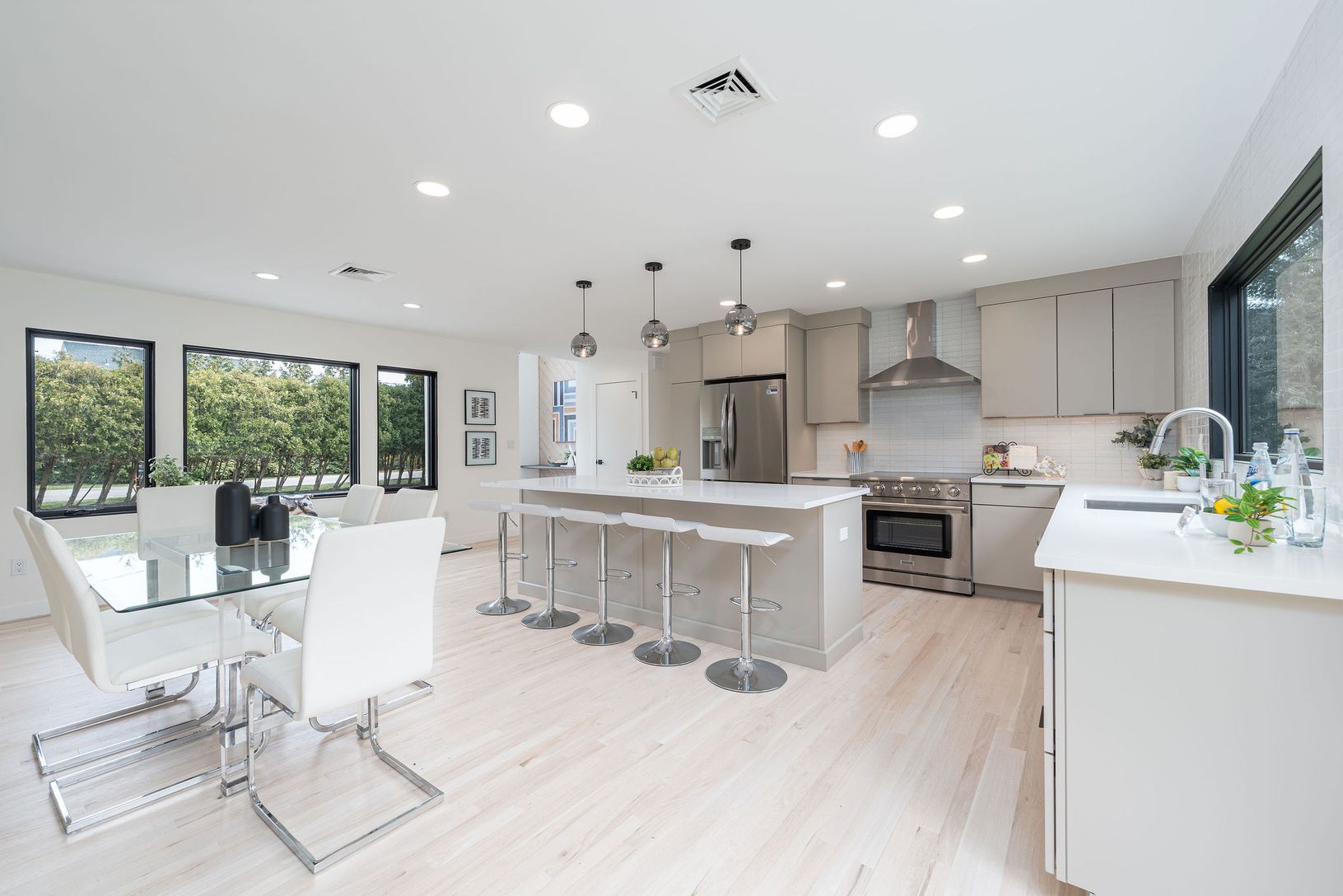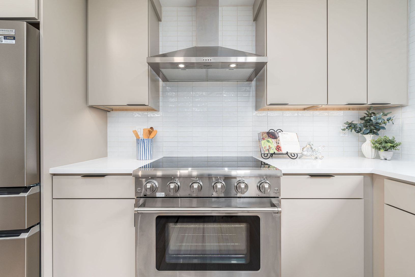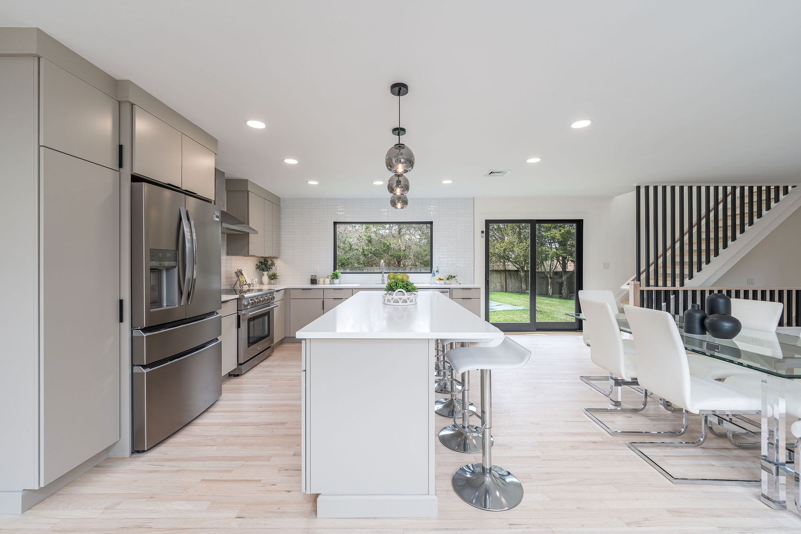 Modern five-bedroom, four-bath residence offering approximately 2,900 sq. ft. of light-filled living space with red oak floors, new Marvin Elevate windows, and a wood-burning fireplace. The home features a wet bar, second-story roof deck with trellis, and a sleek kitchen with flat-panel cabinetry, white quartz countertops, ceramic backsplash, Kohler fixtures, and a full appliance package including a Thor electric range and Frigidaire refrigera
