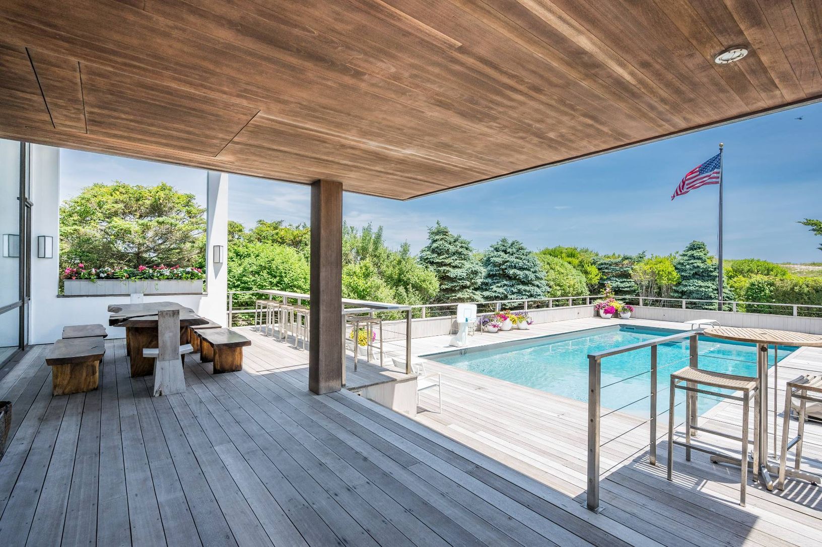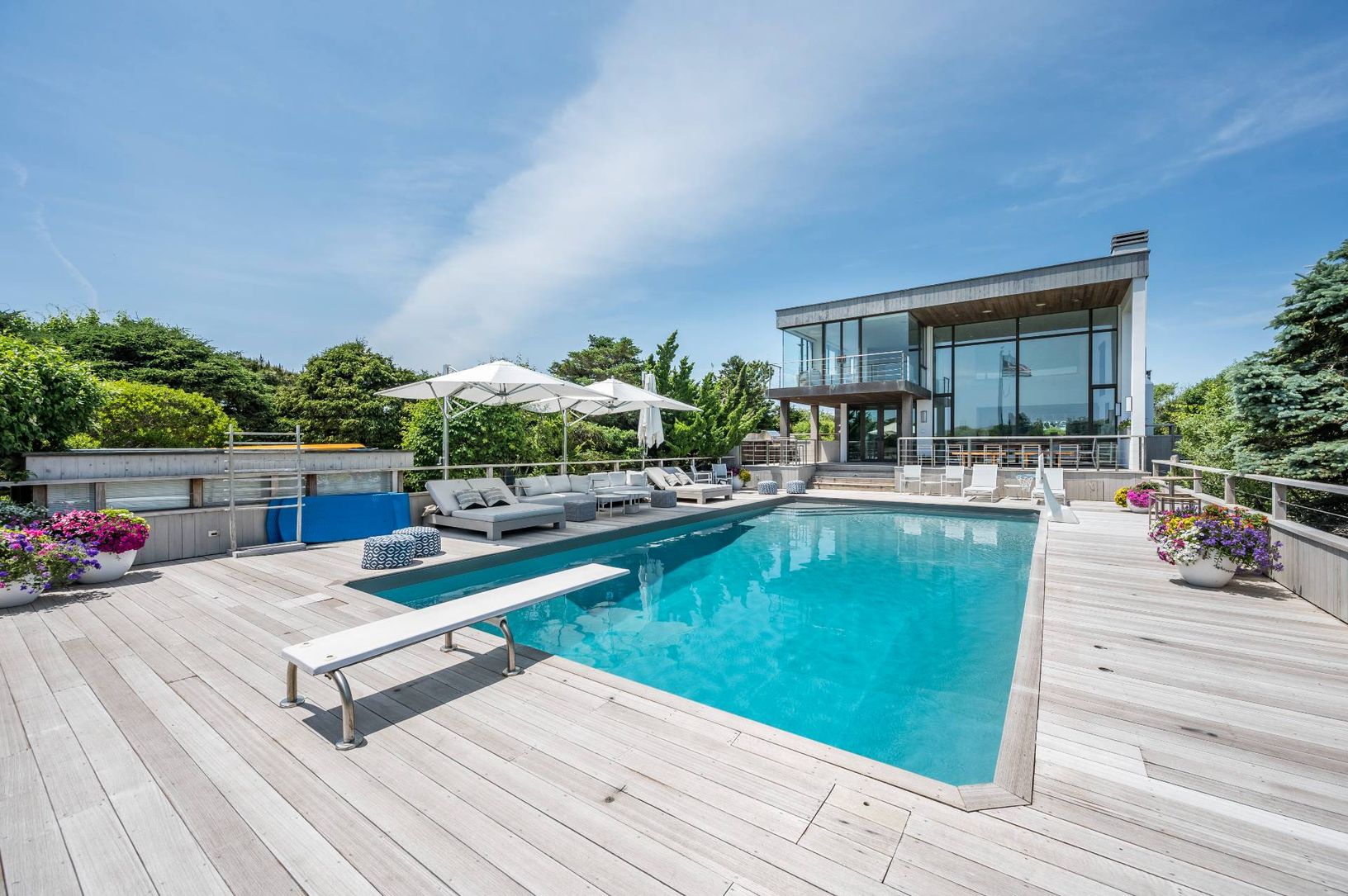 This renovated two-story contemporary house is nestled in the ocean dunes on 3/4 of an acre, with unobstructed views of the ocean and access across the street. Living room with fireplace; family room; dining room; kitchen; second floor glass surrounded den; five bedrooms, four baths and a powder room complete the interior. Additional amenities include extensive decking, swimming pool, bocce court; basketball court and incredible water views.