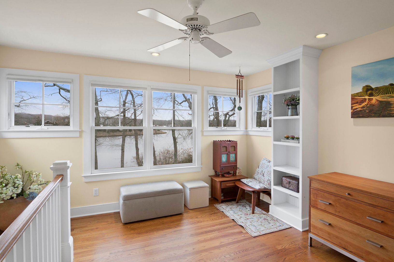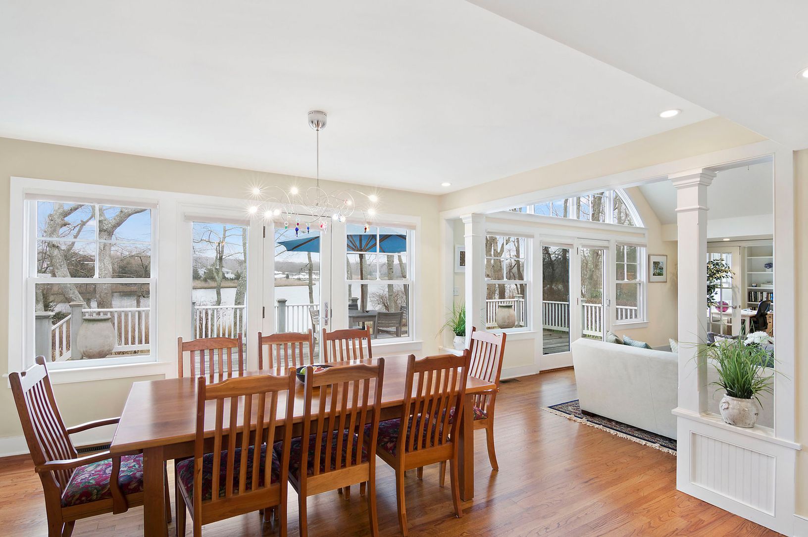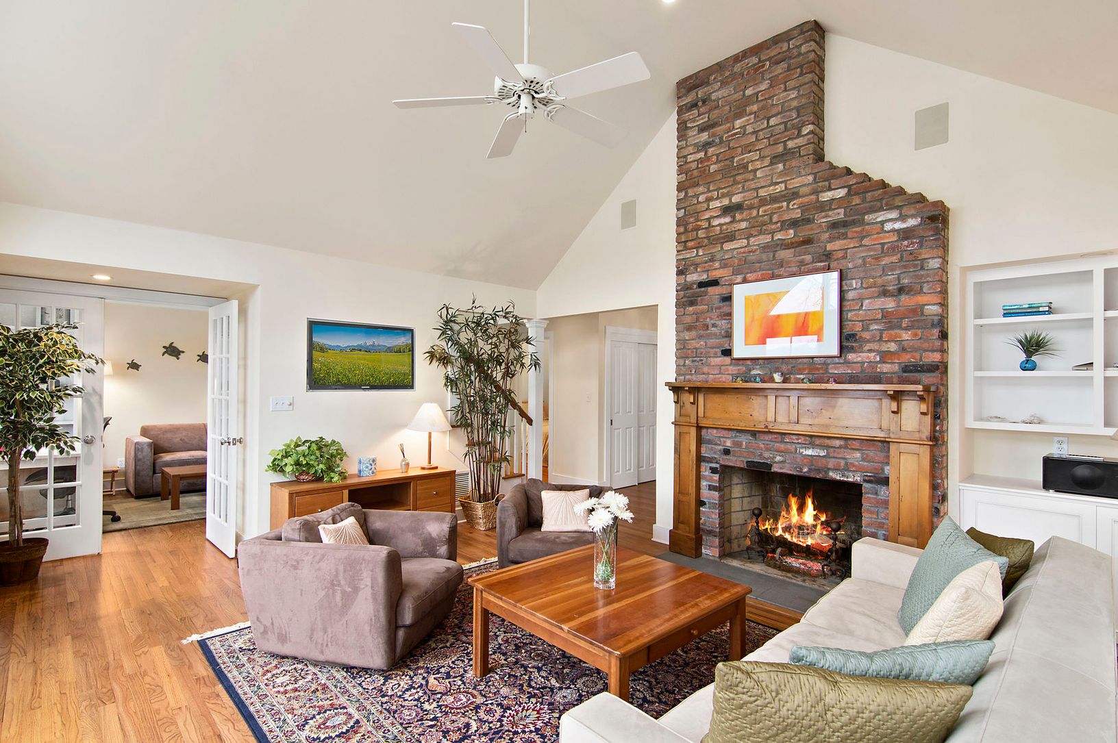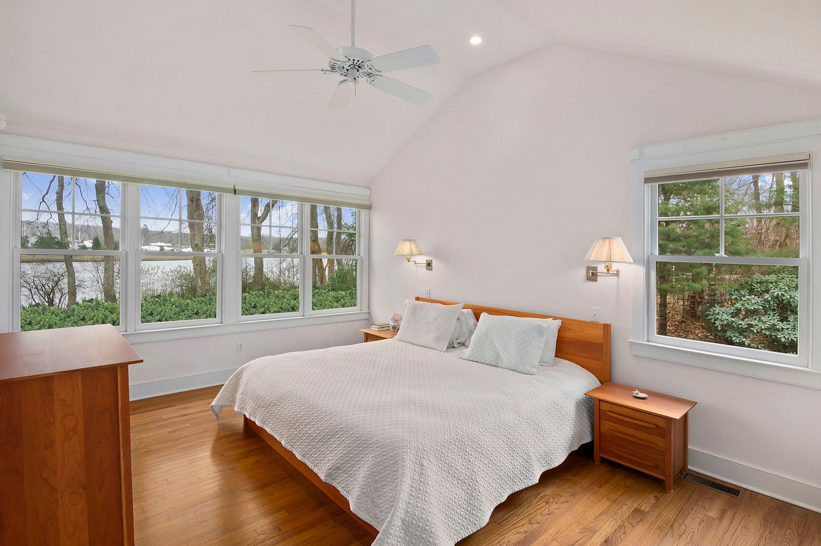 This warm and welcoming harbor front home strikes a perfect balance with every desirable amenity. Beautifully renovated and meticulously cared for, the 2,000+/- sq. ft. floor plan offers three well-sited bedrooms, three and one-half bathrooms, an open great room with a double height ceiling and fireplace, a den (which could also serve as a fourth bedroom), and office. The eat-in kitchen has a pizza oven and adjoining dining room, and skylights