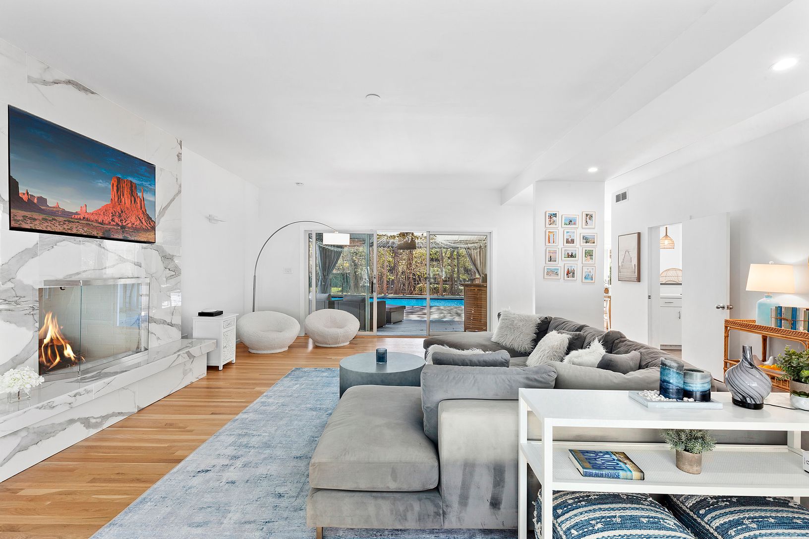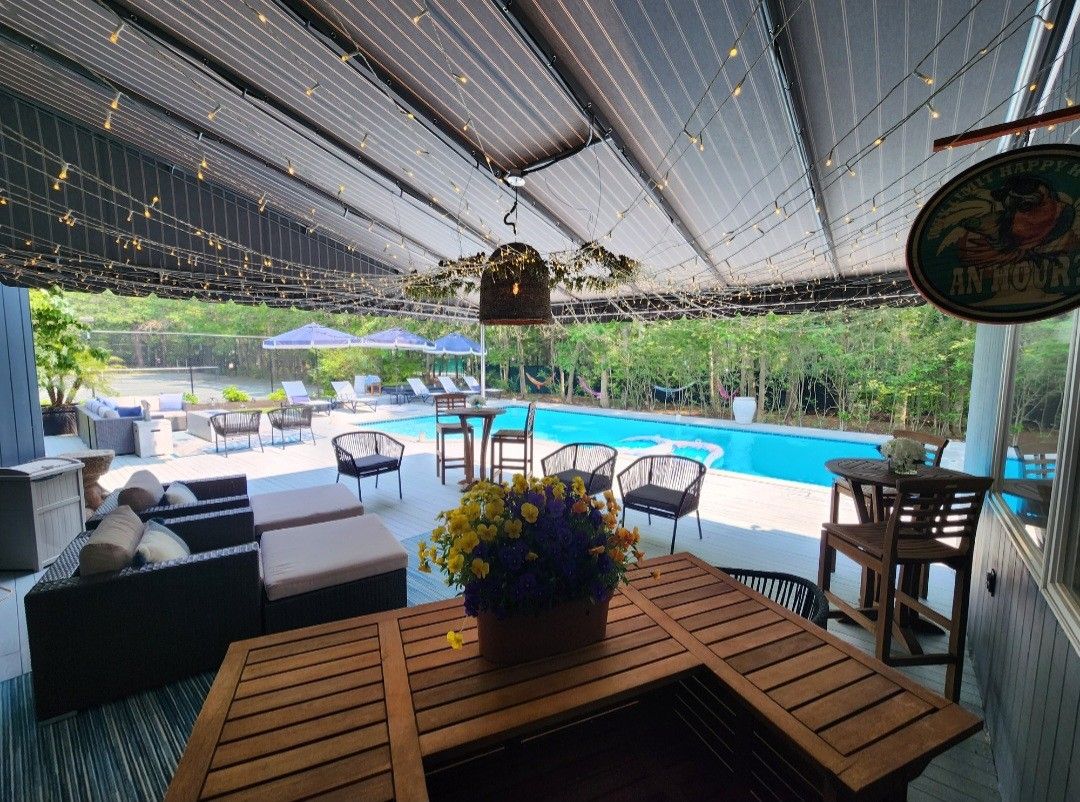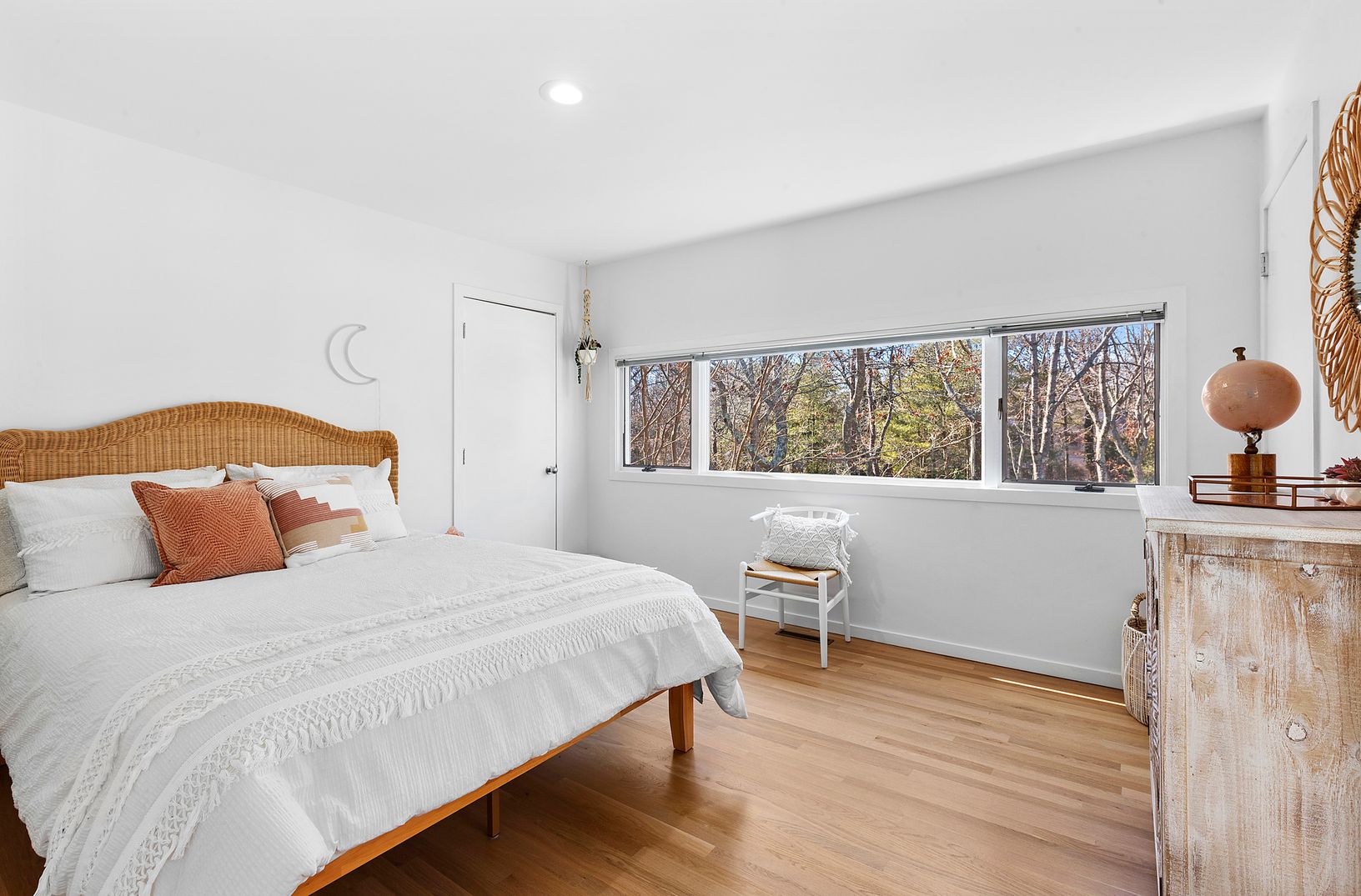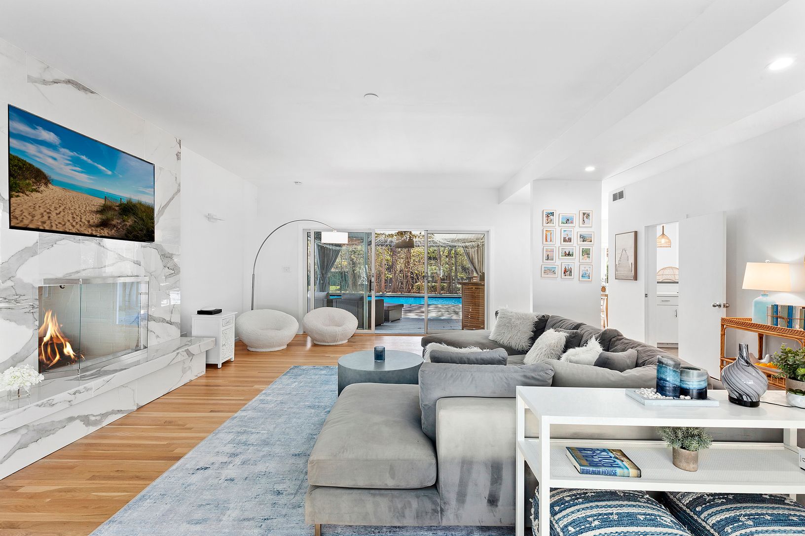 Indulge in Hamptons living at this exquisite contemporary residence nestled on over an acre of secluded grounds in Quogue. This chic designer-styled home beckons you to savor the summer in unparalleled comfort. The first floor unveils an expansive open layout, complemented by a stylishly appointed bedroom with an adjoining bathroom. Ascend to the second level, where three generously sized bedrooms, a hall bathroom, and a master suite await. Th