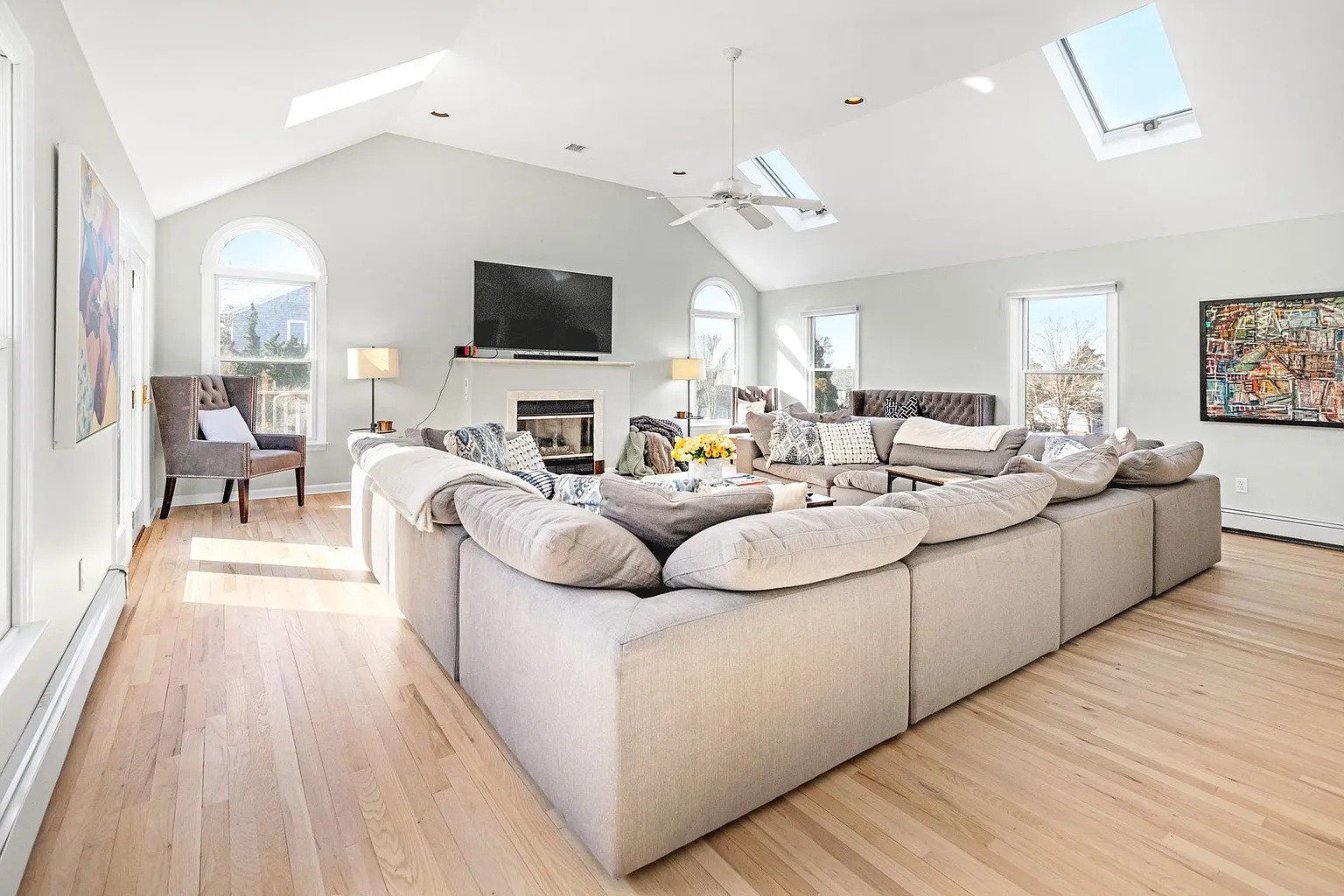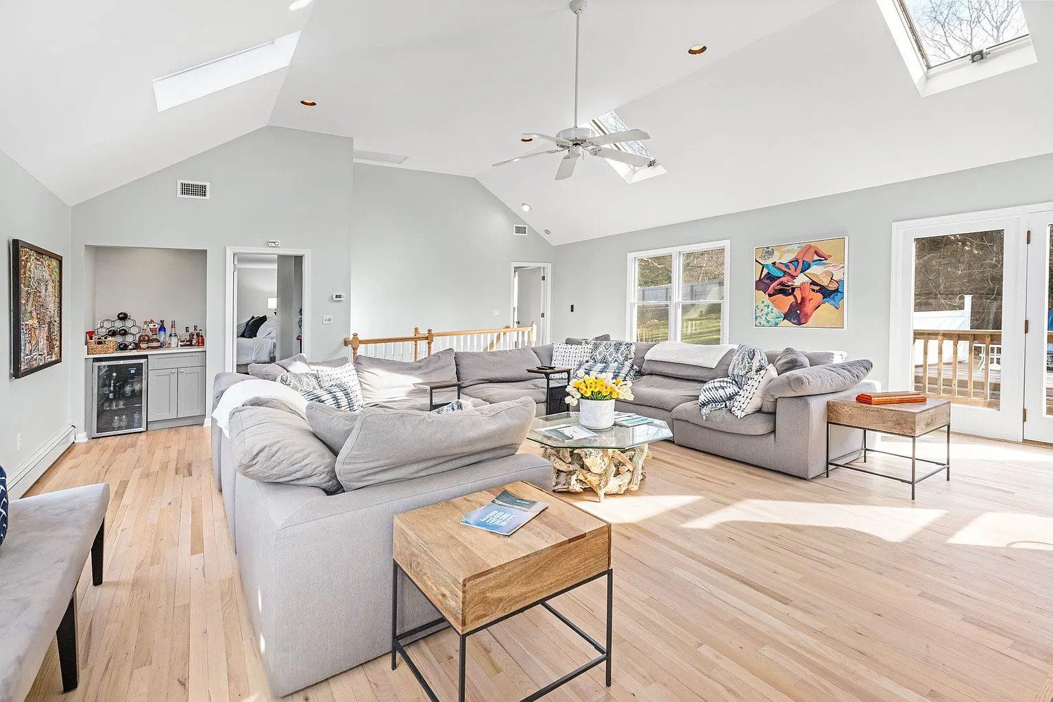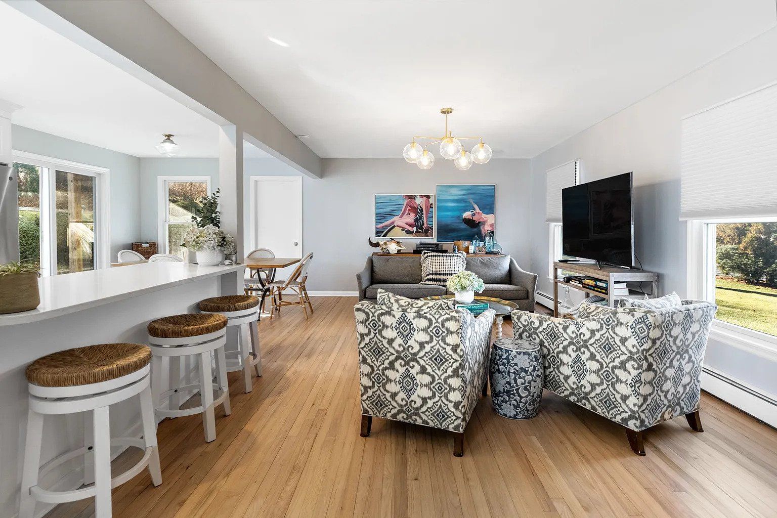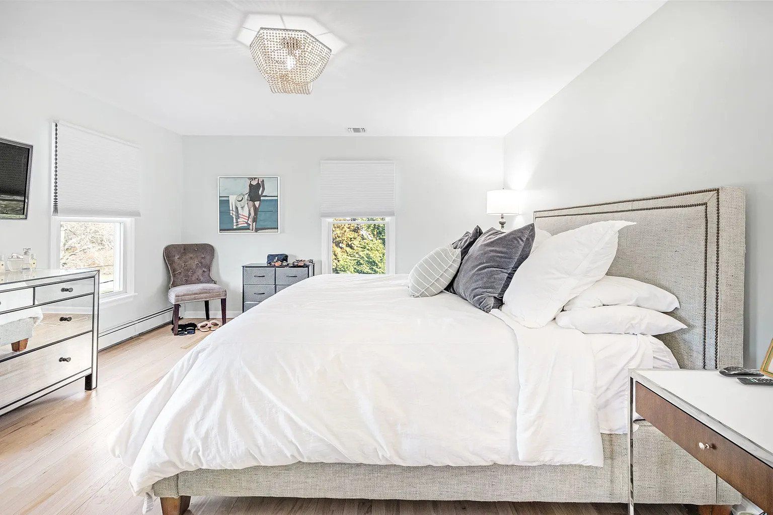 Serene, luxurious Hamptons living awaits you this summer. Step into this beautifully renovated Southampton home, where an open and sunlit floor plan seamlessly connects the brand-new eat-in kitchen with island, dining area, and living room. The main level features a spacious master suite with sliding glass doors to the backyard, a guest bedroom, full bathroom, and convenient laundry. Upstairs, a stunning great room offers vaulted ceilings, a f
