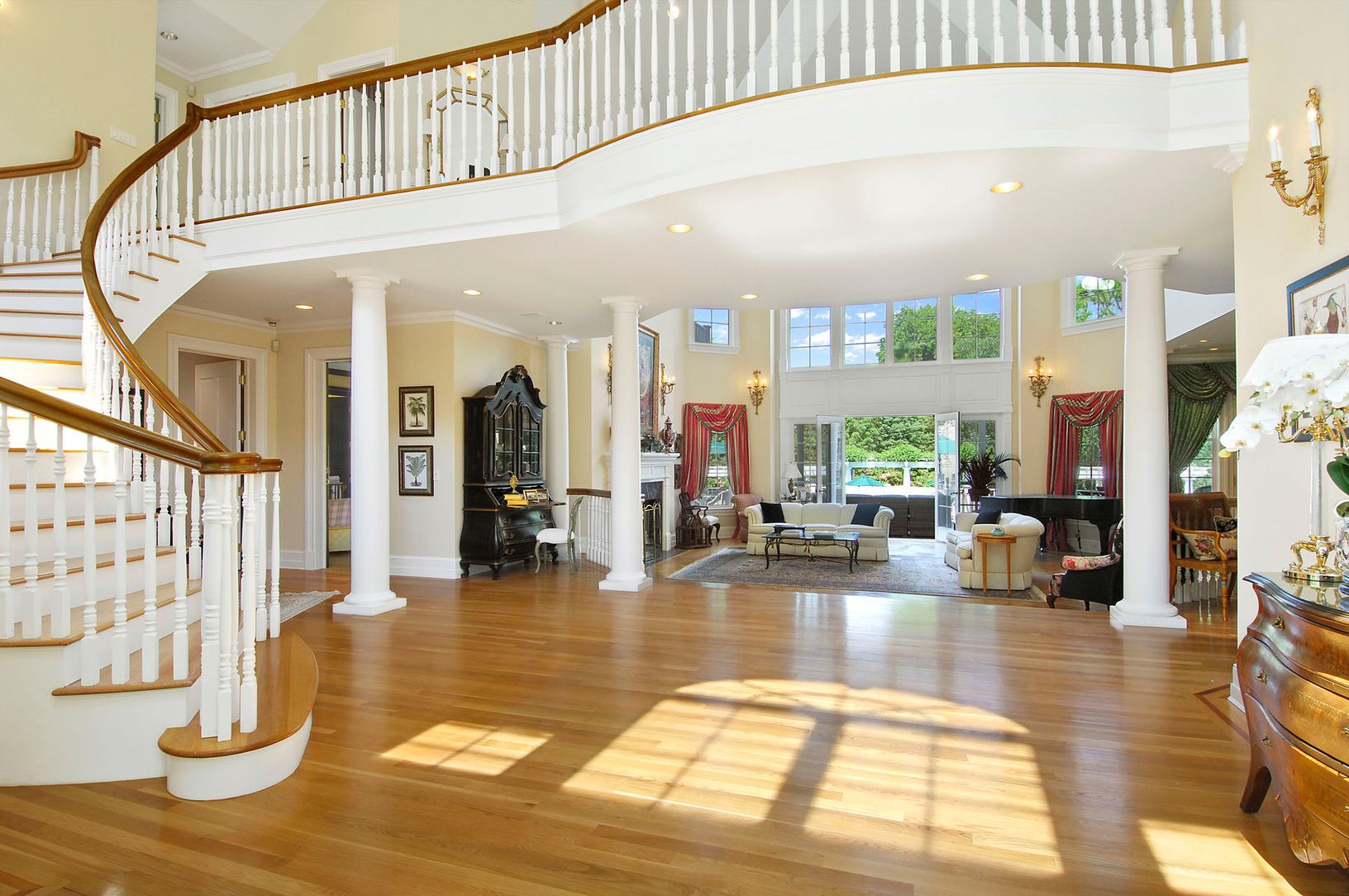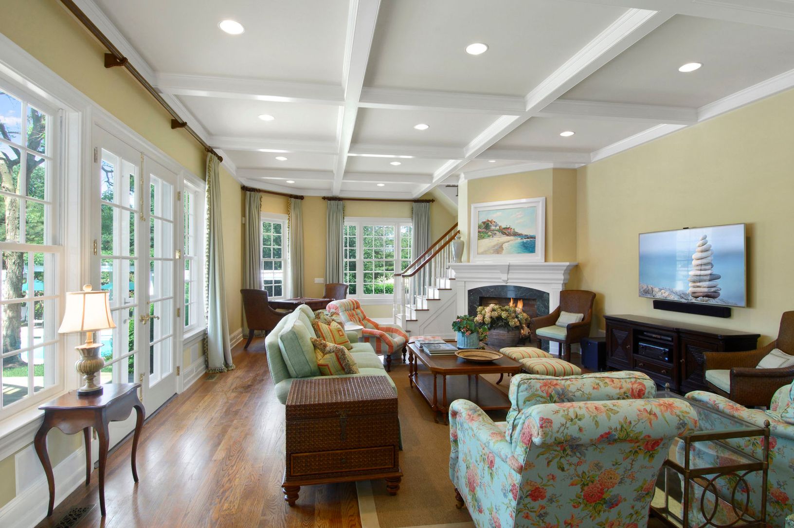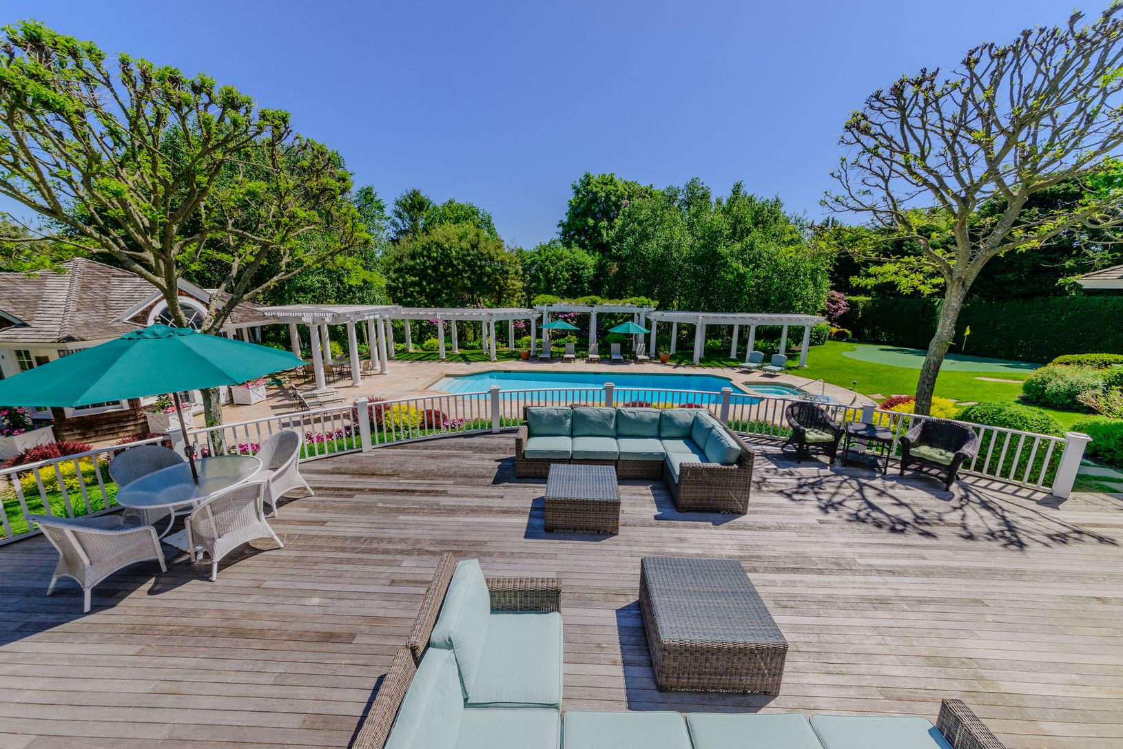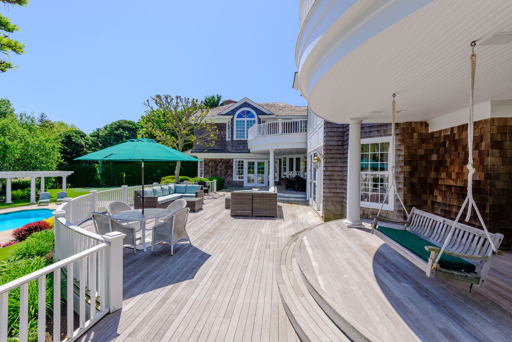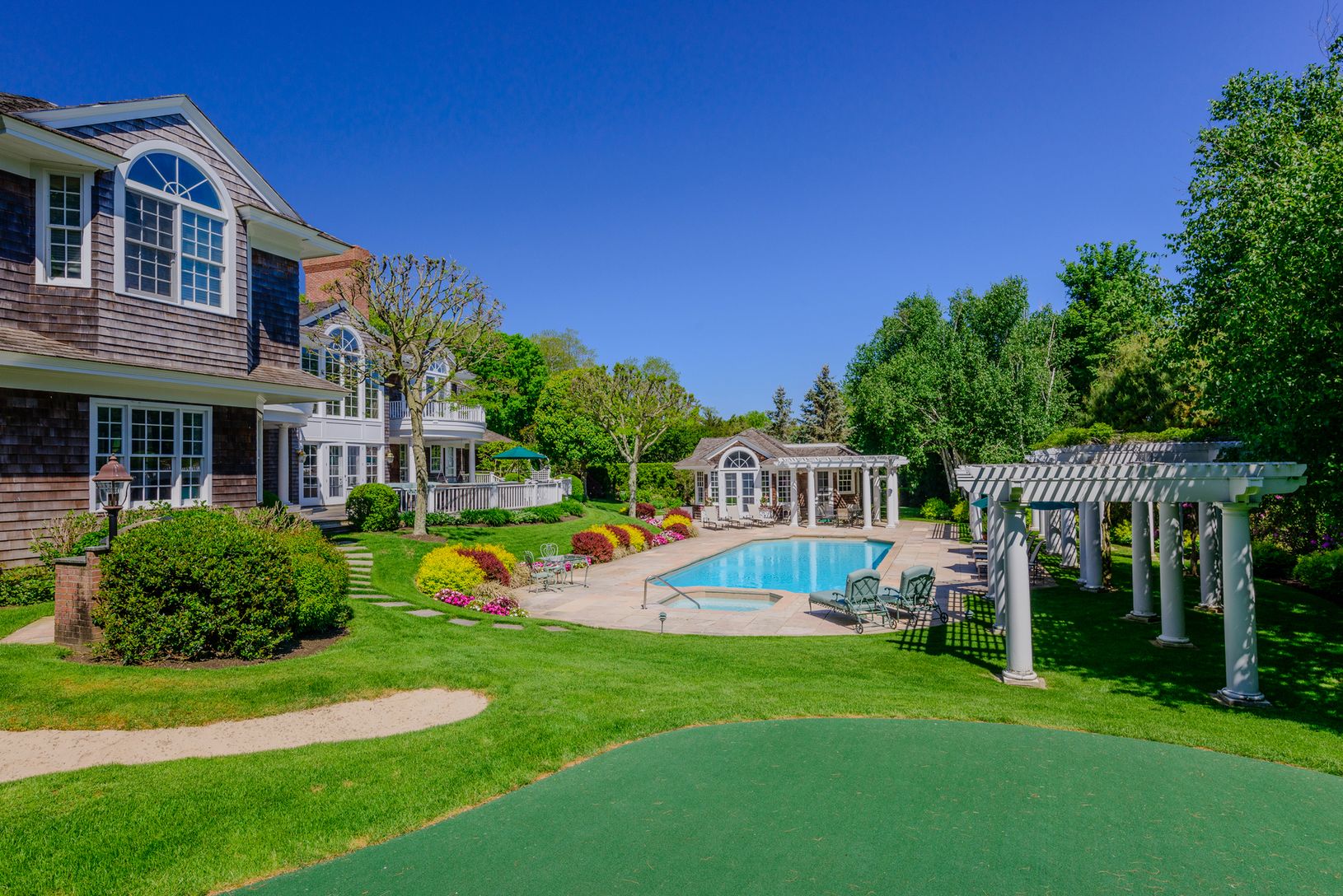 Located on one of the prettiest streets in Southampton this substantial and comfortable home will please the most astute buyer. On 1.9 acres this country estate is in very close proximity to the beach and the village and its established gardens and trees offer a beautiful and private outdoor environment. The 10,600 sq ft main house features a large and elegant Living room with vaulted ceilings, a fireplace and glass doors to the deck, a formal