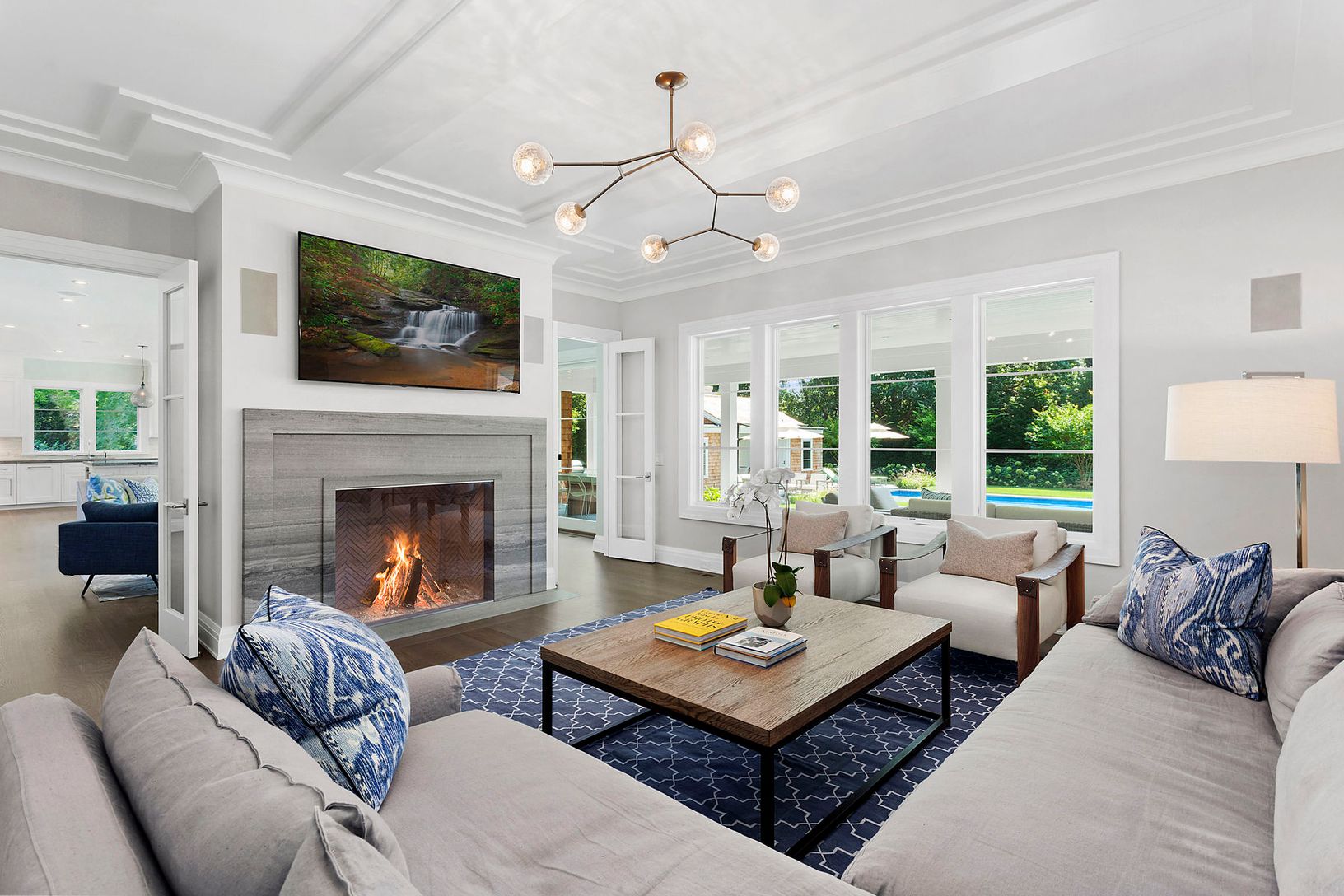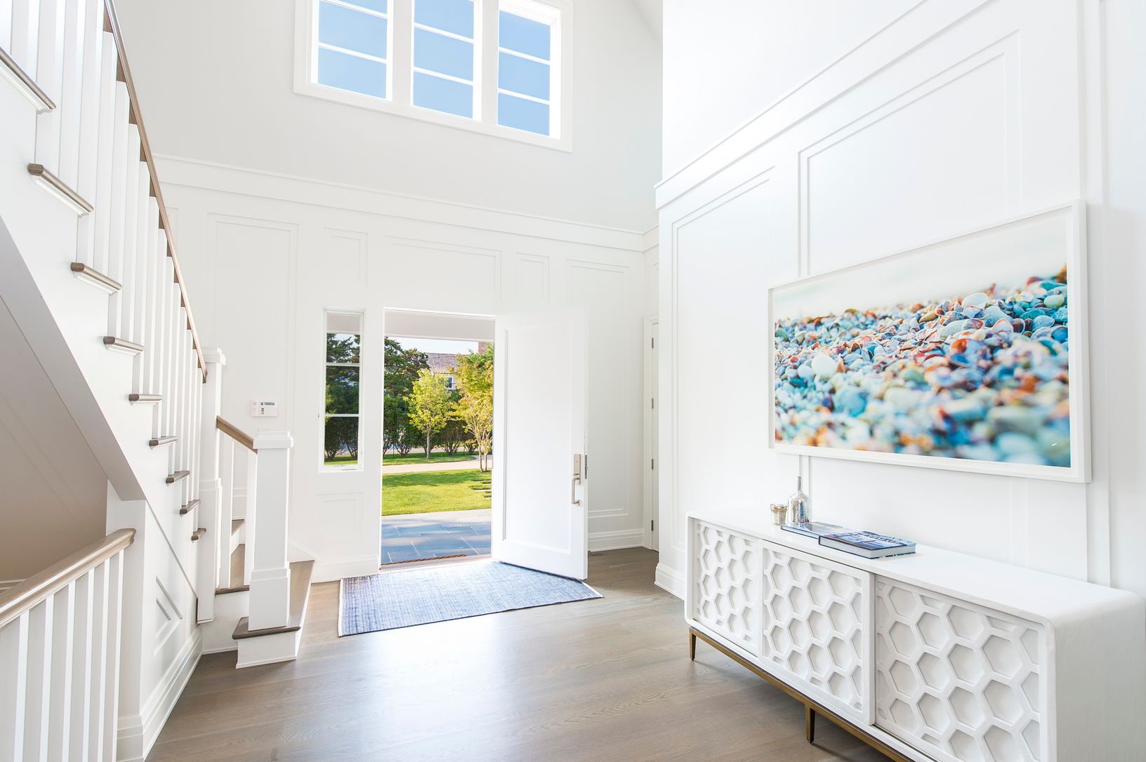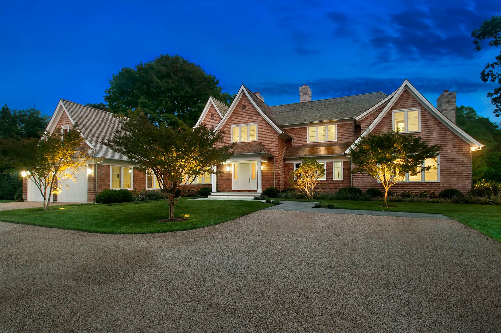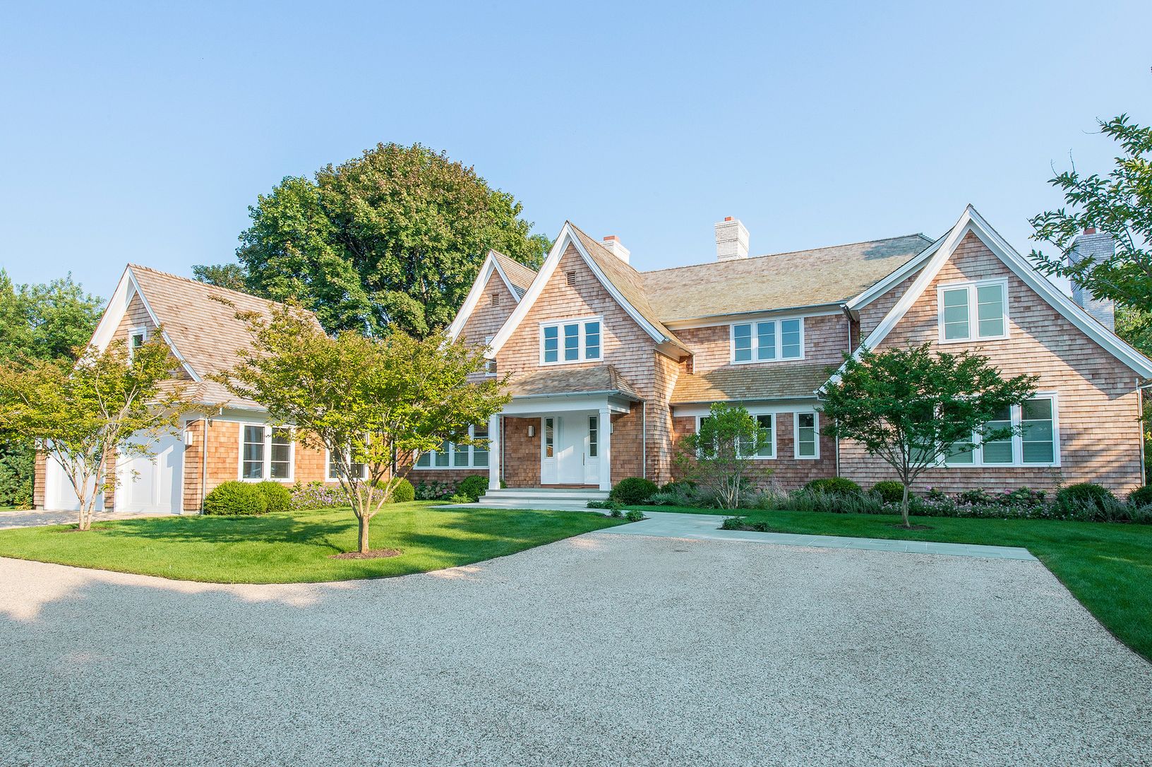 Spectacular new modern construction built to the highest standard sited on a private gated acre in the heart of Georgica. The 8600+/- sq. ft. interior features 10' ceilings throughout, custom profile moldings and paneling, sculptural contemporary lighting and wide plank select oak stained floors. Beyond the striking double-height entry the open floorplan features 2 living spaces each with fireplace and connecting 8' glass doors. A spacious