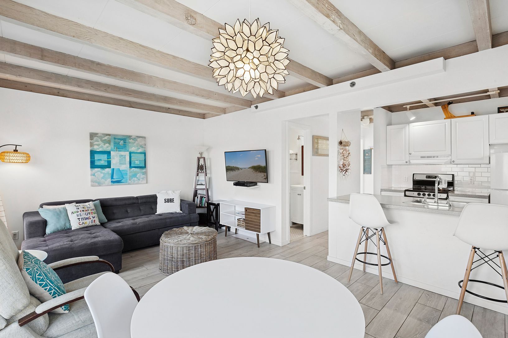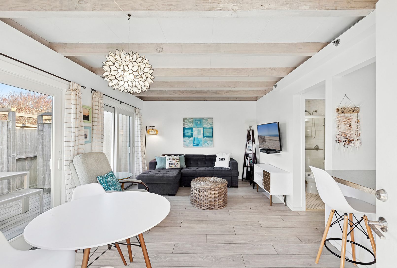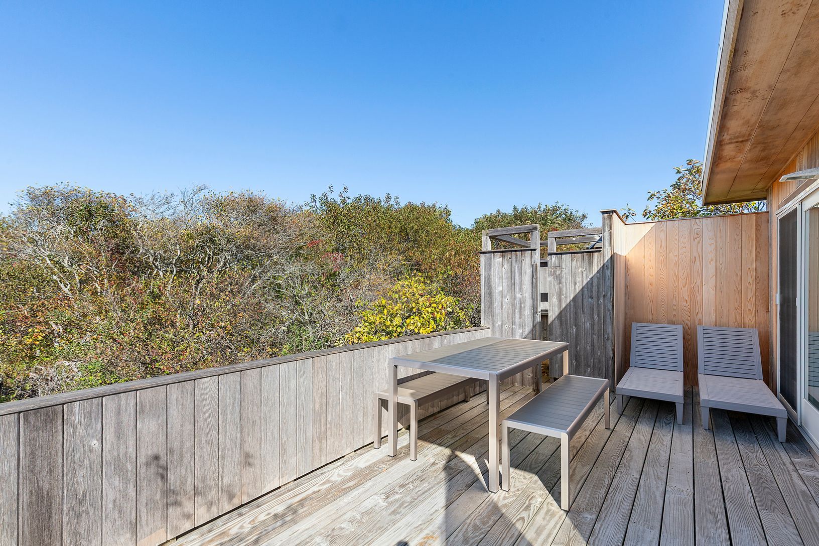 This unique unit boasts a spacious deck that wraps around the side and back, perfect for outdoor dining and relaxation, as well as an outdoor shower.