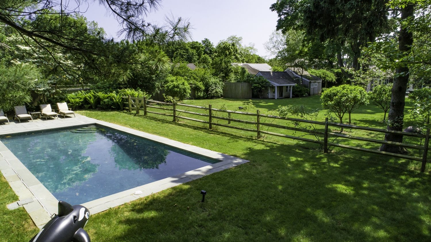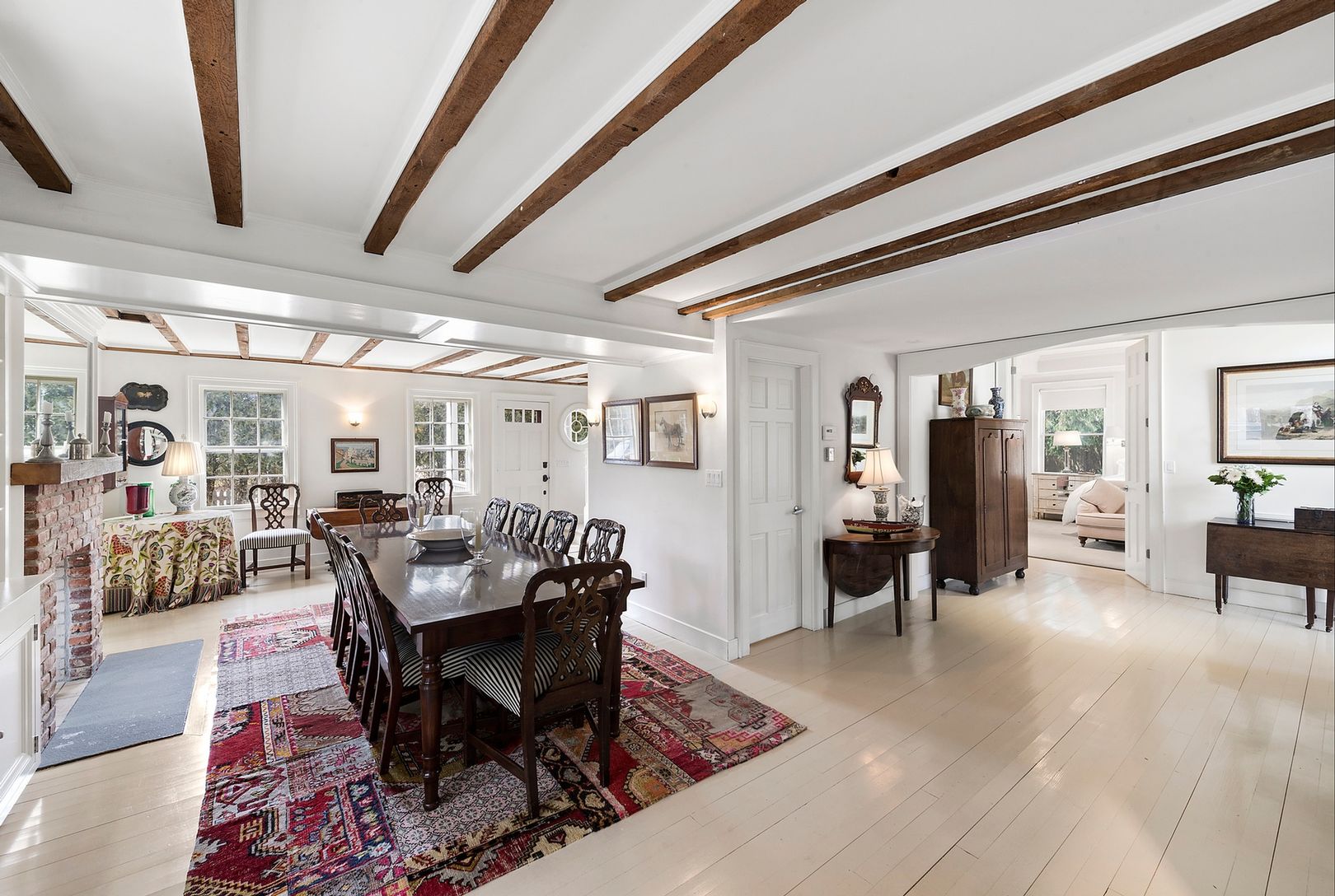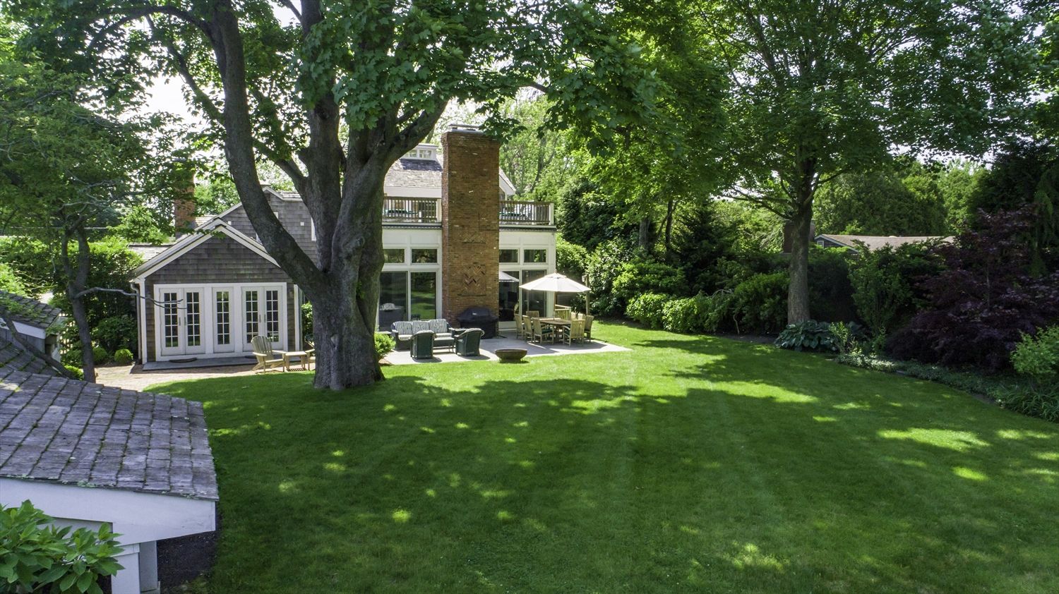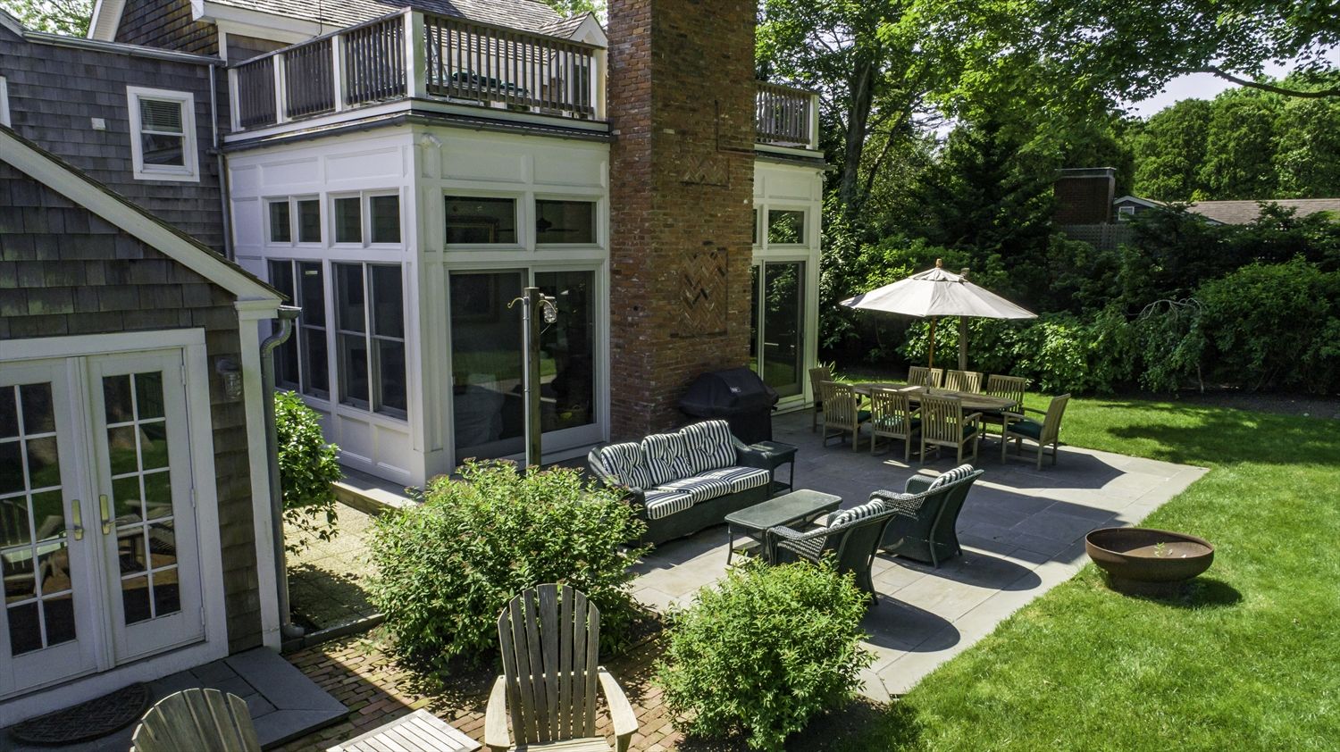 201 Lumber Lane, Bridgehampton, NY 11932 | A beautiful traditional village home has been renovated with 4 bedrooms, 4 Kohler baths, a large chef's kitchen featuring Viking appliances, formal dining room with convenient double sided gas fireplace, a two-story great room surrounded with floor to ceiling windows and wood-burning fireplace. The lush backyard with flowering landscapes and enormous lawn features a heated Gunite pool, pool house wit