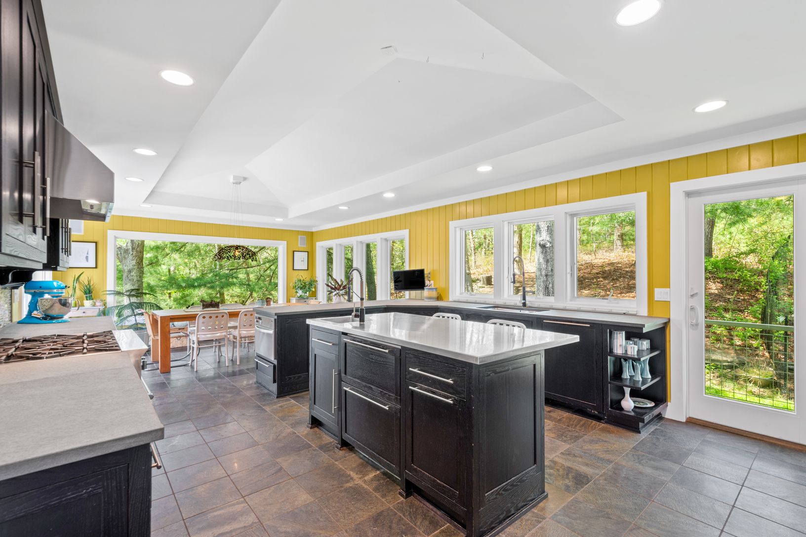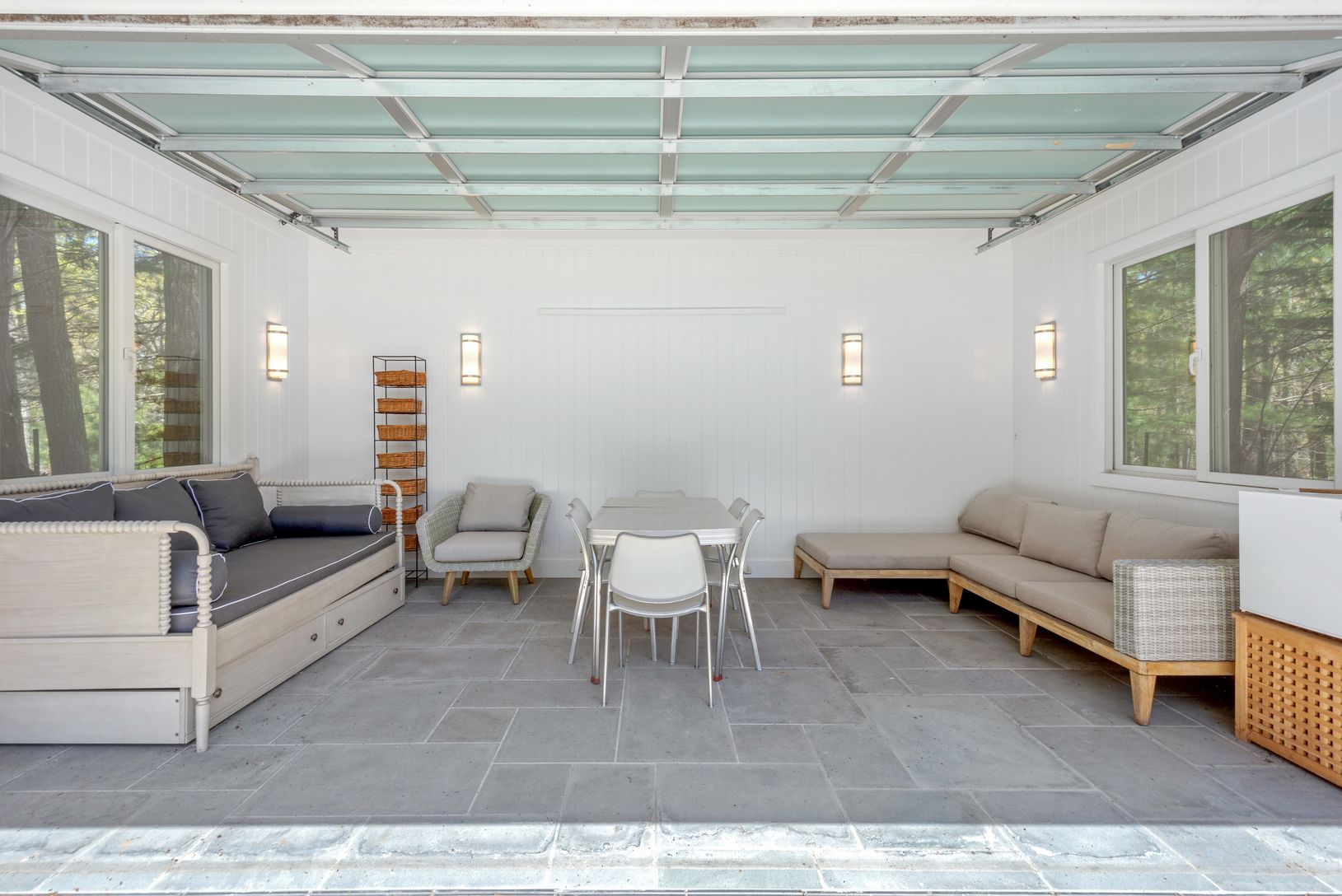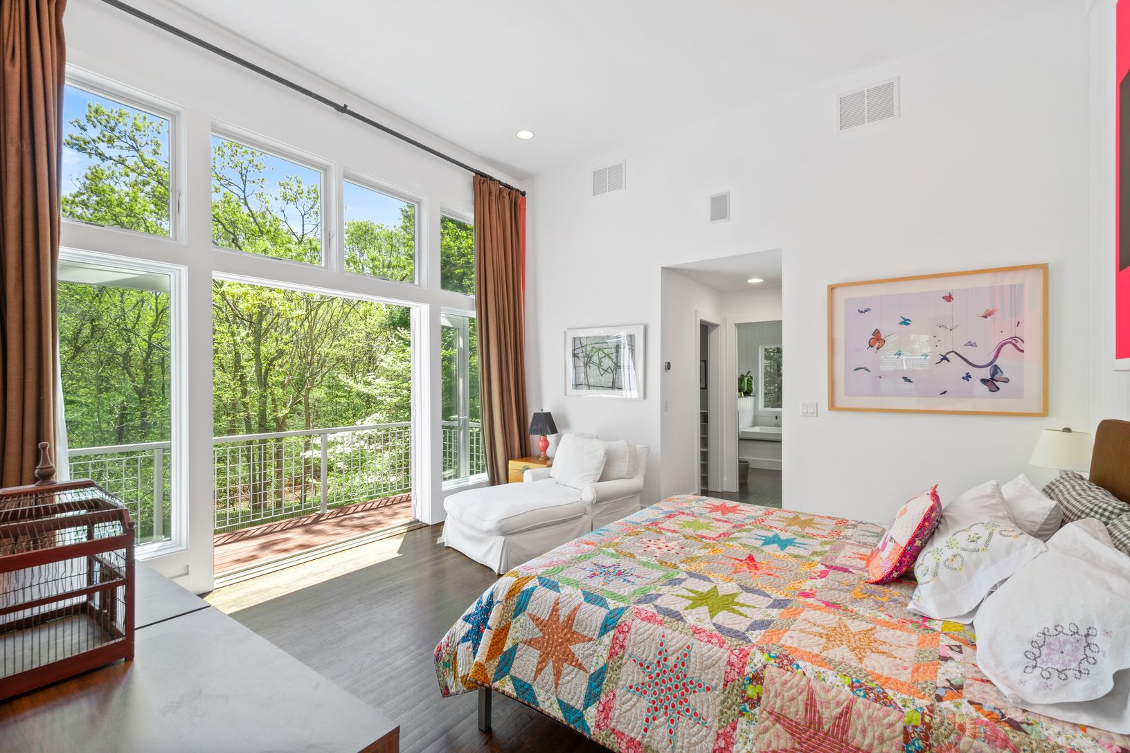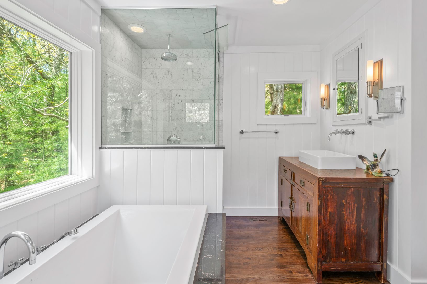 Tucked away down a picturesque drive, lined with whispering pines, lies a stately home that is private and elegant. This 4,000-square-foot residence, situated on a private 2.16 acres, is a hidden gem in the heart of East Hampton. Surrounded by mature trees and lush landscaping, this home is a sanctuary of tranquility. Meticulous attention to detail has been given to bring the lush green grounds into the interior, with large windows and doors i