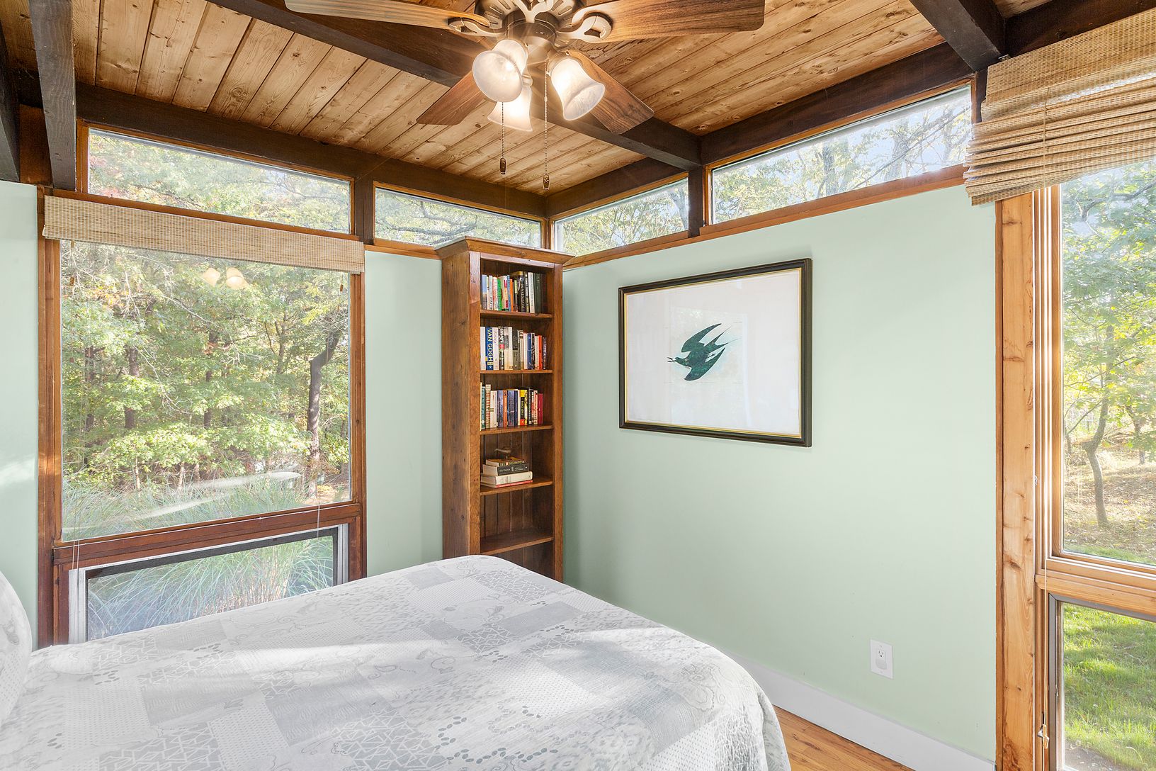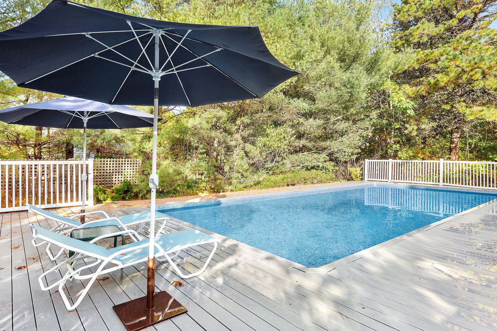 Down a long private driveway you will find this updated well maintained 3 bedroom, 2 bath contemporary with a heated pool. Open floor plan is noticeable upon entry. Recently renovated kitchen which opens to a large living and dining area with a fireplace. High arched A-frame ceilings with exposed beams, large glass windows and doors open to the rear patio and side with heated pool and outdoor shower. Second floor offers primary suite and den/