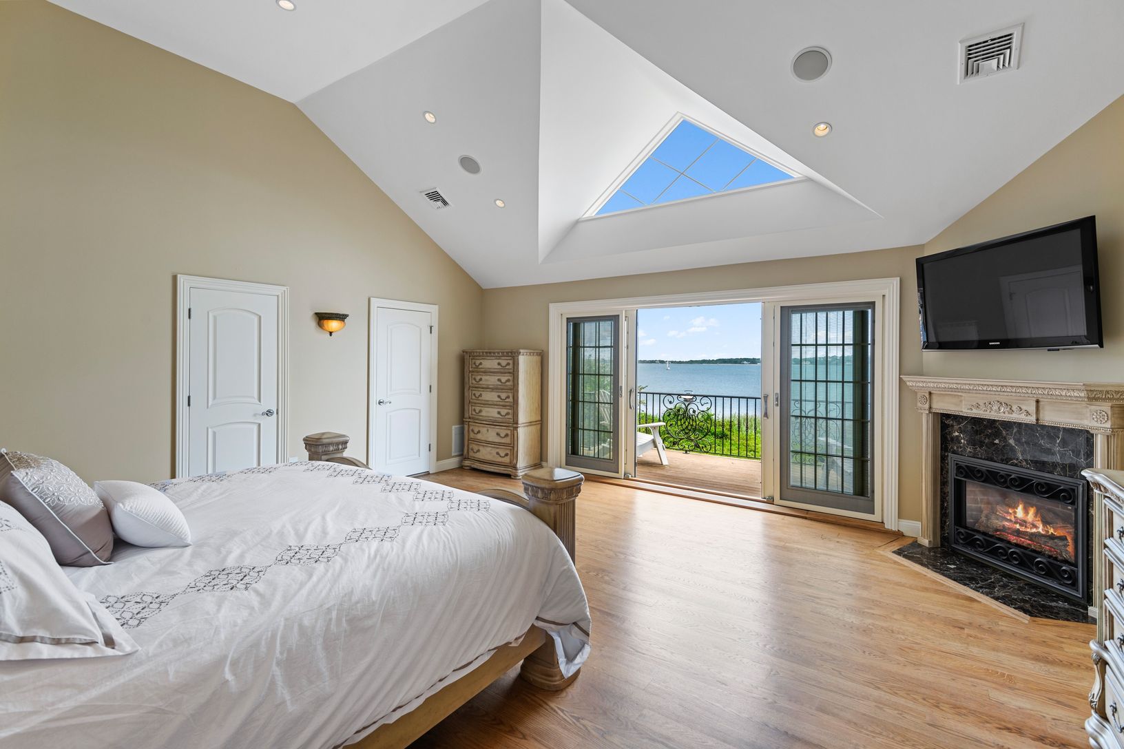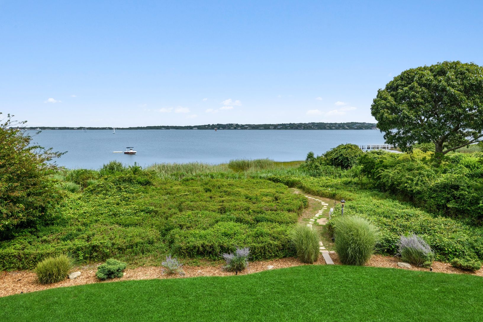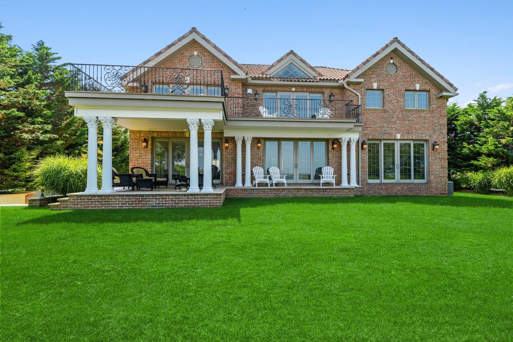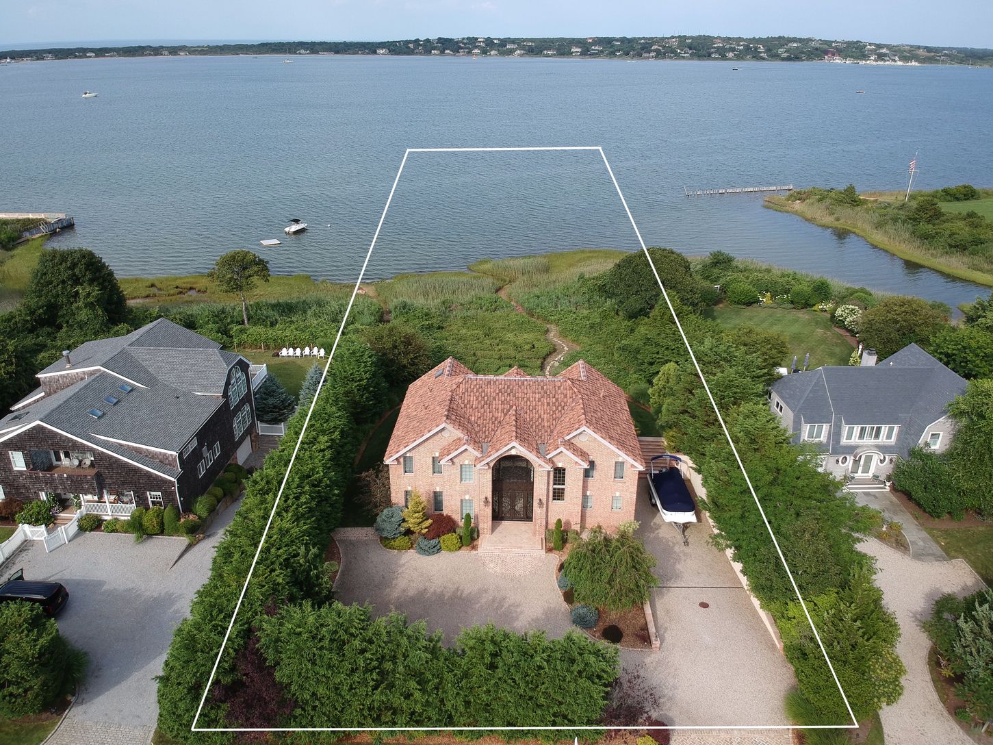 On the shores of Lake Montauk with sweeping views, this stately two story brick home is filled with old world elegance.The home offers five bedrooms and four and a half baths, with glorious water views from many rooms and outdoor terraces. Spacious living room and den with a double-sided gas fireplace, and sliding glass doors opening wide to water views. The eat-in gourmet kitchen features a marble-topped island with seating, extensive counter