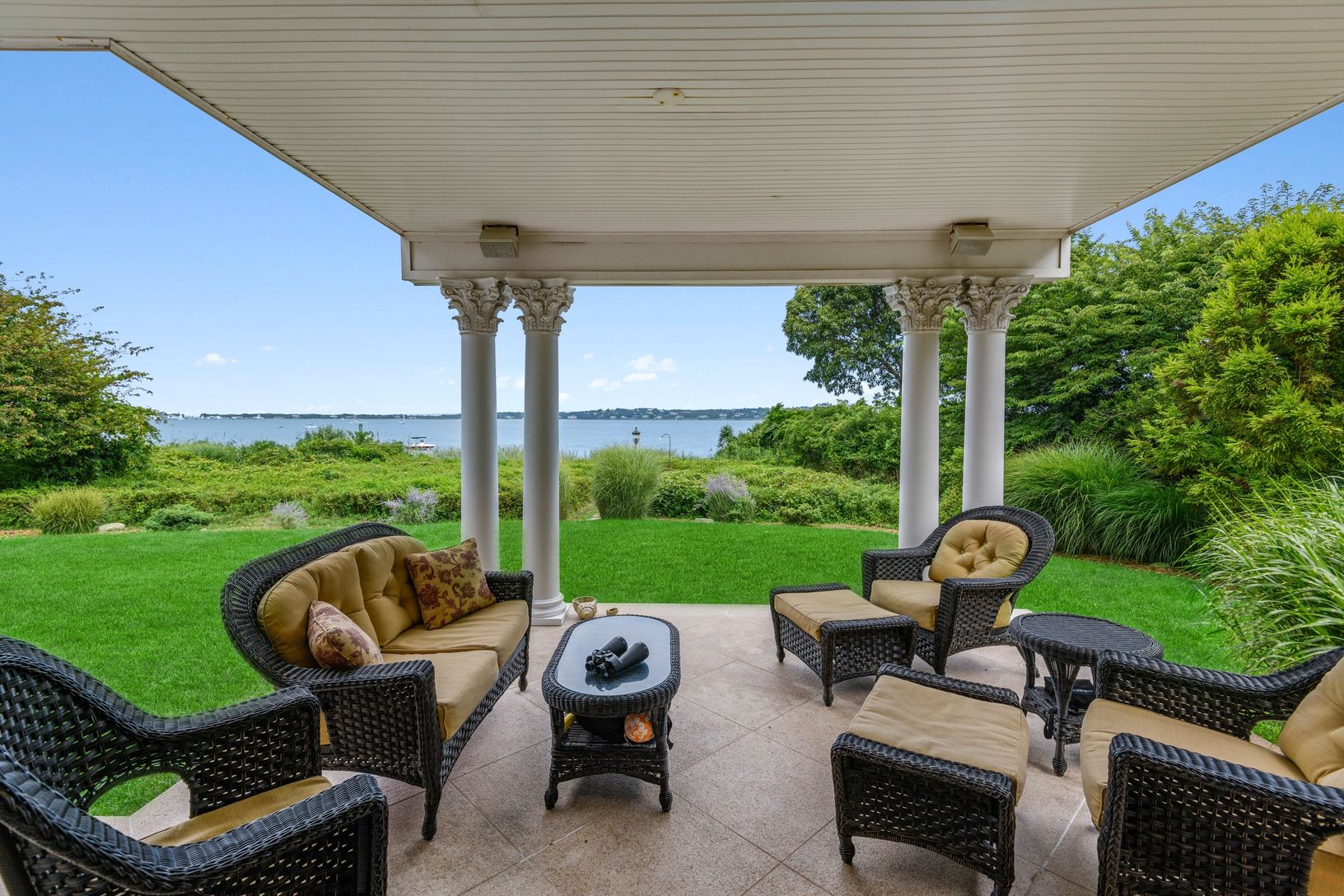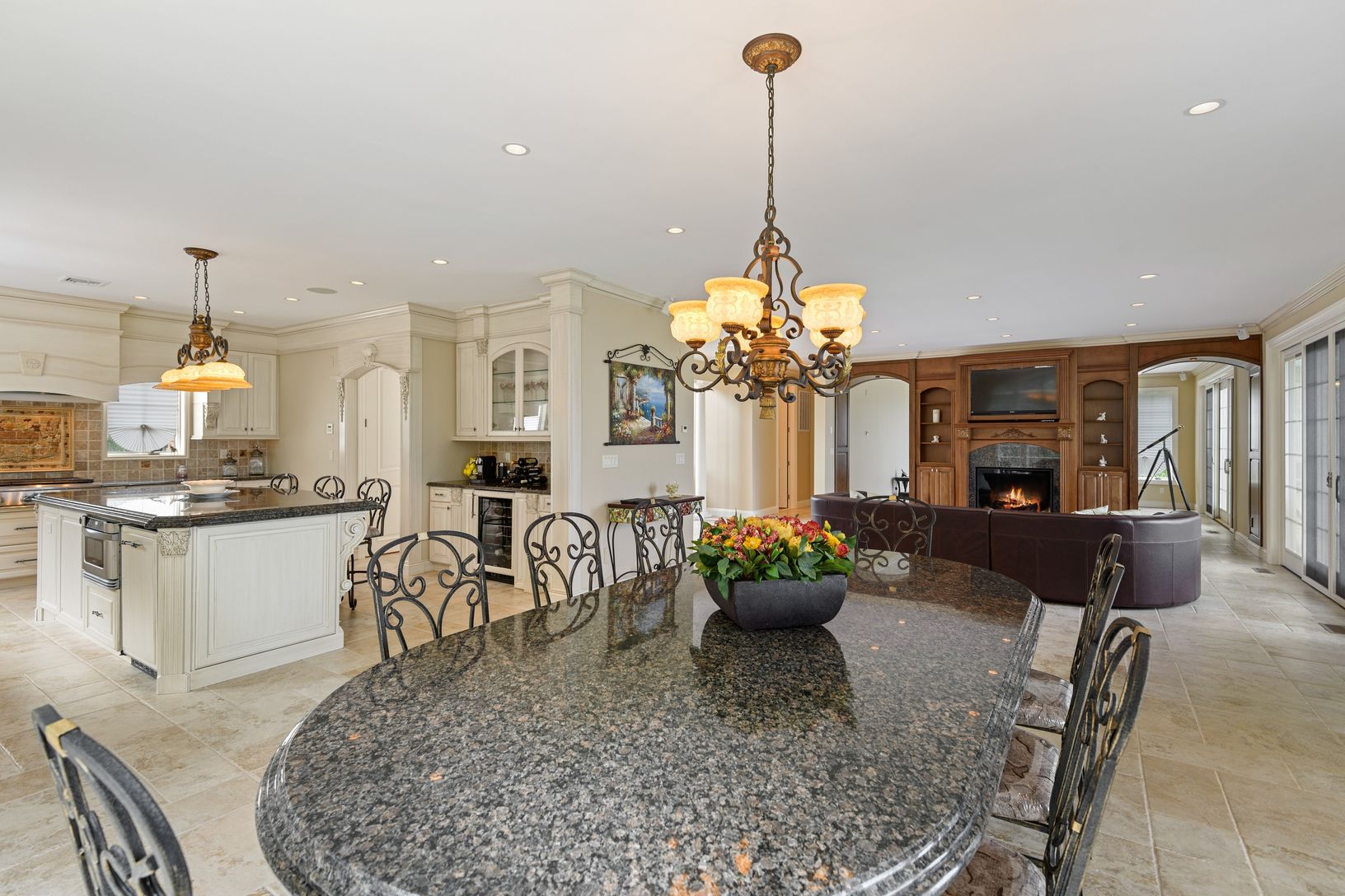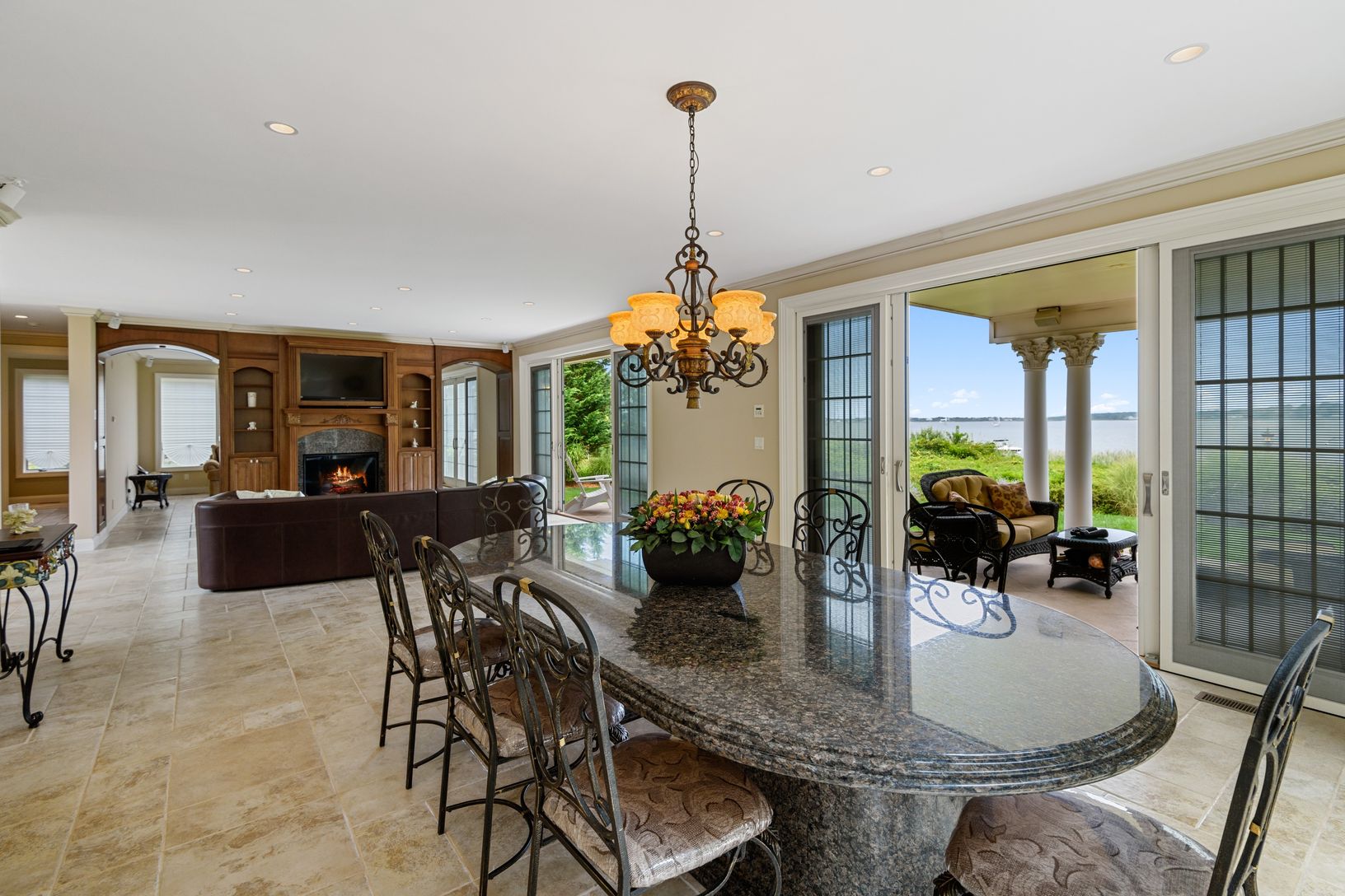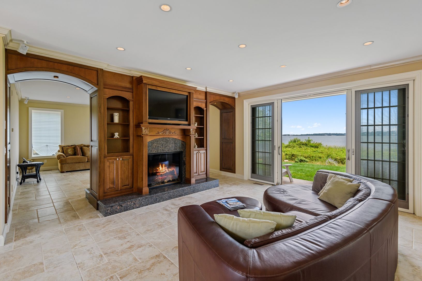 On the shores of Lake Montauk with sweeping views, this stately two story brick home is filled with old world elegance.The home offers five bedrooms and four and a half baths, with glorious water views from many rooms and outdoor terraces. Spacious living room and den with a double-sided gas fireplace, and sliding glass doors opening wide to water views. The eat-in gourmet kitchen features a marble-topped island with seating, extensive counter