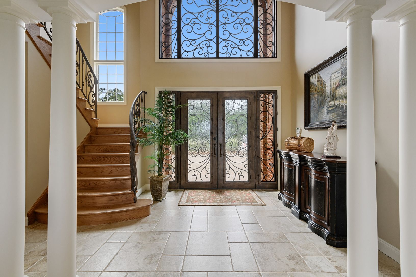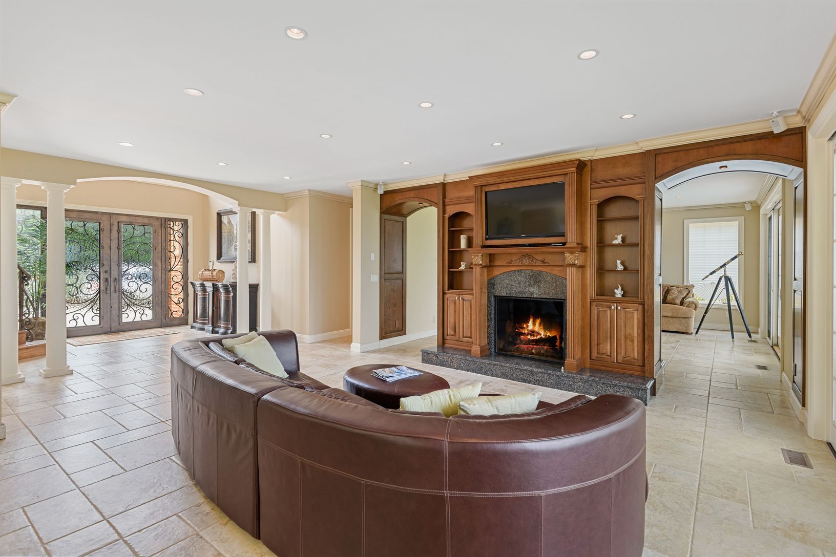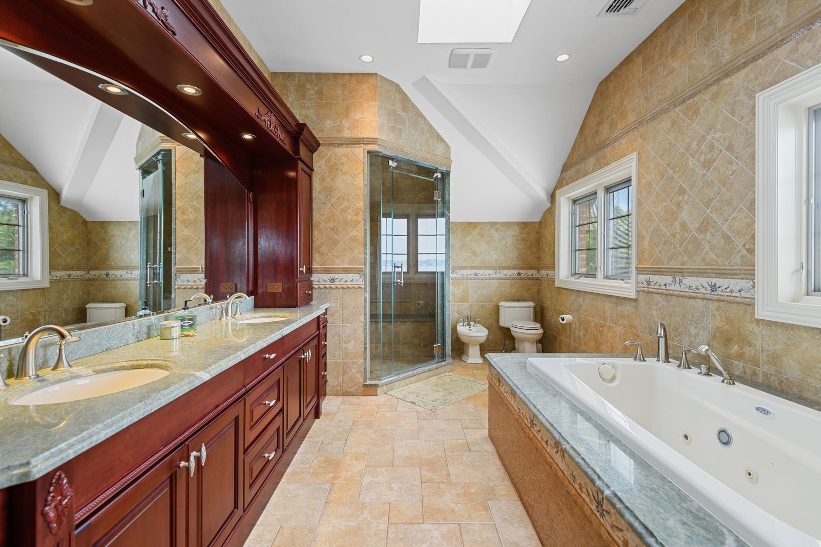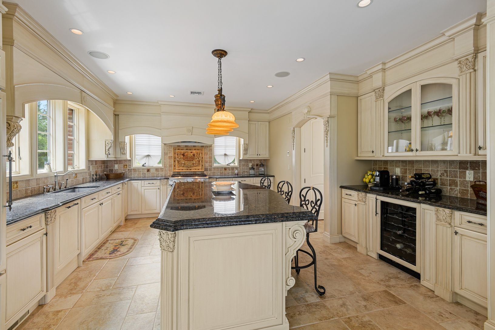 On the shores of Lake Montauk with sweeping views, this stately two story brick home is filled with old world elegance.The home offers five bedrooms and four and a half baths, with glorious water views from many rooms and outdoor terraces. Spacious living room and den with a double-sided gas fireplace, and sliding glass doors opening wide to water views. The eat-in gourmet kitchen features a marble-topped island with seating, extensive counter