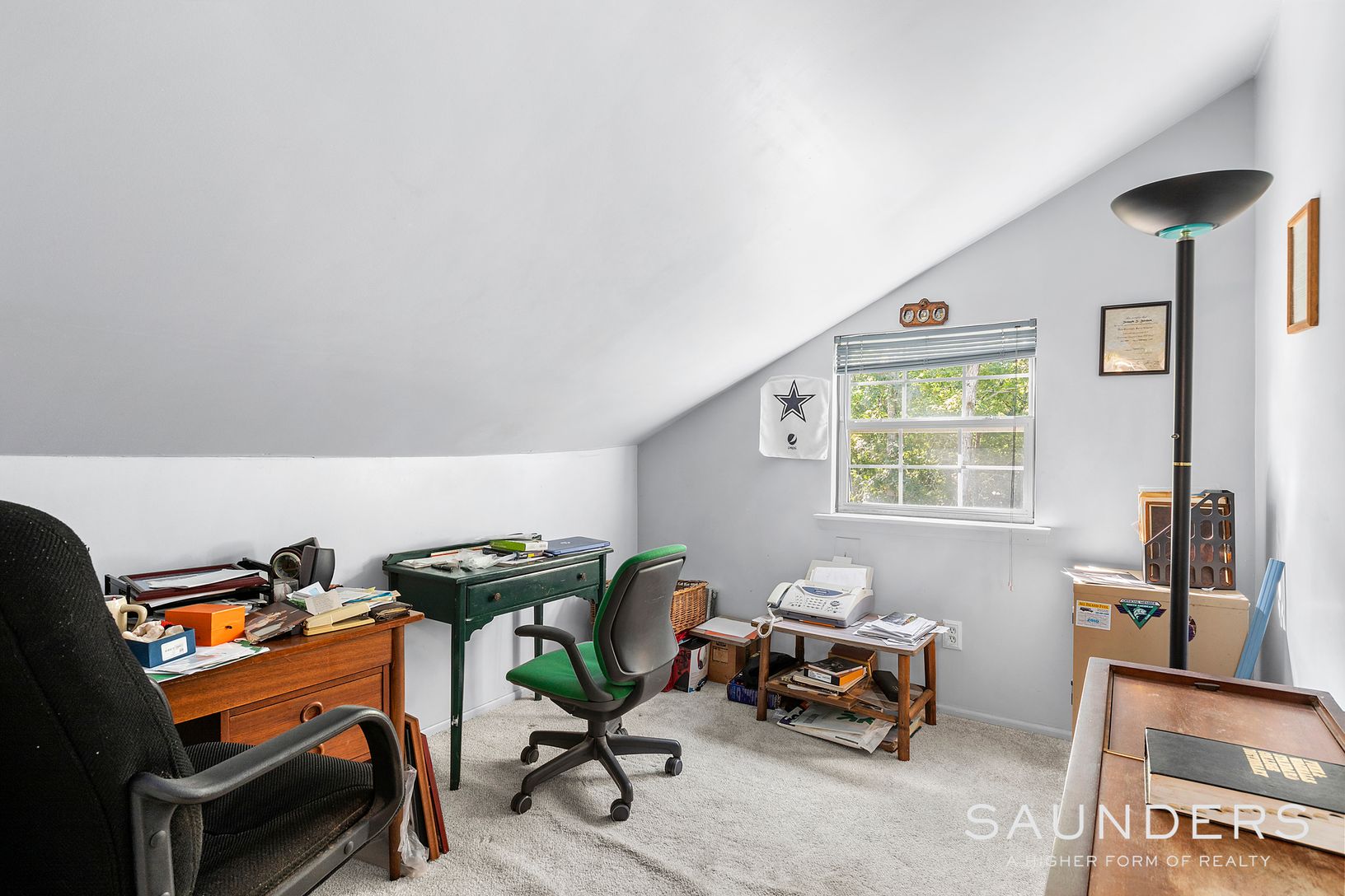 This newly listed south of the highway, 3 bedroom 3.5 bath home is situated on a private .51 acre parcel. The open concept first floor features a recently updated eat in kitchen with stainless steel appliances, a living room, powder room, and a dining room with sliding glass doors to the large cedar deck and yard. The second floor has a large primary ensuite bedroom, two guest bedrooms sharing a full bath and an additional office. The parti