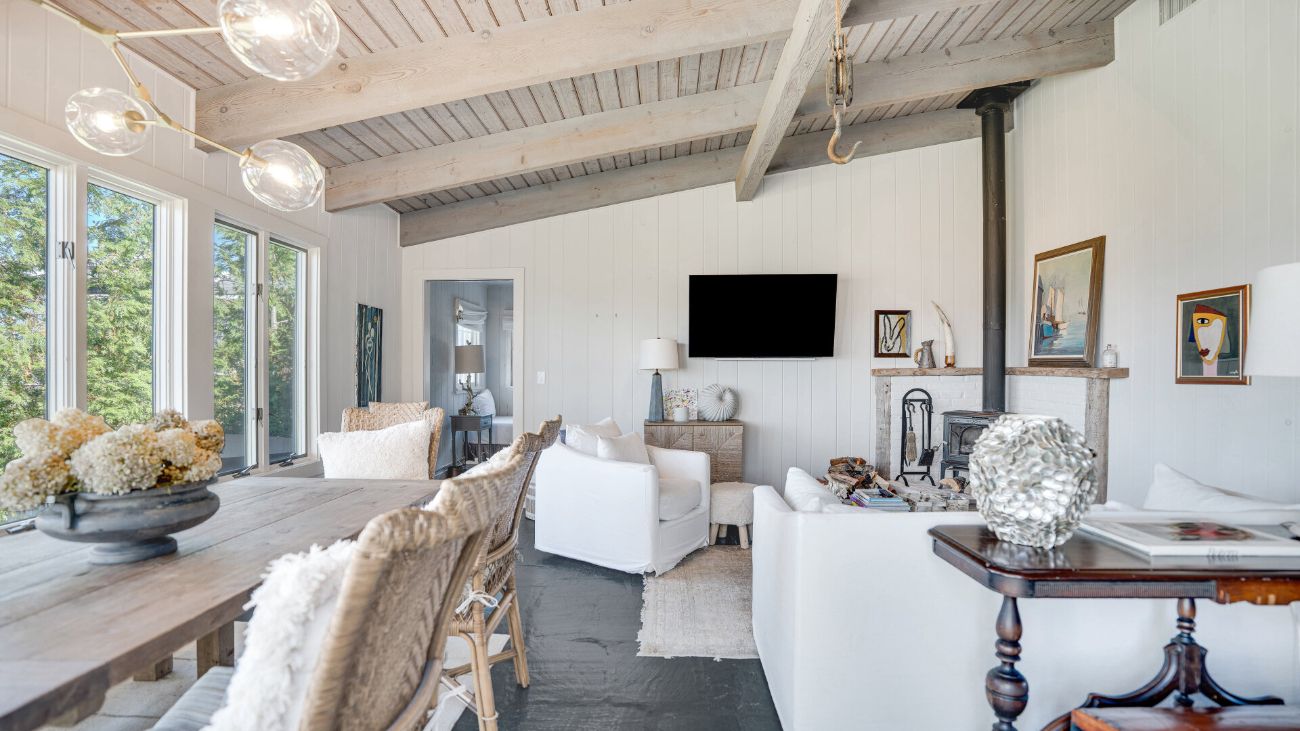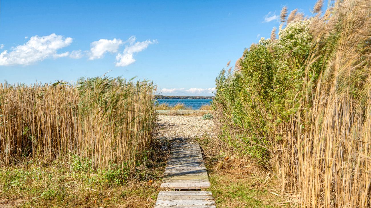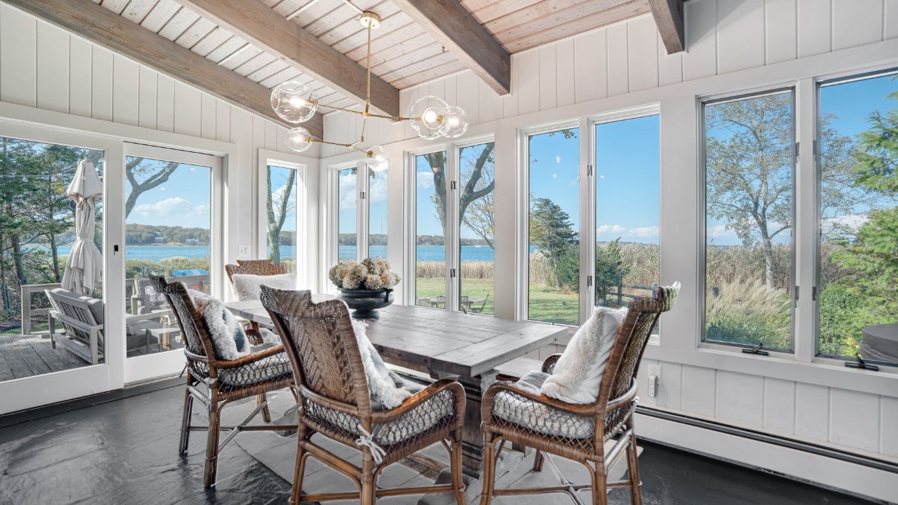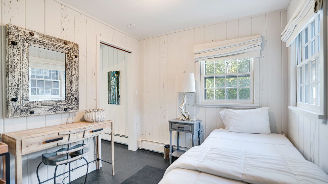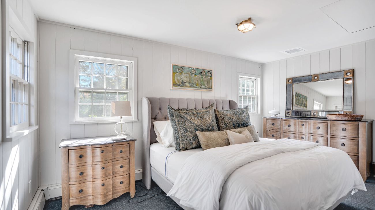 Nestled along a tranquil waterfront, this charming three-bedroom, one-bath cottage offers a refined East Hampton escape filled with character and comfort. Wrapped in classic wood-paneled walls and ceilings, the home evokes the timeless charm of a seaside retreat while delivering modern amenities and effortless style. Highlights in