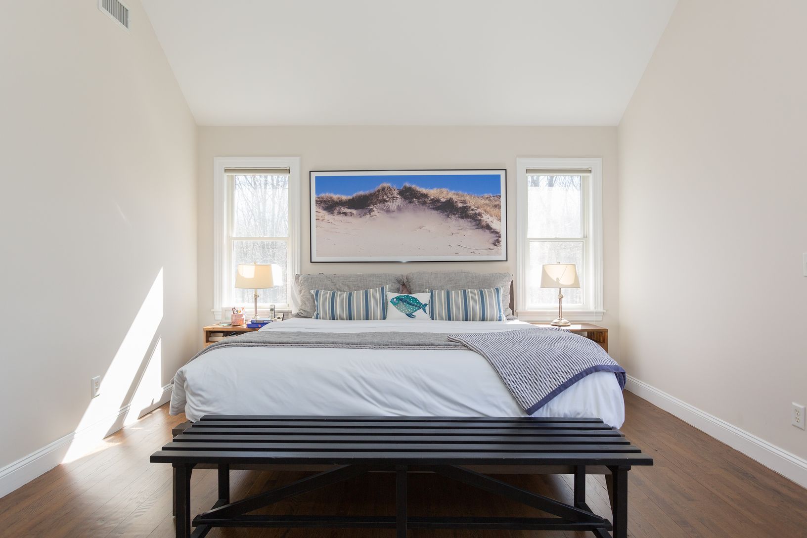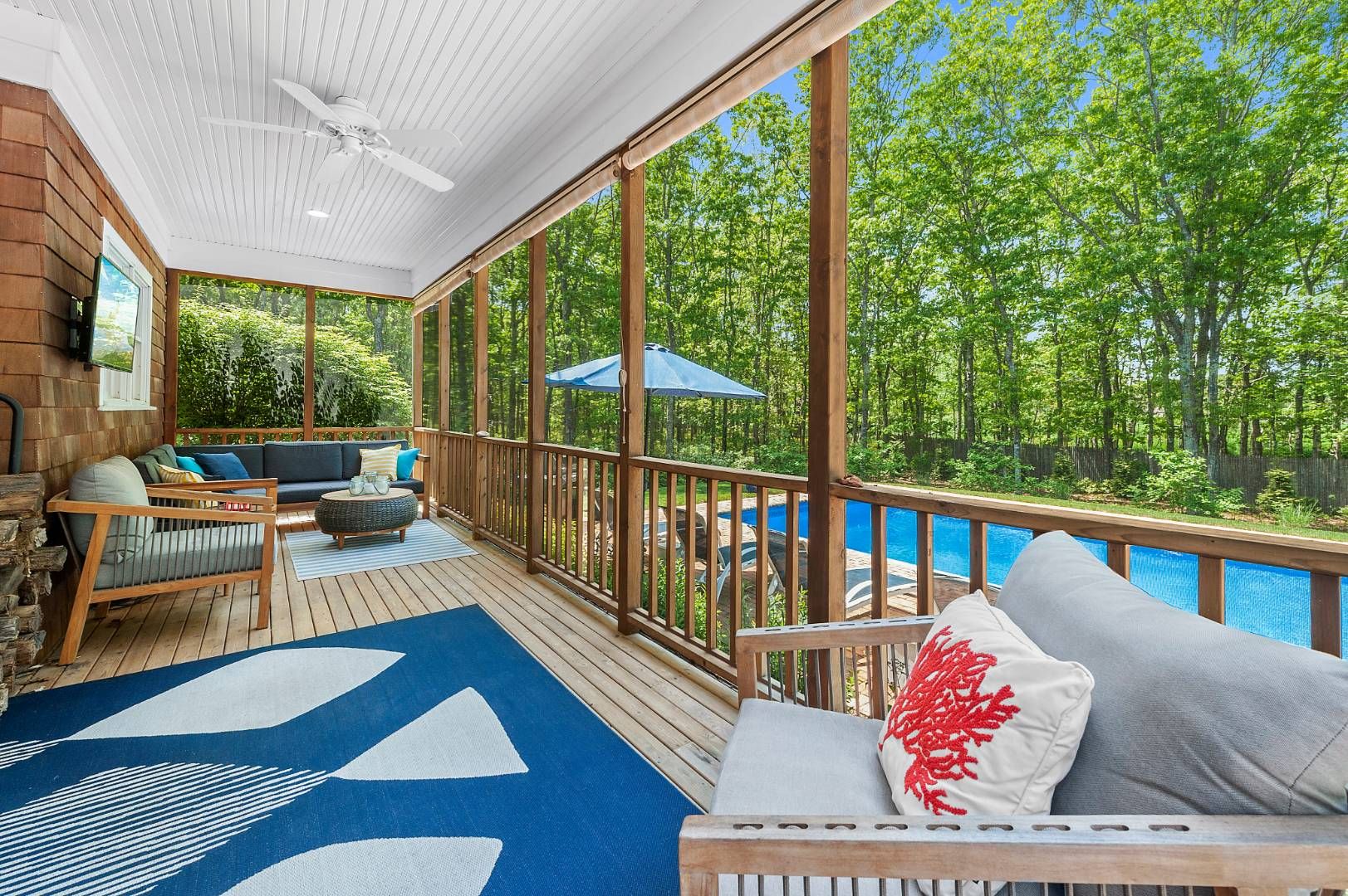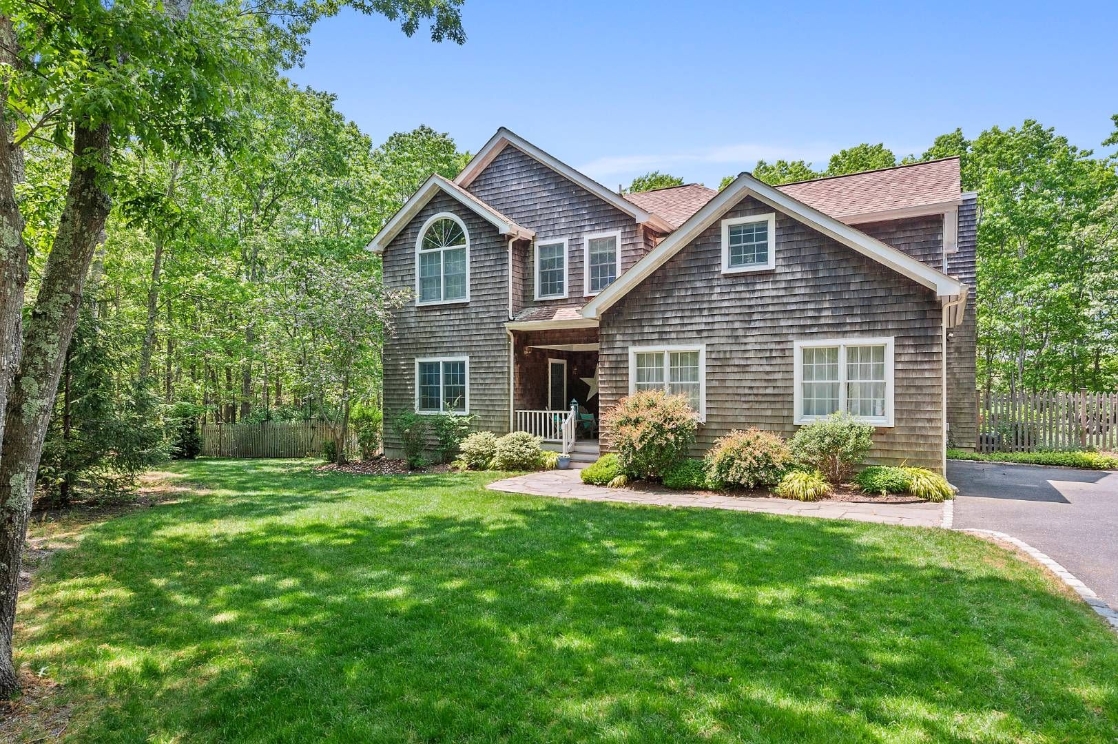 This beautifully maintained 2,392+/- sq. ft. four bedroom, three bath residence is the ideal summer vacation home. This home has an open floor plan that features a double-height living room with wood-burning fireplace, skylights and French doors with transom windows that lend a sunny and bright ambience. The dining area, overlooking an ample screened porch, flows to a perfectly appointed kitchen with Viking range, stainless appliances and gran