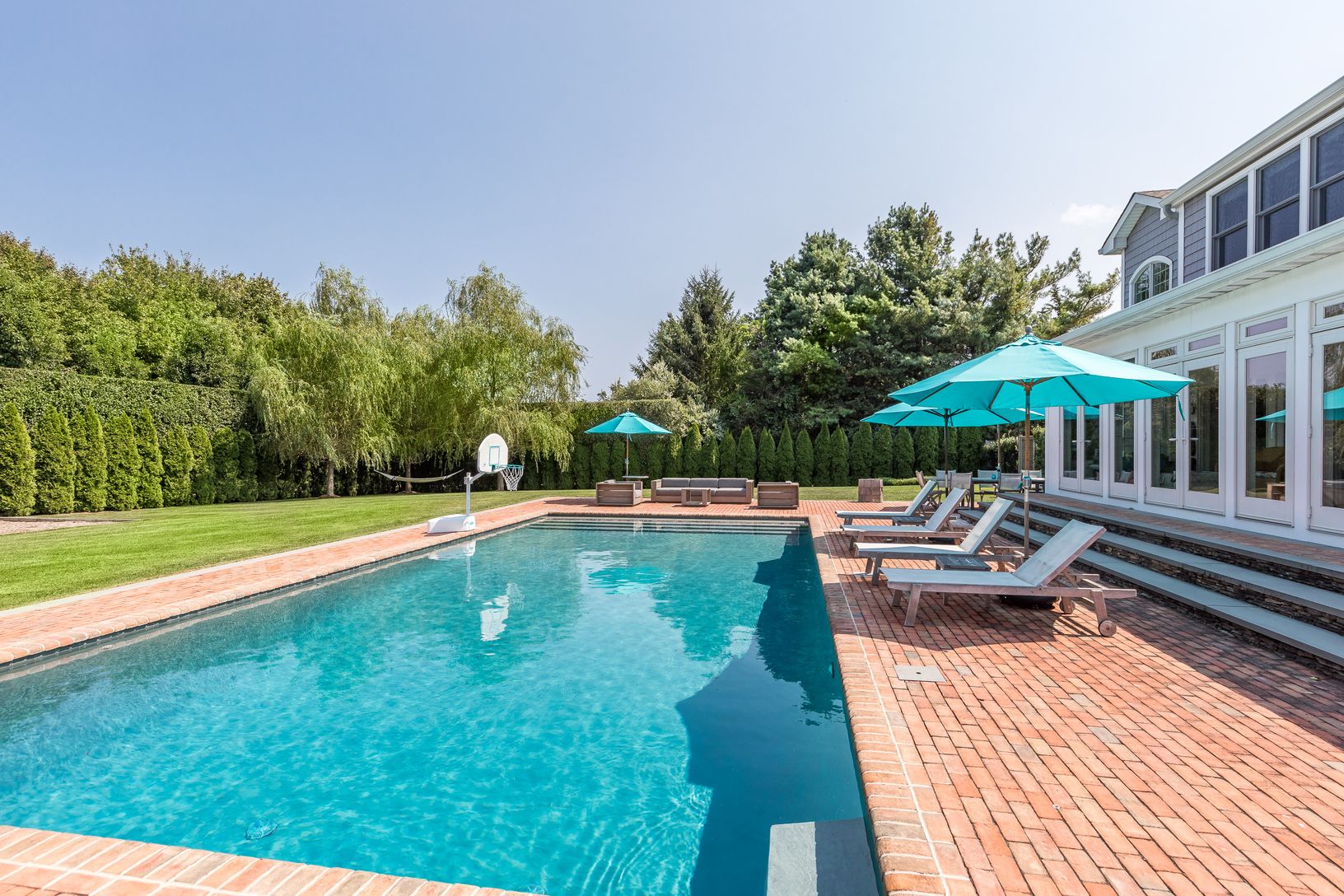 Spend your summer in this Water Mill South Estate. Set on a a quiet street with an expansive property outlined in immaculate landscaping and a tennis court, this six bedroom home is the ideal summer retreat. The private backyard offers a gunite pool and pool house, outdoor shower and an expansive yard. The house has a beautiful great room, over-sized kitchen with a sub-zero fridge, Wol