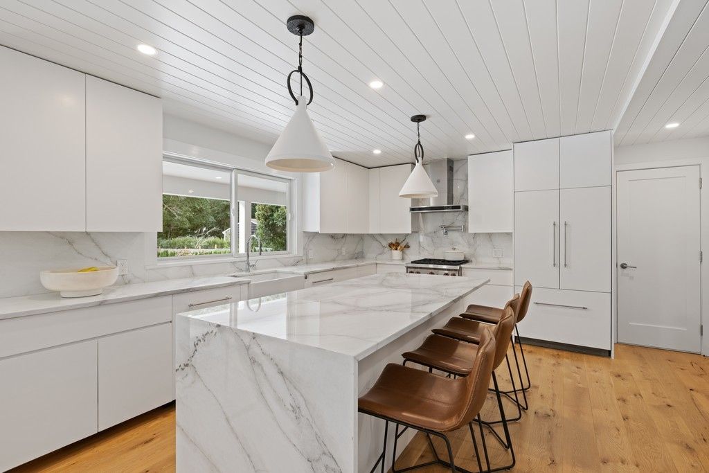 Expansive kitchen with Calacatta marble counter opens onto living, dining, and family area. Built for the 21st Century with tablet control, Sonos sound, and central vacuum.