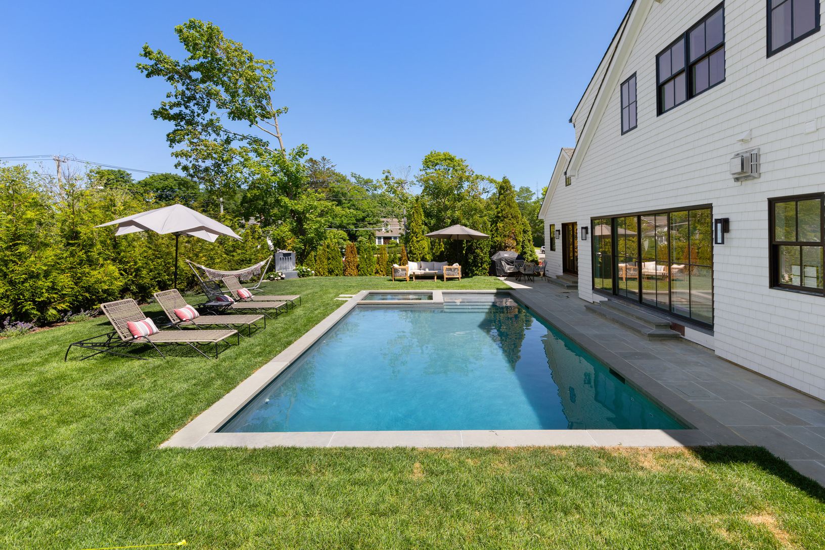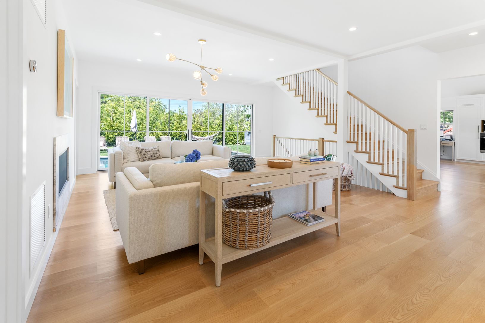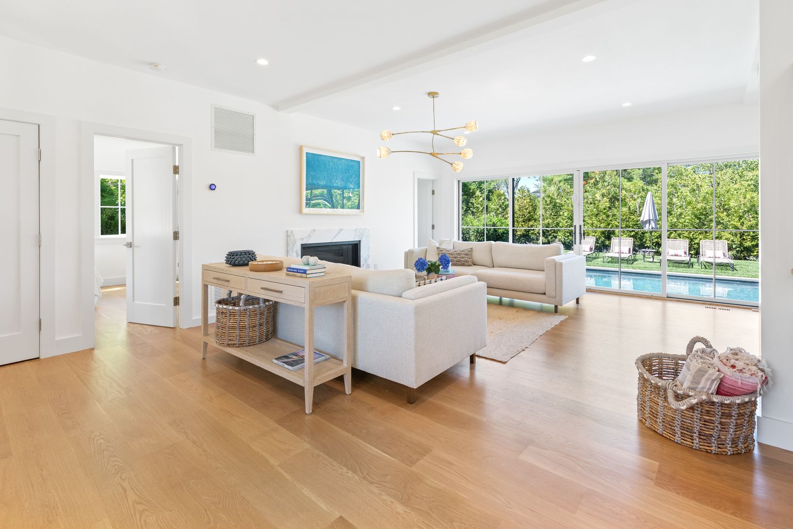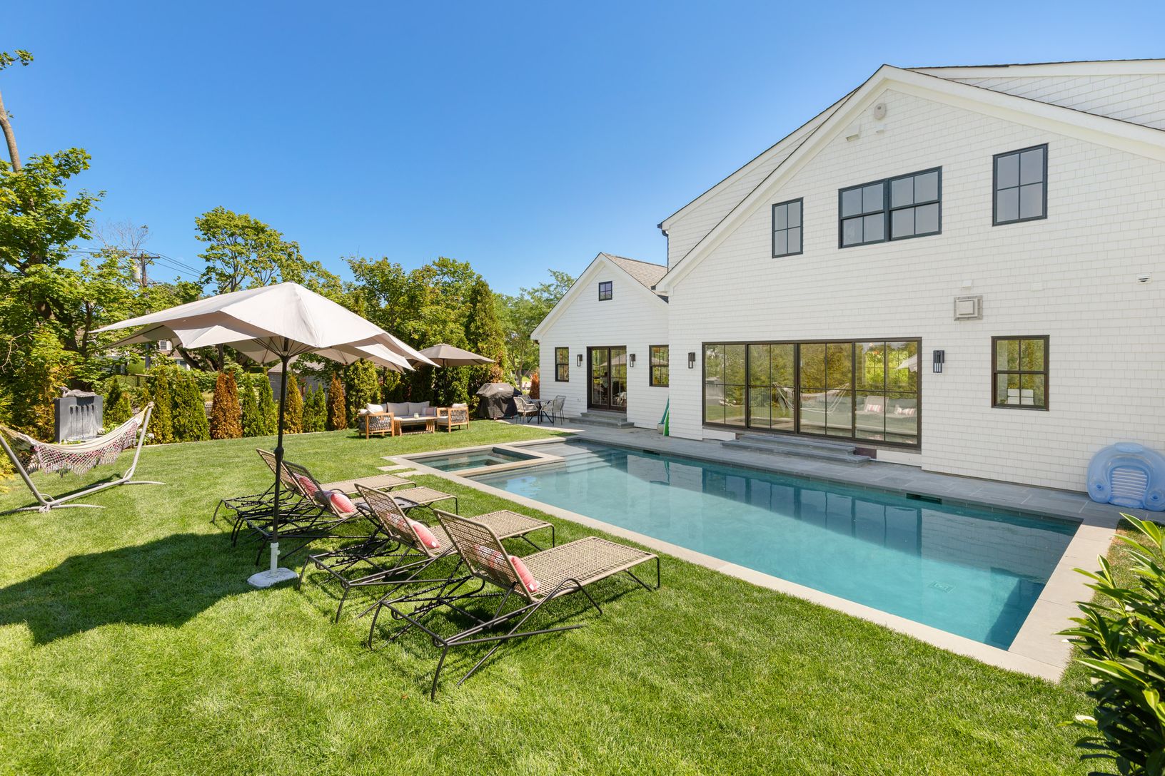 Be the first to enjoy this brand new Southampton village new construction home. Just completed, the house spans over 3,765+/-sq.ft with five bedrooms and 5.5 bathrooms. Entering through the front door, you're greeted with a beautiful and bright livingroom which showcases a gas fireplace, large sliding glass door with views of the heated-gunite pool and spa, and all brand new furnishings. The kitchen features cathedral ceilings with exposed bea