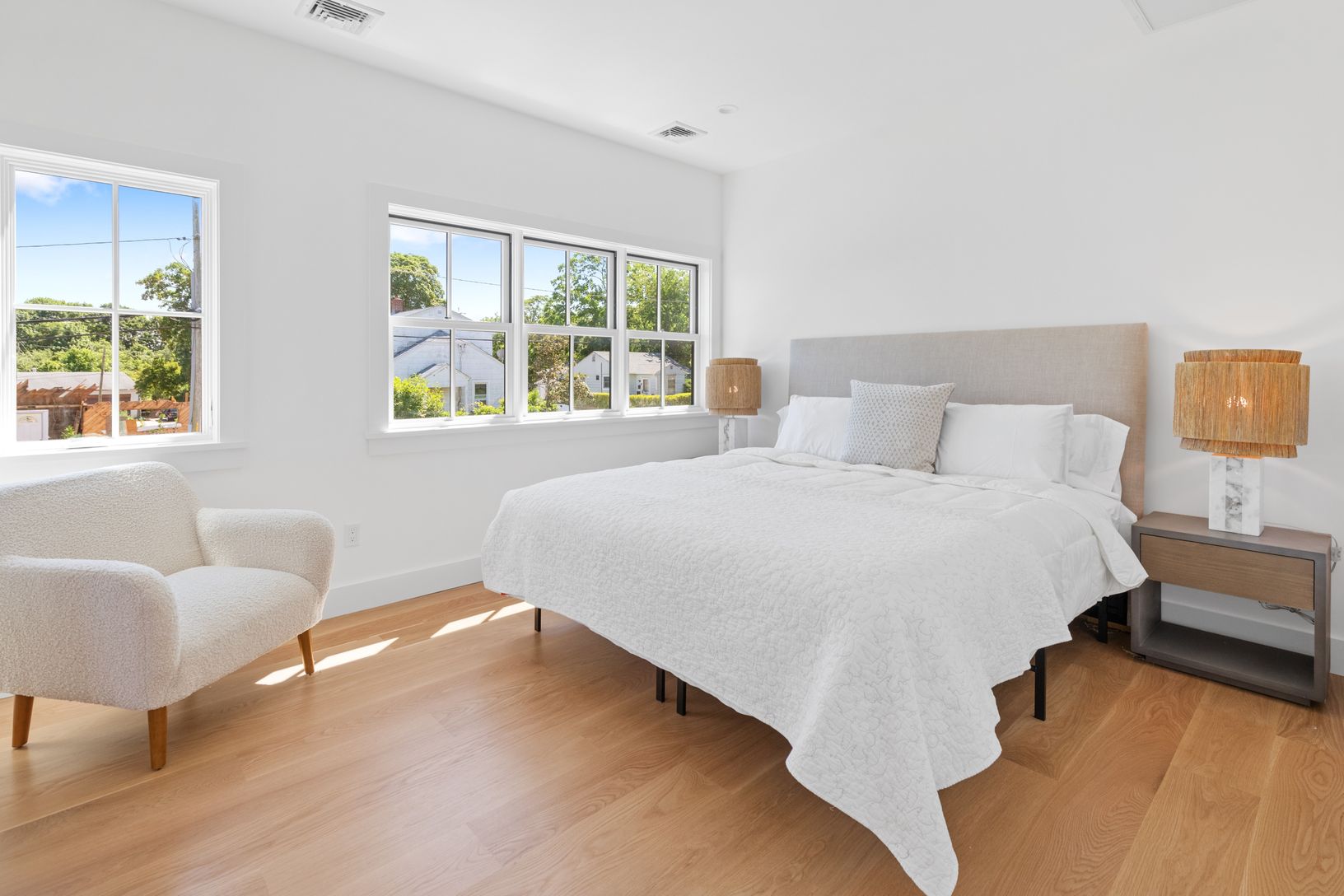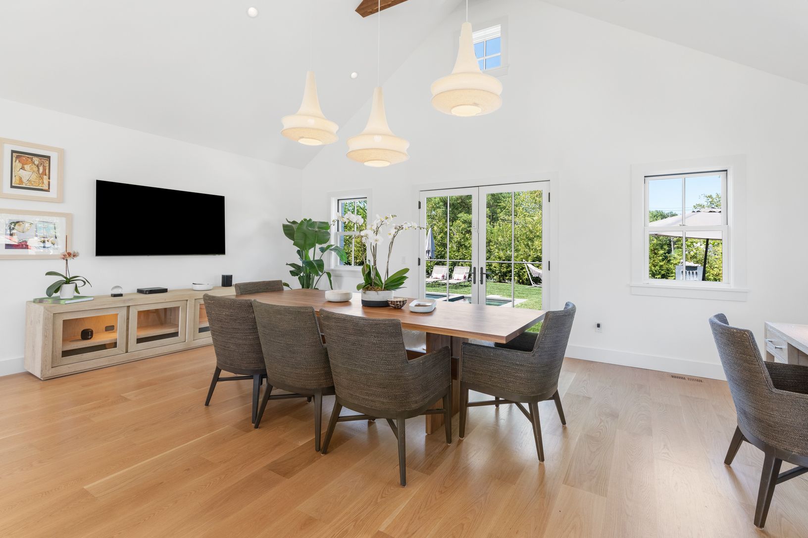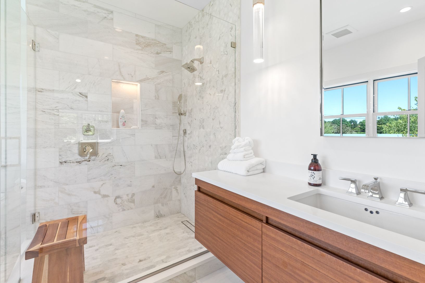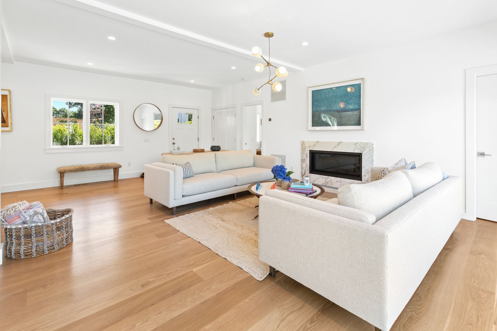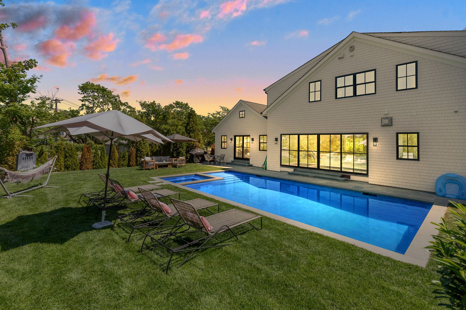 Be the first to enjoy this brand new Southampton village new construction home. Just completed, the house spans over 3,765+/-sq.ft with five bedrooms and 5.5 bathrooms. Entering through the front door, you're greeted with a beautiful and bright livingroom which showcases a gas fireplace, large sliding glass door with views of the heated-gunite pool and spa, and all brand new furnishings. The kitchen features cathedral ceilings with exposed bea