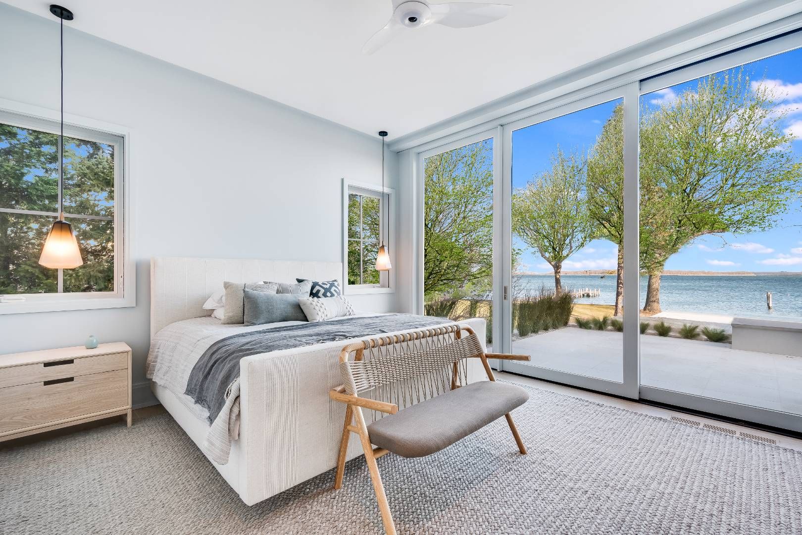New and pristine North Haven waterfront with dock. This beautiful custom designed waterfront home is completely new and decorated in a sophisticated muted palette bringing your focus to the idyllic setting. Exquisite 6 bedroom, 6.5 bath retreat has an open kitchen with breakfast bar, dining area, and great room. Outdoor living areas include a large porch with automated screens and a lovely deck and patio overlooking the waterside infinity-edge