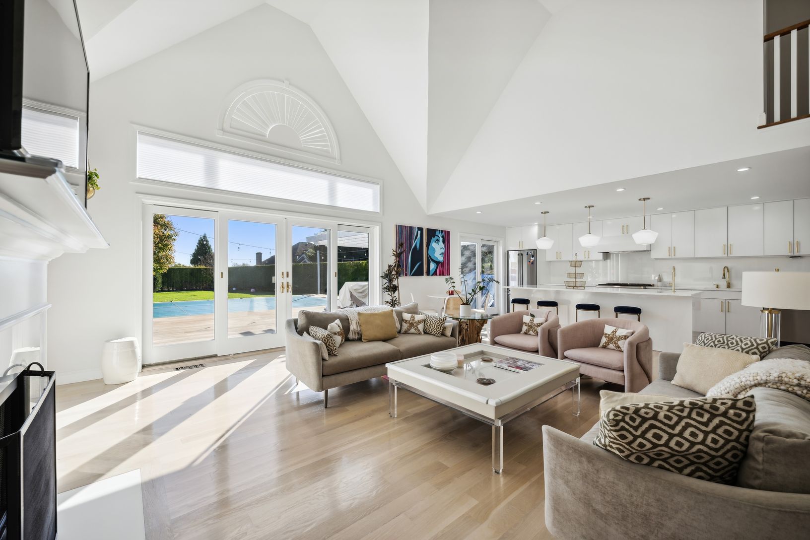 This beautiful turn key home is radiant with natural light. Upon entering the front door the sunlight from the oversized windows in the double high ceiling living room greet you. The entire south side of the house is sliding glass doors leading to the deck and outdoor kitchen making for the perfect indoor outdoor living experience. The living room is set around the fireplace making it the perfect room for both summer and winter. The newly re