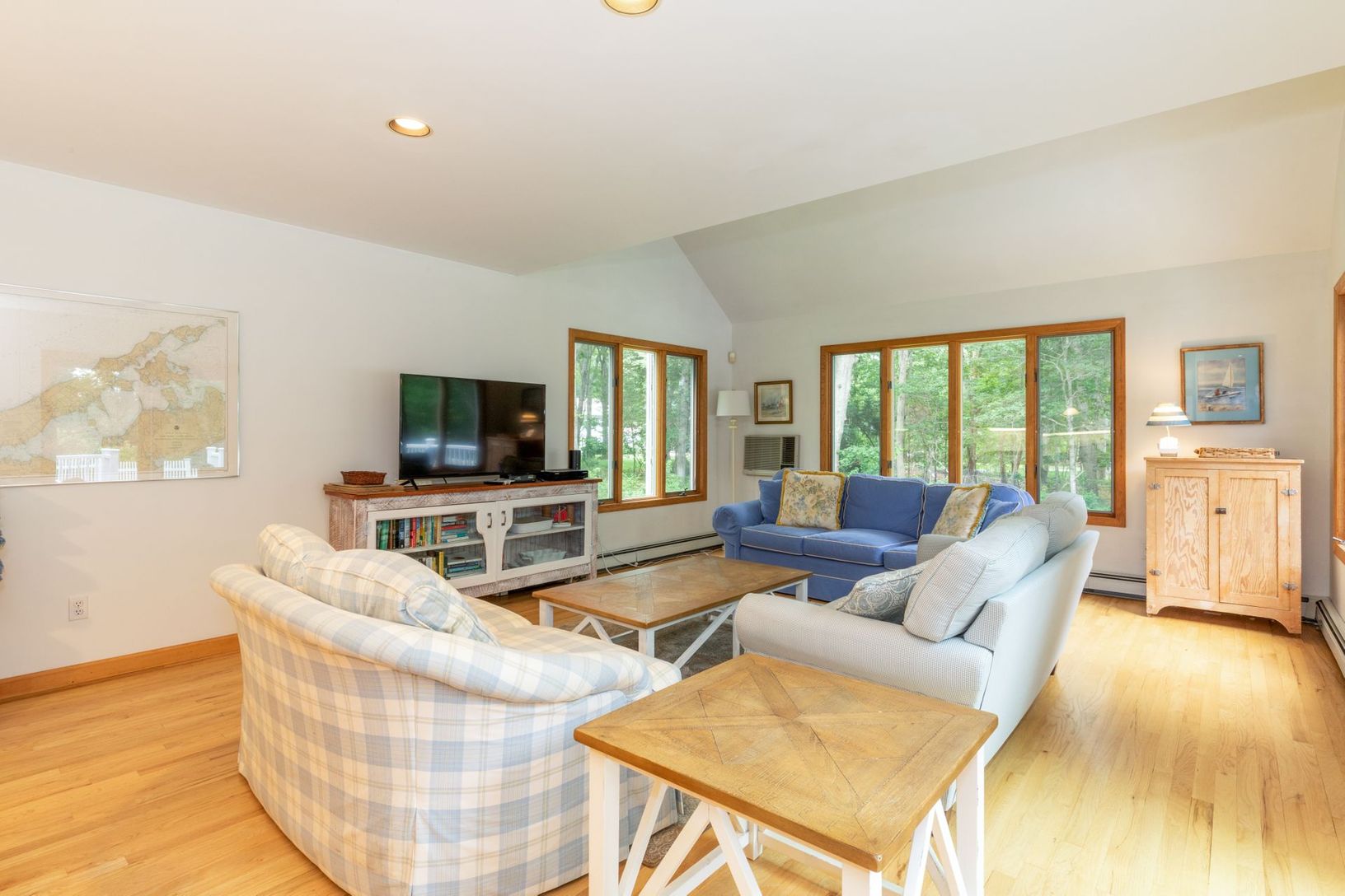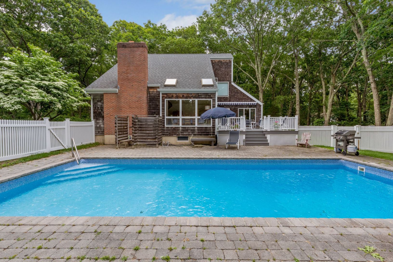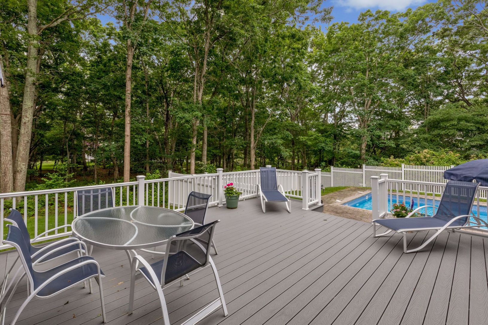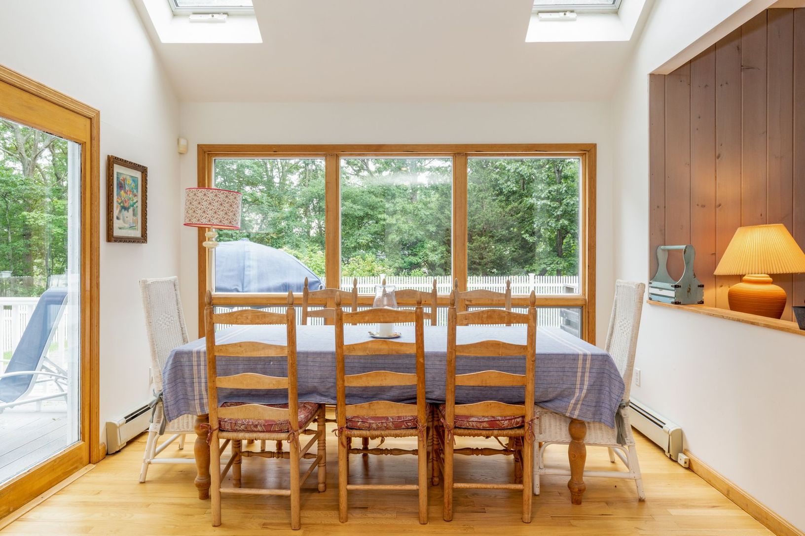 Lovely and private four-bedroom, three-bath home on two acres in North Haven. Bright and light, the house flows out to the deck overlooking the pool and private wooded surroundings. Lovely and quiet location on cul-de-sac, just a short distance down Stock Farm Lane there is access to miles of hiking trails as well as Genet Creek where you can launch your kayak and paddle boards leading out to Noyack Bay.