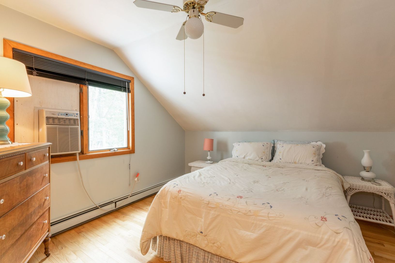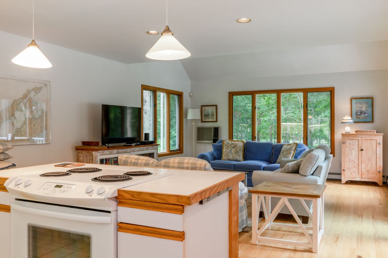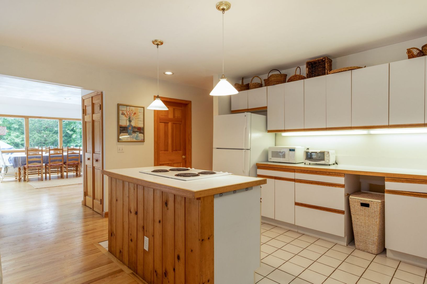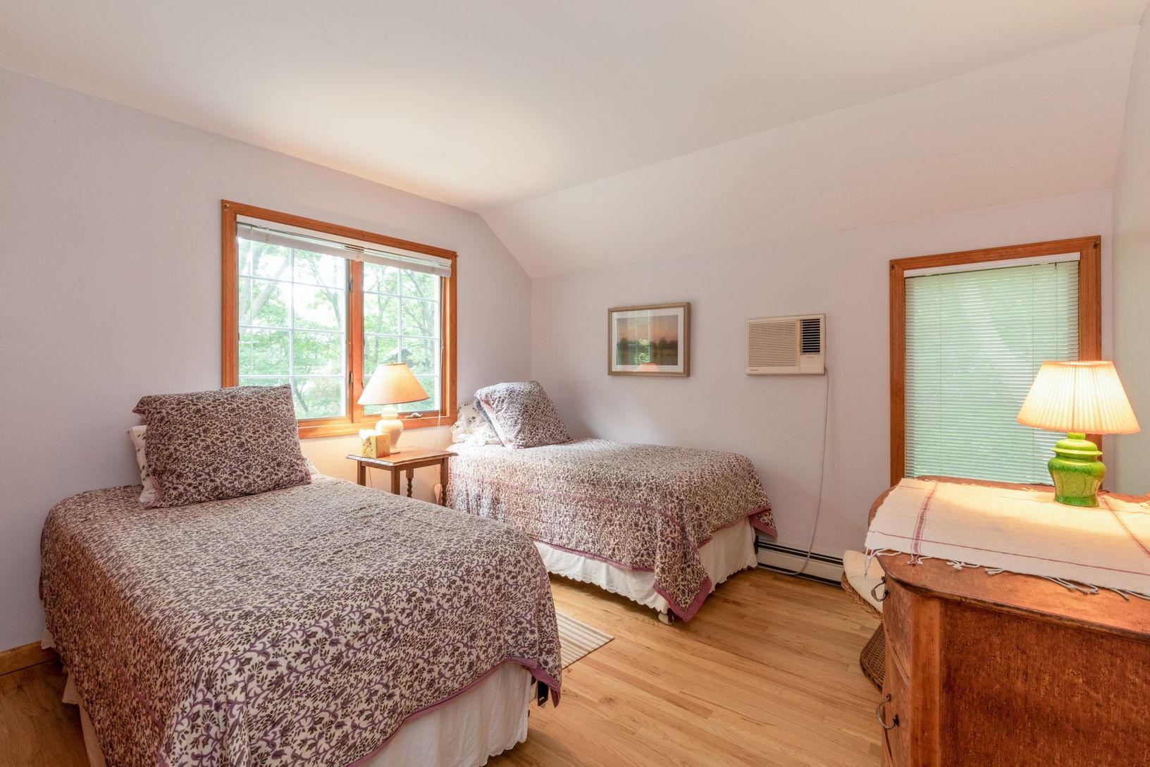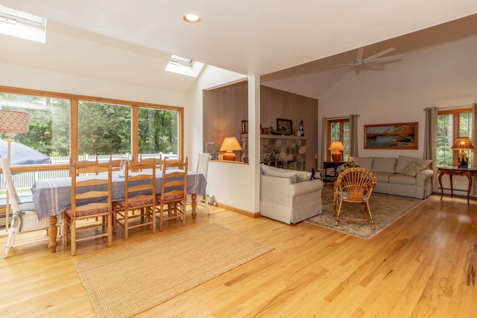 Lovely and private four-bedroom, three-bath home on two acres in North Haven. Bright and light, the house flows out to the deck overlooking the pool and private wooded surroundings. Lovely and quiet location on cul-de-sac, just a short distance down Stock Farm Lane there is access to miles of hiking trails as well as Genet Creek where you can launch your kayak and paddle boards leading out to Noyack Bay.
