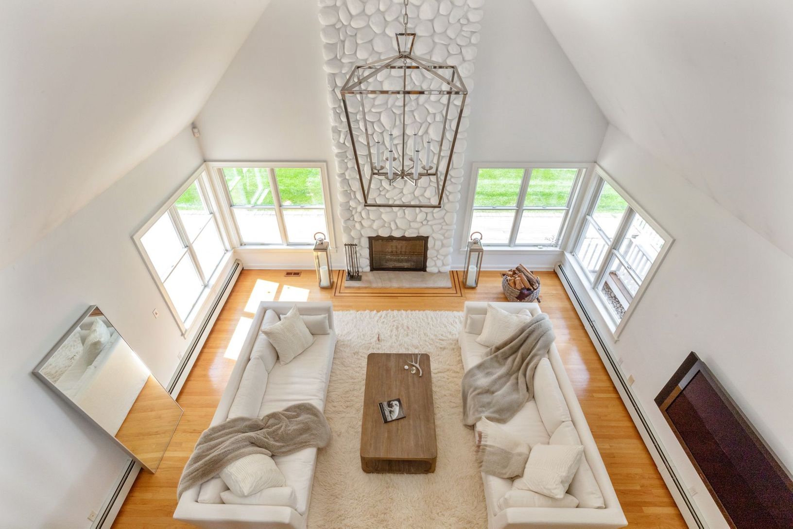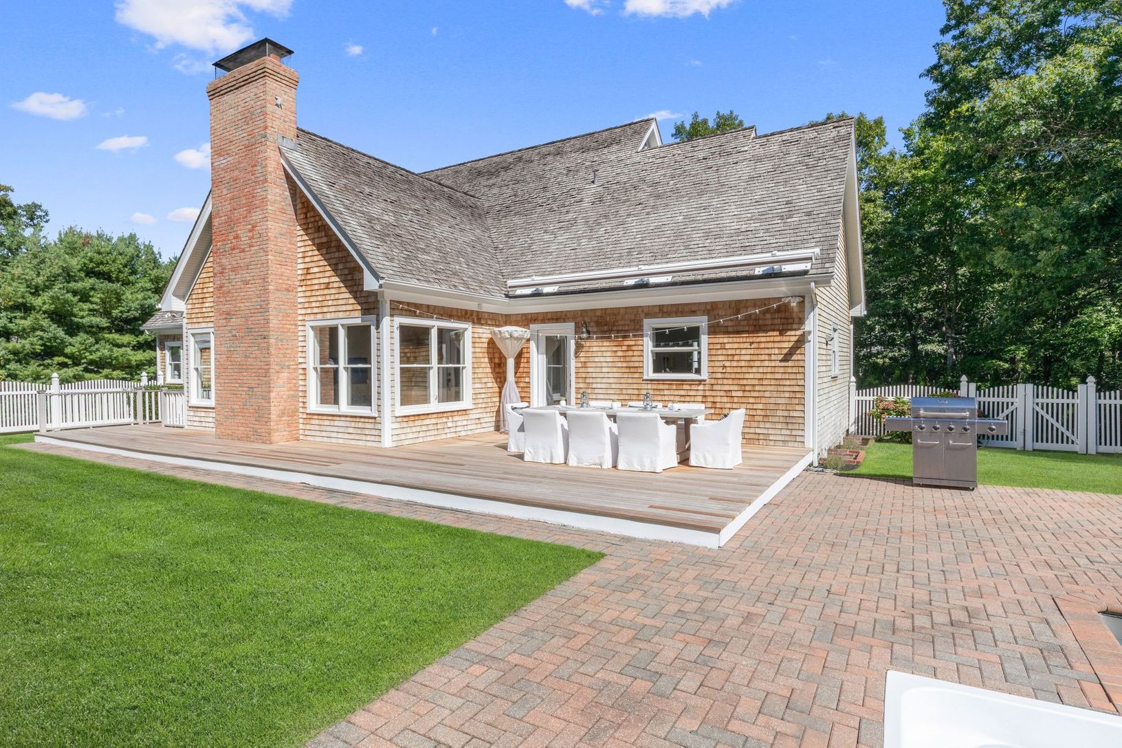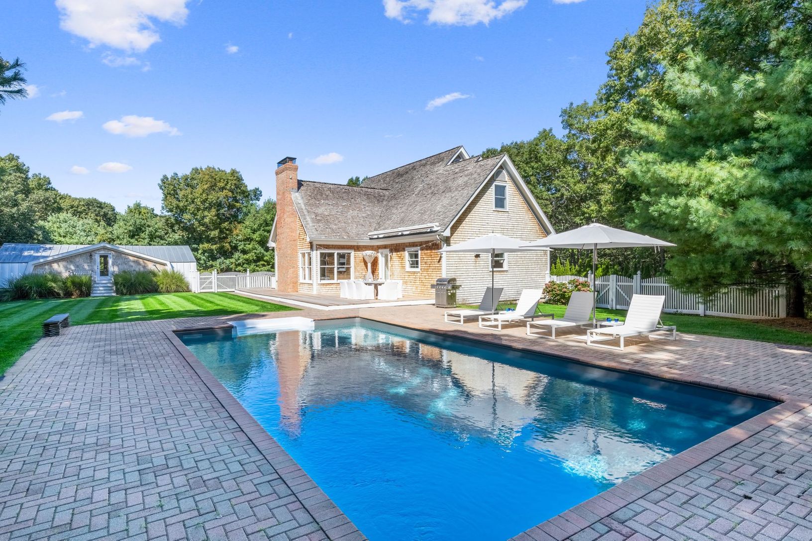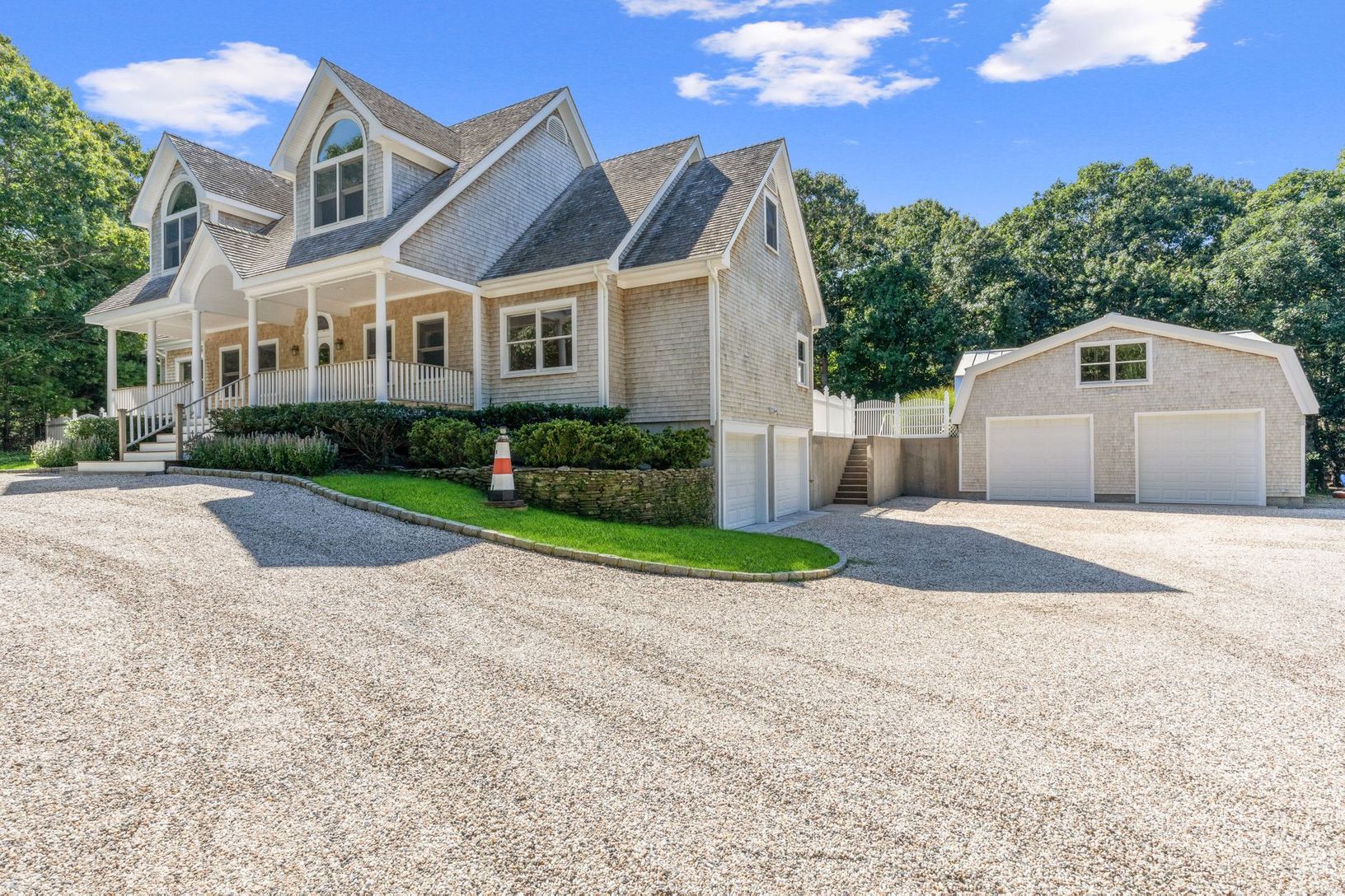Immaculate traditional on a full grassy acre with a huge detached four car garage offered fully furnished by Restoration Hardware. This lovely home has a spacious eat in kitchen, dining area, white and bright living space with a stone fireplace, ensuite primary bedroom, laundry room and powder room on the first floor. The second story has three guest bedrooms, a full bath and additional space yet to be finished. A large unfinished basement wit