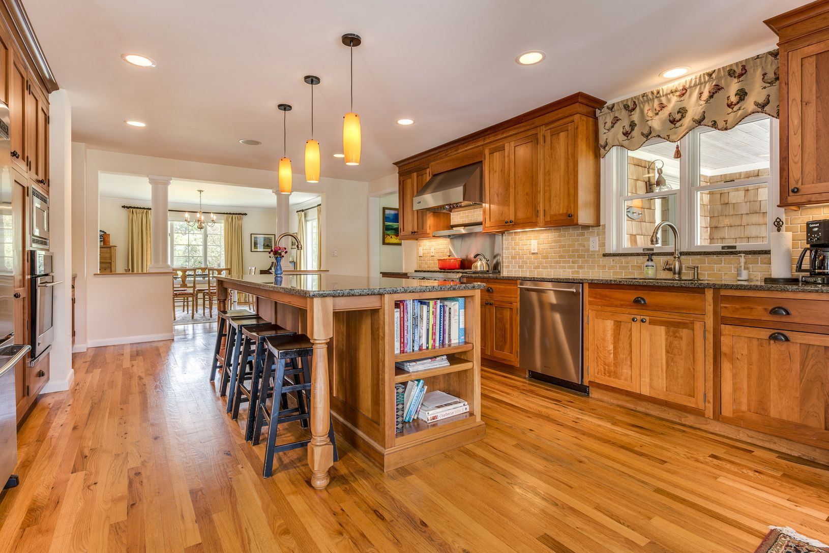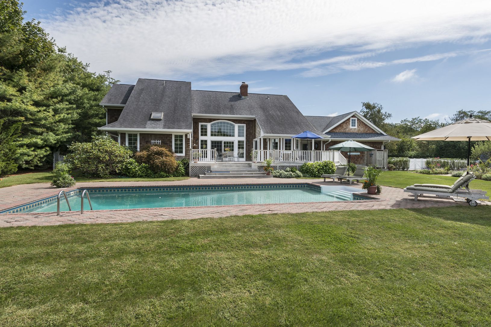 This smartly designed five bedroom, four and one-half bath postmodern home, sited on a beautifully landscaped acre in a quiet and well-maintained neighborhood, is offered for the first time. The turnkey home features a living room with a stone fireplace, soaring ceilings and natural light from the large windows and sliding doors leading out to the deck and pool area. There is a renovated kitchen with an eat-in breakfast area, a large island an