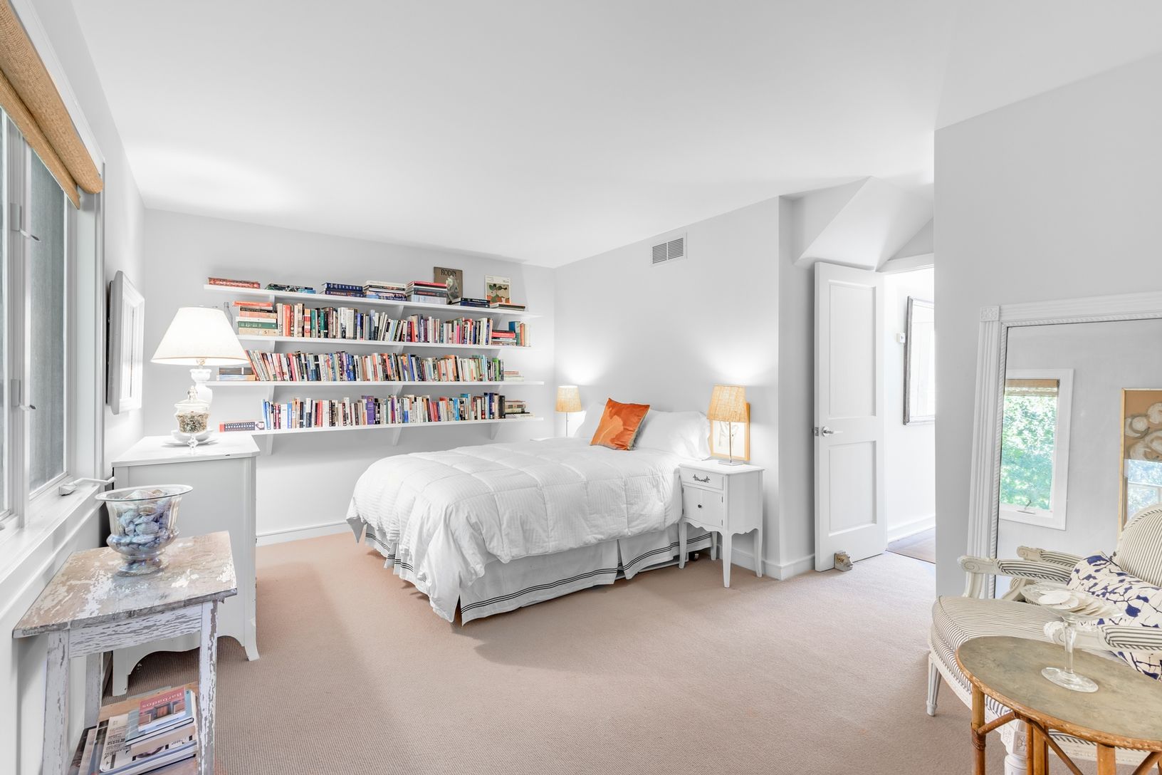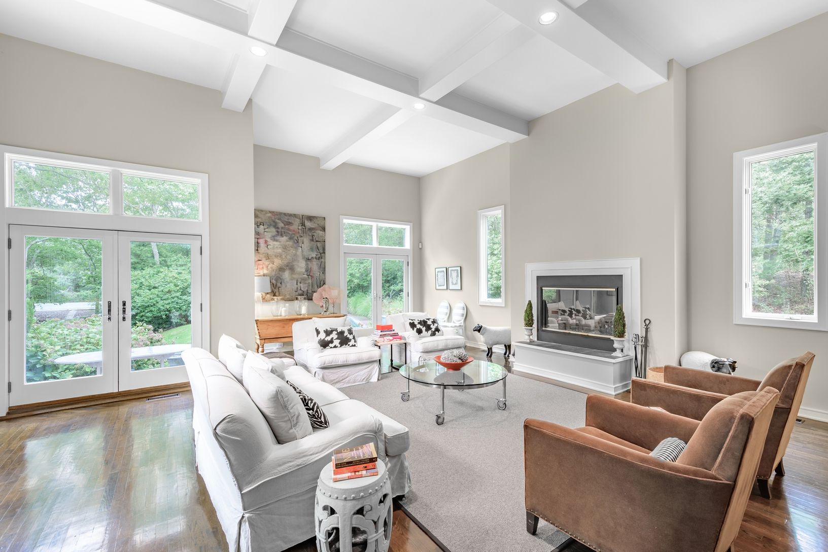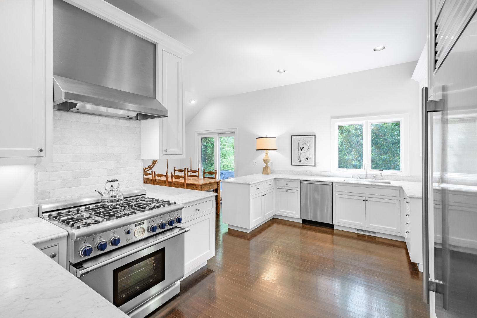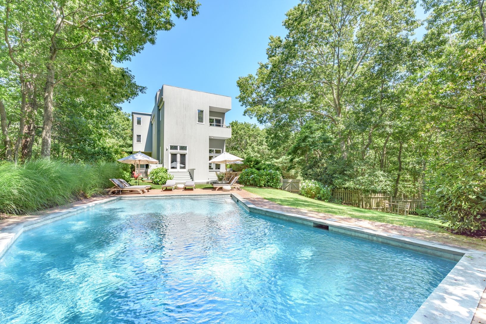 Set on 2.7+/- private acres in Water Mill, this recently renovated residence offers the opportunity to relax and entertain in style. A gracious entrance foyer leads to a light-filled, double height spacious living room with wood burning fireplace and French doors overlooking the rear yard and oversized, heated Gunite pool. The eat-in kitchen includes professional stainless steel appliances, white Carrara marble countertops, and a butler's pr