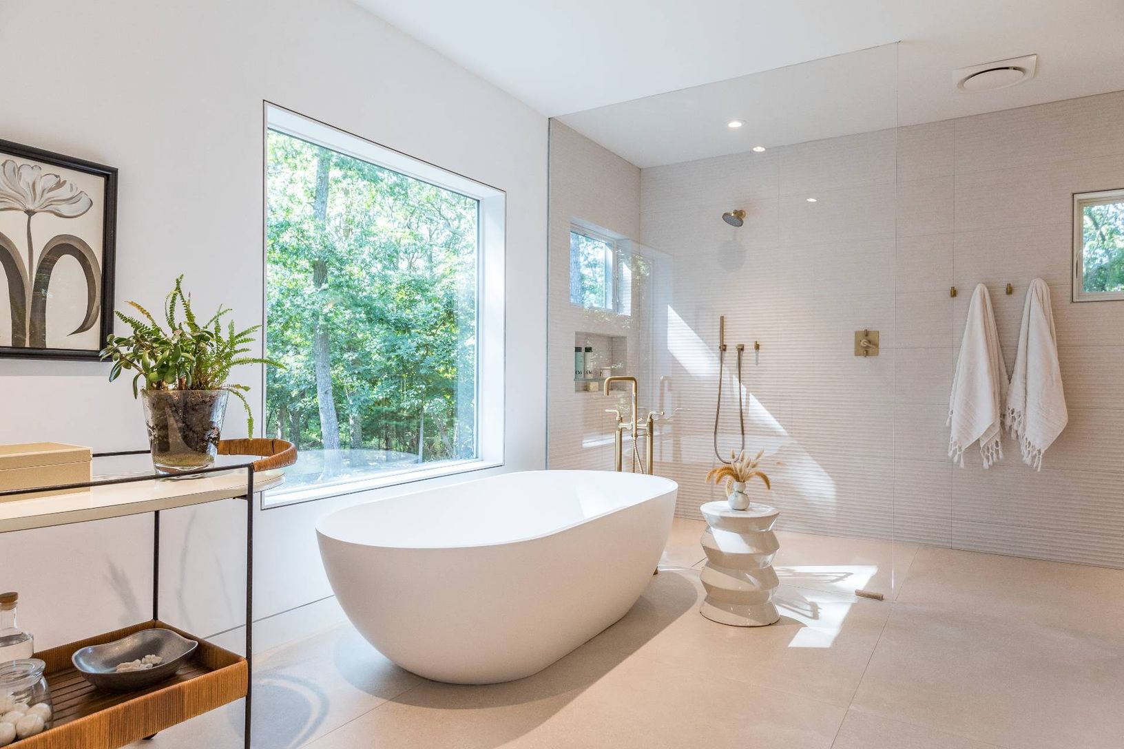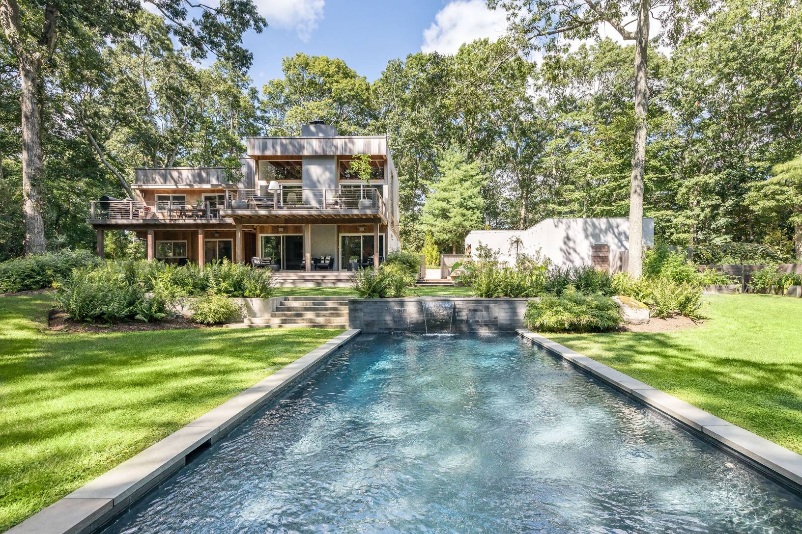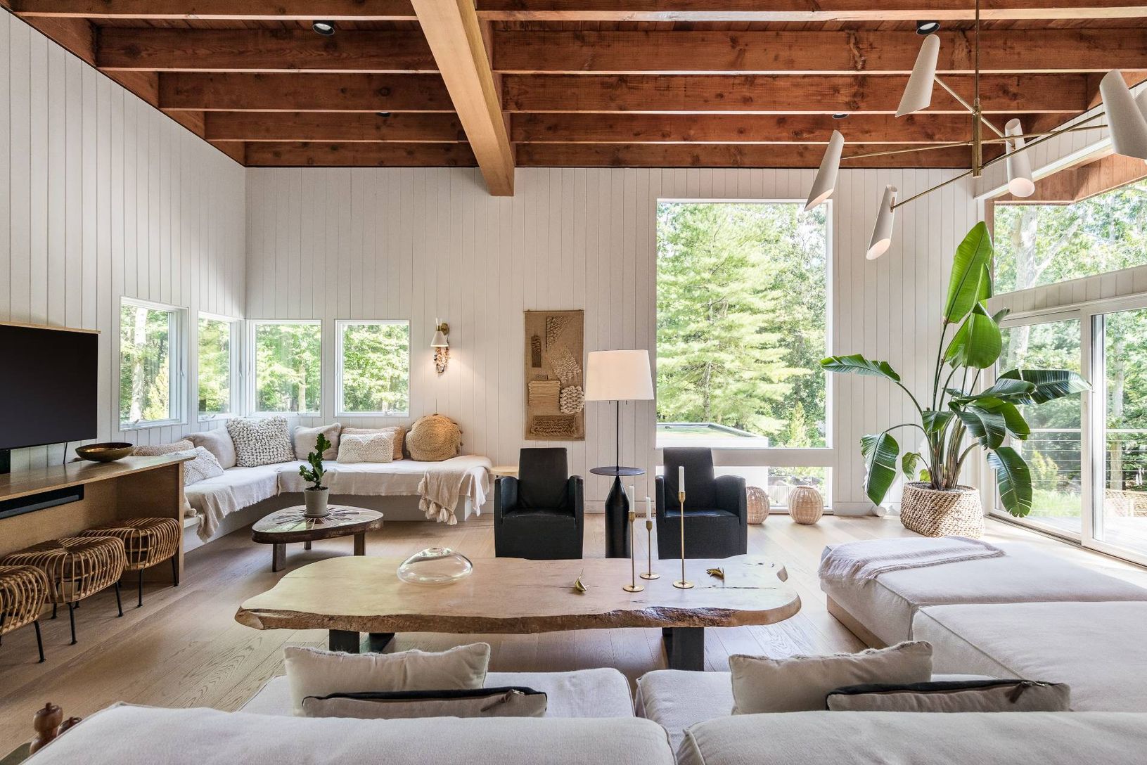 This entirely renovated new modern home is privately tucked away in the woods just moments to both East Hampton Village and ocean beaches. Down a secluded driveway, the impeccable residence was originally built in 1970 and designed by renowned architect Harry Bates. In 2020 the property was gut renovated and expanded with no expense spared. Enter the light-filled foyer showcasing a floating staircase leading to the great room with 14 ft. beame