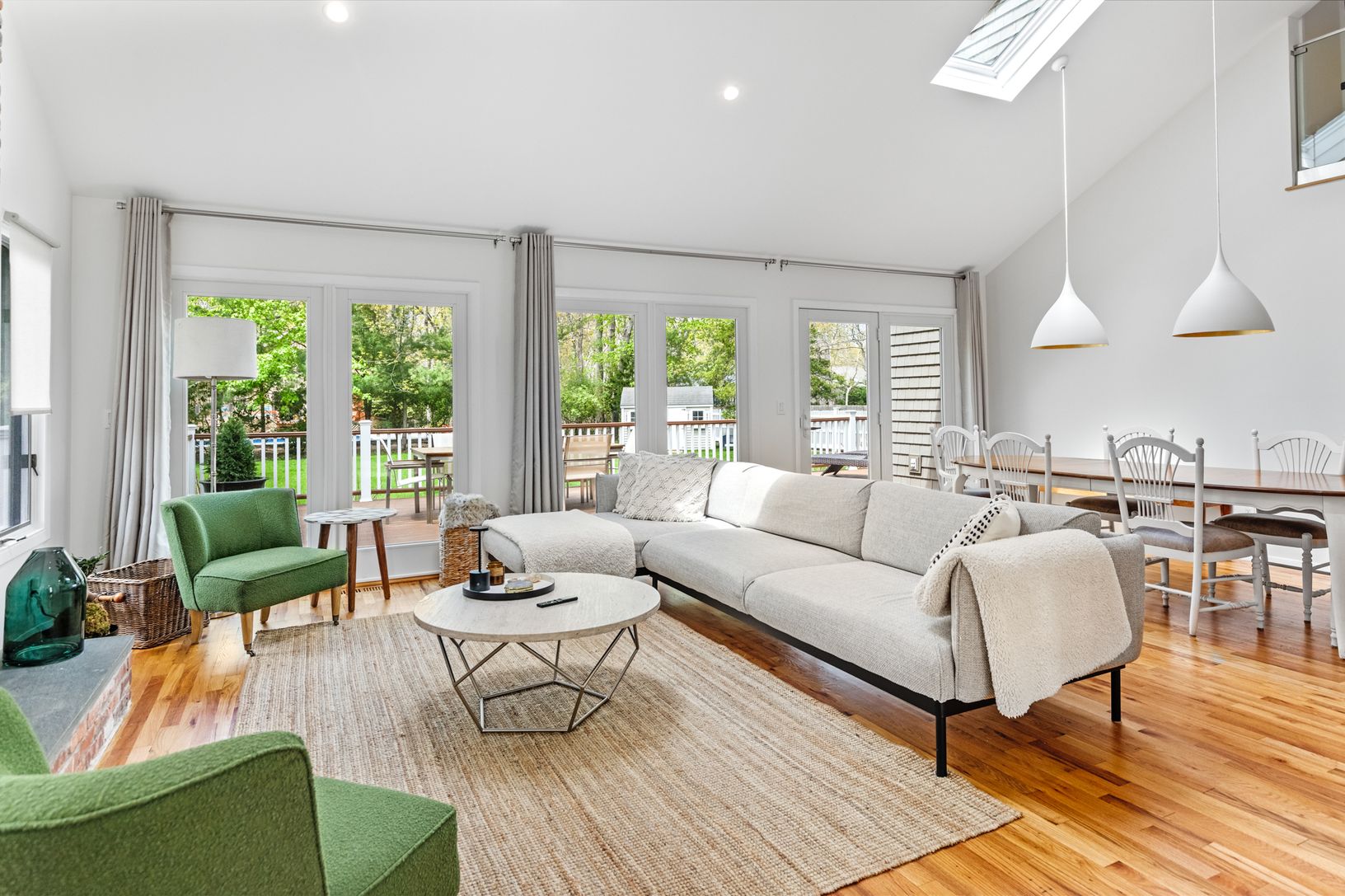 Enjoy summer in East Hampton's Clearwater Beach community. This recently renovated home with 3 bedrooms and 2 and a half baths is situated on a just-shy half acre. Bright, clean interiors have beautiful wood floors and an open floor plan with living room with fireplace, skylights, dining area seating 6, and a sparkling white kitchen with butcher block countertops. The primary bedroom also opens to the expansive rear deck. The stylish primary b