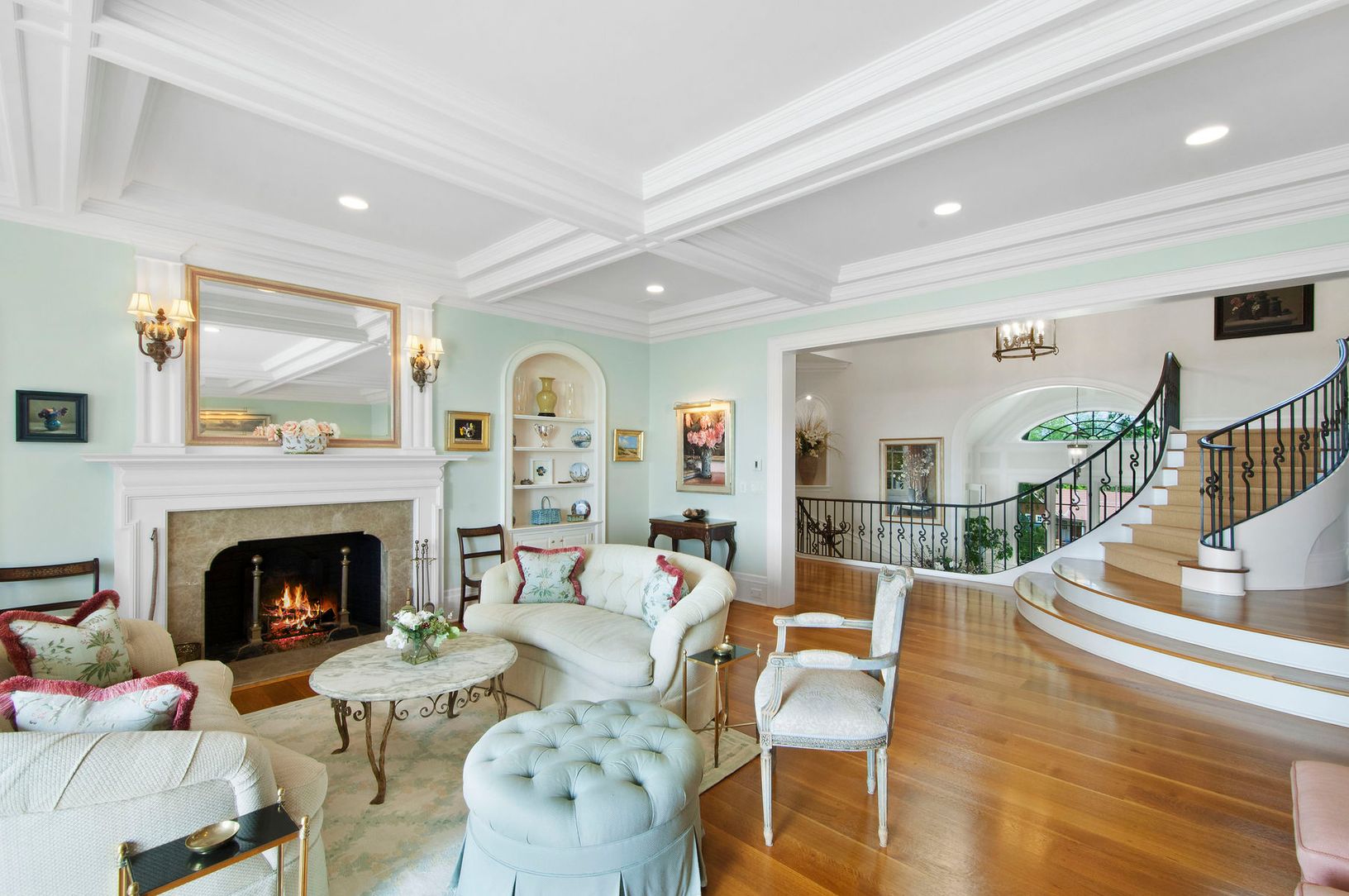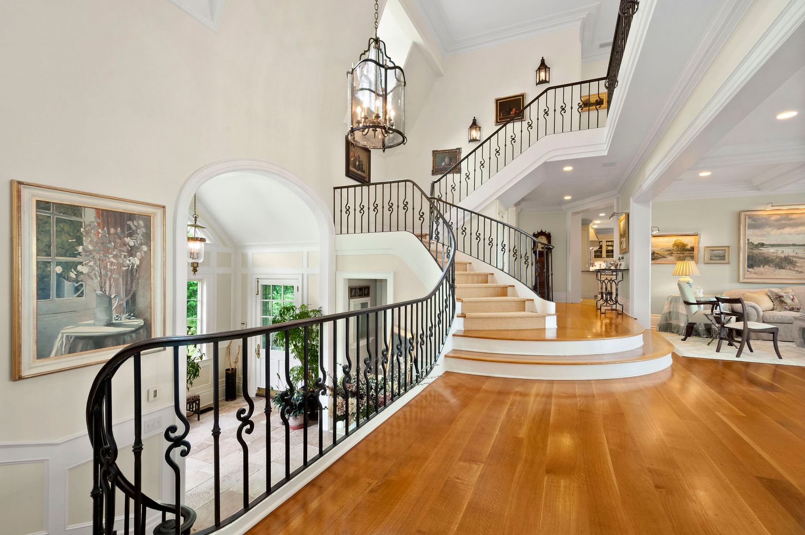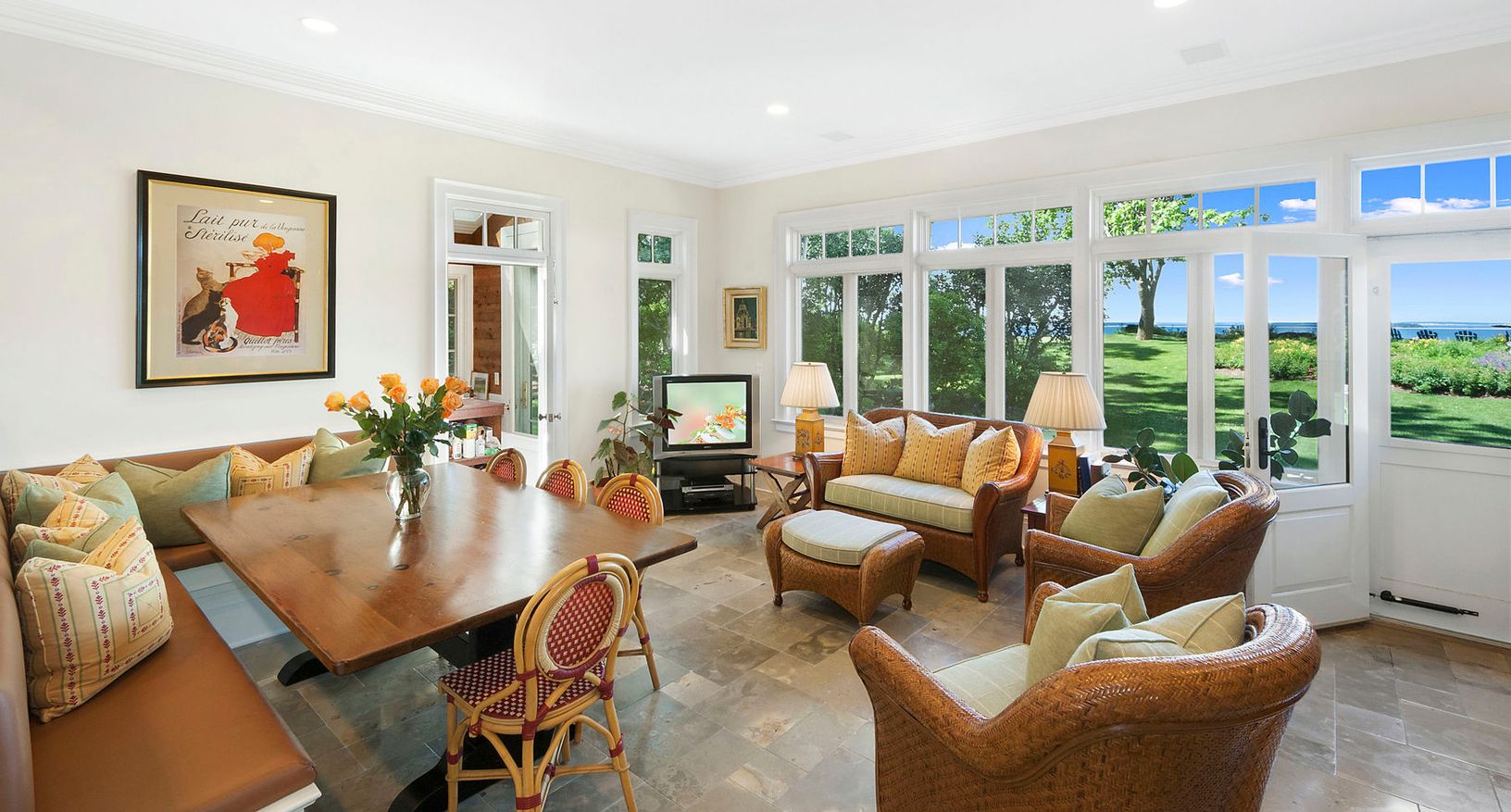 This custom built waterfront home offers panoramic water views with spectacular sunsets and off shore boat mooring. On almost 3 acres of lushly landscaped grounds with exquisite gardens, the 8300+/- sq. ft. residence features seven en suite bedrooms, a gracious living room, formal dining room, chef's kitchen, family room, paneled study, professional gym and wine cellar. The pool house, heated saltwater gunite pool, and man-made pond with water