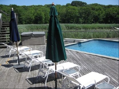 Set back on a quiet country lane in Westhampton sits this beautifully appointed four bedroom, three & a half bath home with multilevel waterviews and decks.Windows surround the great room, and open eat in kitchen with fantastic waterviews. There are two ensuite waterview master bedrooms, one adjacent to the great room on the upper level with half bath, and one on the main level off the pool area. Two other bedrooms share a full bath on th