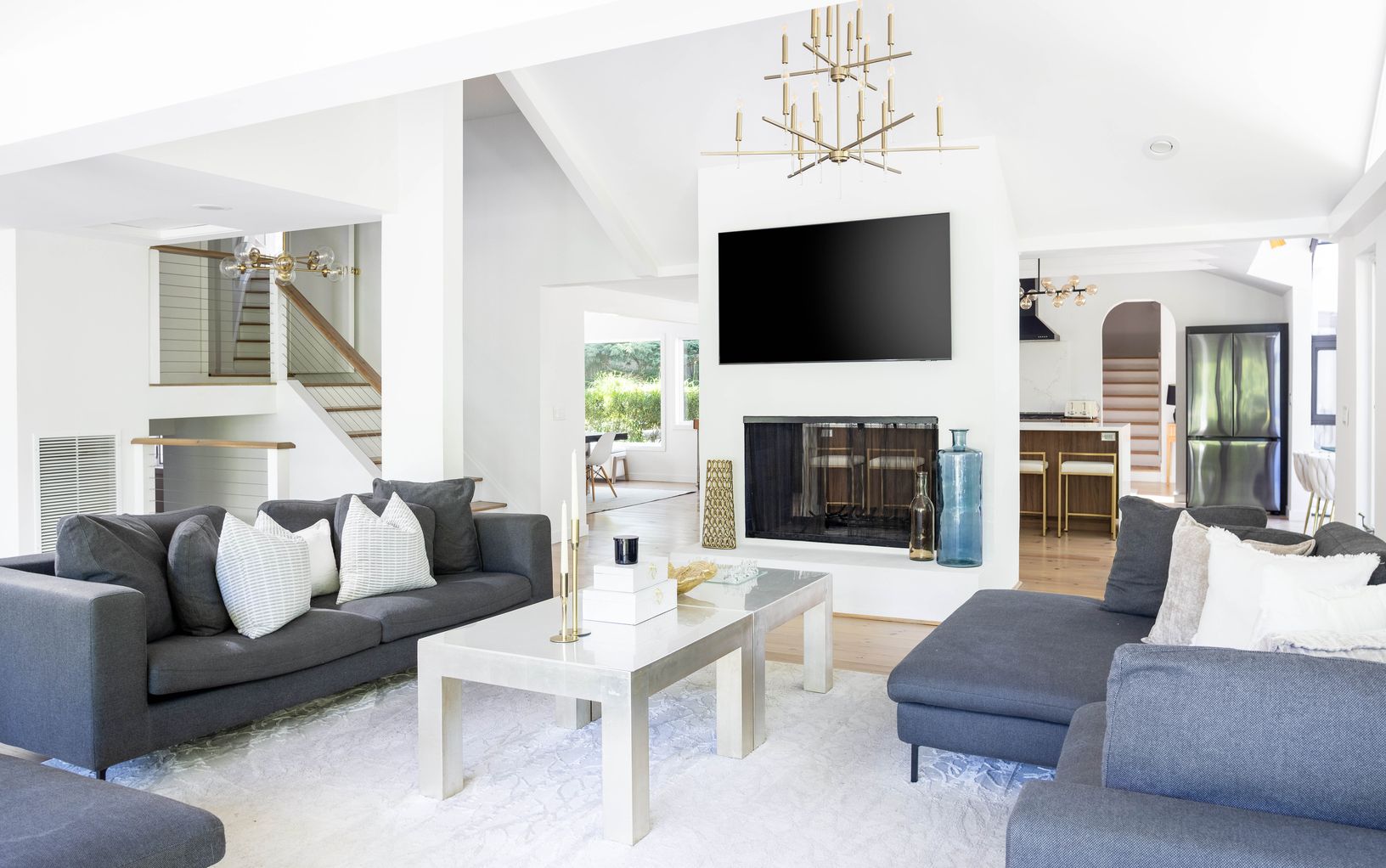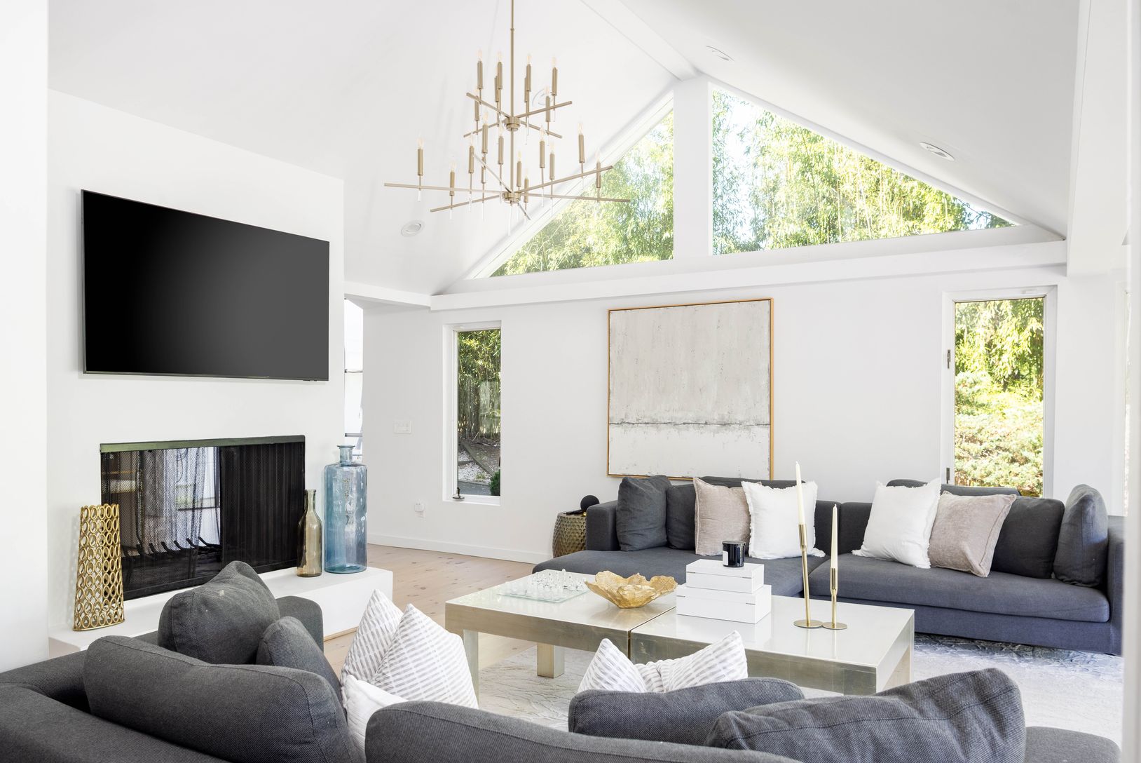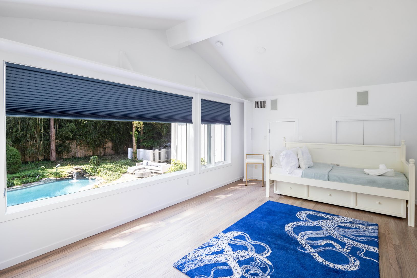 Inside, the vaulted great room opens to a wall of glass framing sweeping bay views, while the modern kitchen connects seamlessly to multiple dining and lounge areas. Highlights include a waterfall island, floor to ceiling windows, a six person breakfast nook, and a double sided fireplace. Sliding gl