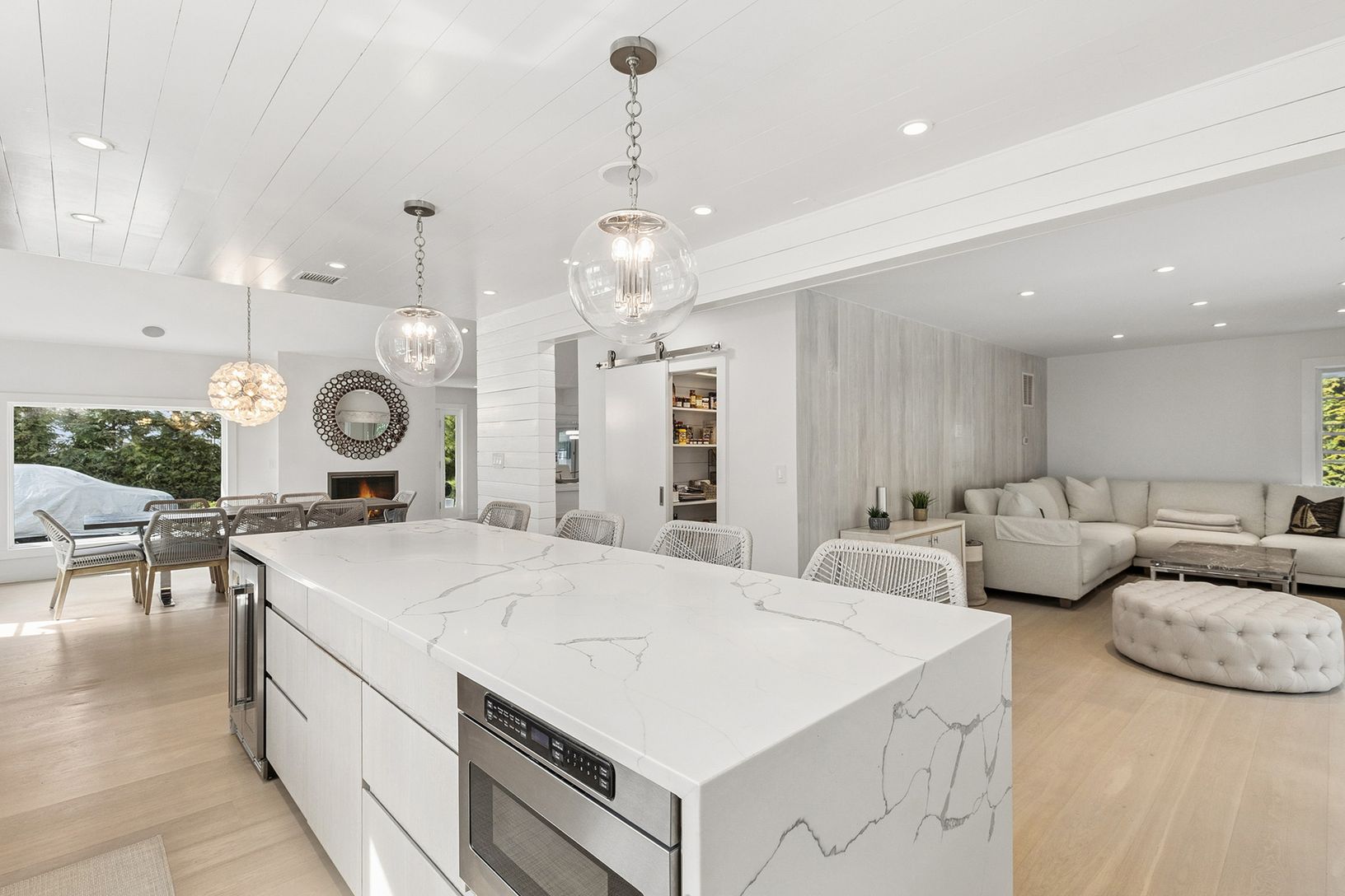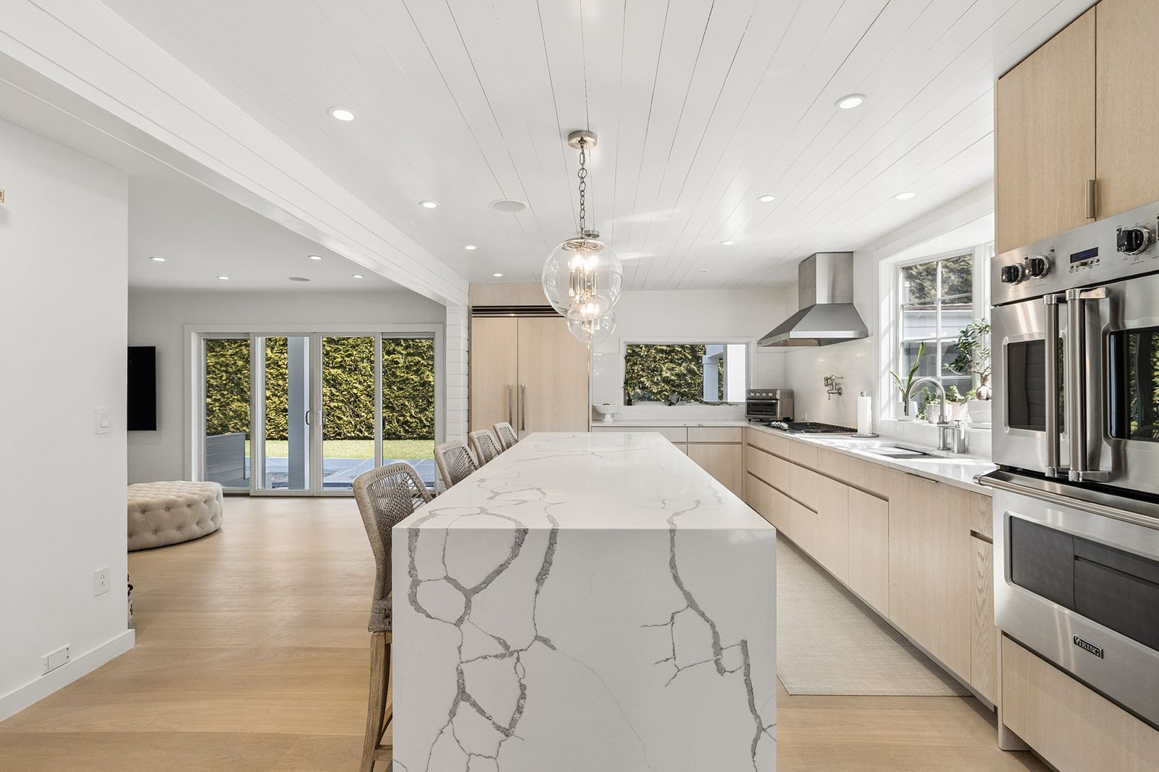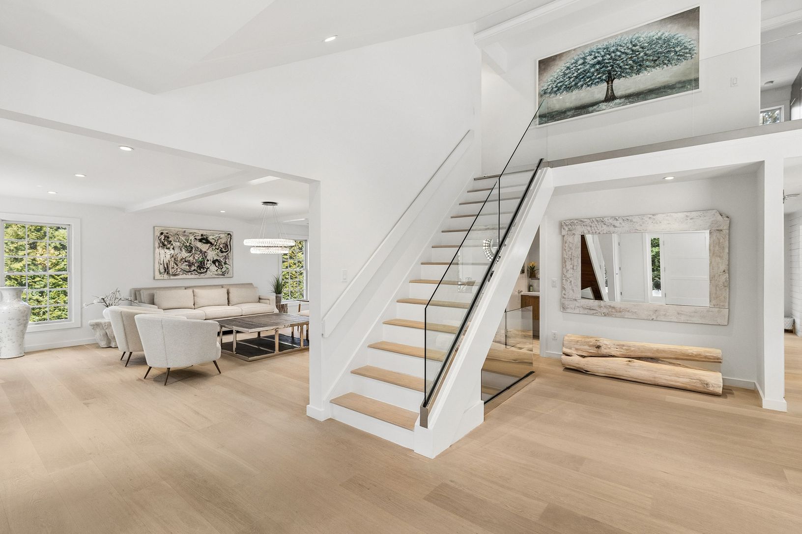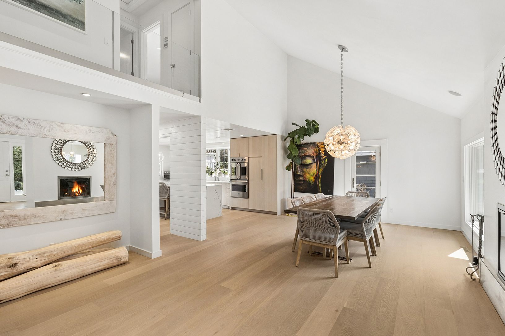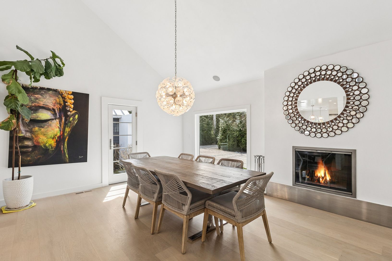 Nestled within the desirable East Hampton Springs, this fully renovated gated residence is set on +/- 0.40 beautifully landscaped acres, offering a seamless blend of modern design and luxury living. The home showcases an open-concept layout enhanced by double-height ceilings and wide-plank hardwood floors throughout. At the center of the home, a spacious living and dining area is anchored by a charming wood-burning fireplace, creating a warm y