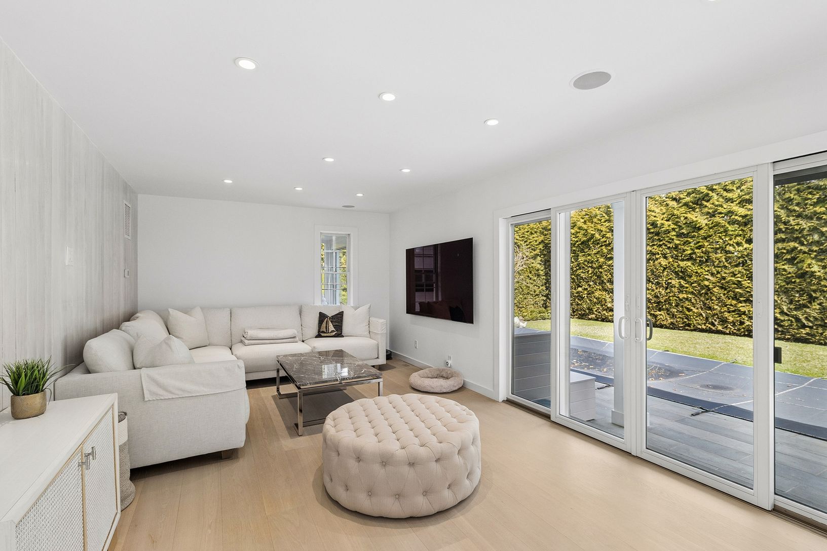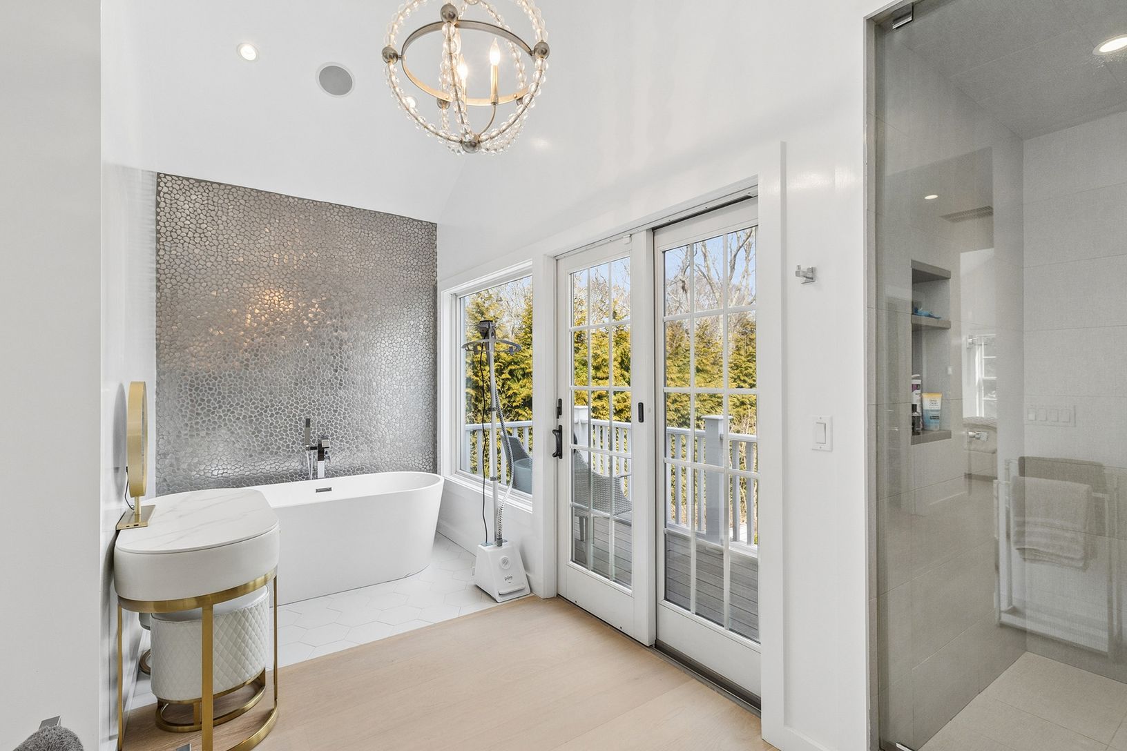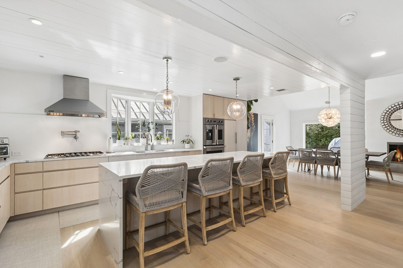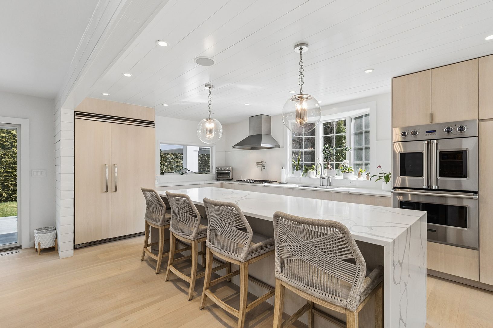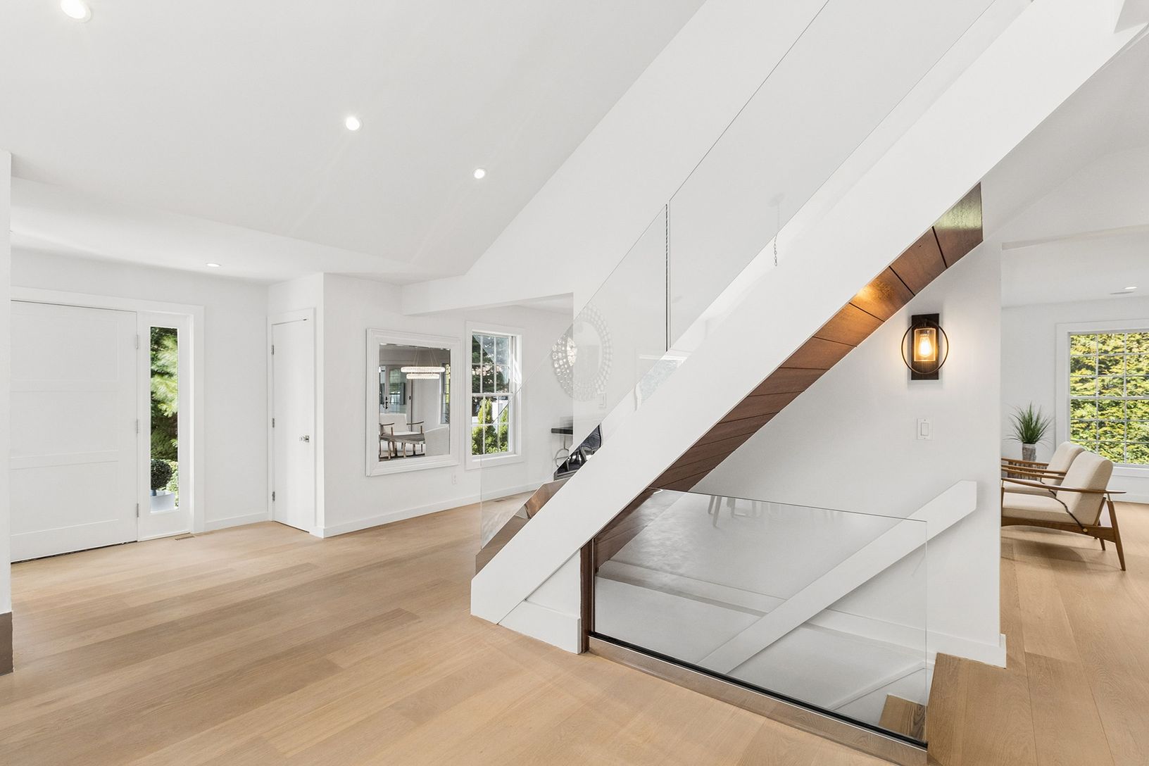 Nestled within the desirable East Hampton Springs, this fully renovated gated residence is set on +/- 0.40 beautifully landscaped acres, offering a seamless blend of modern design and luxury living. The home showcases an open-concept layout enhanced by double-height ceilings and wide-plank hardwood floors throughout. At the center of the home, a spacious living and dining area is anchored by a charming wood-burning fireplace, creating a warm y