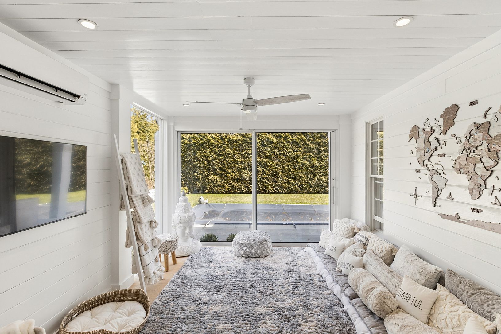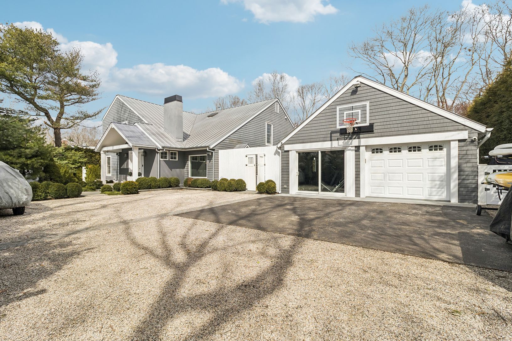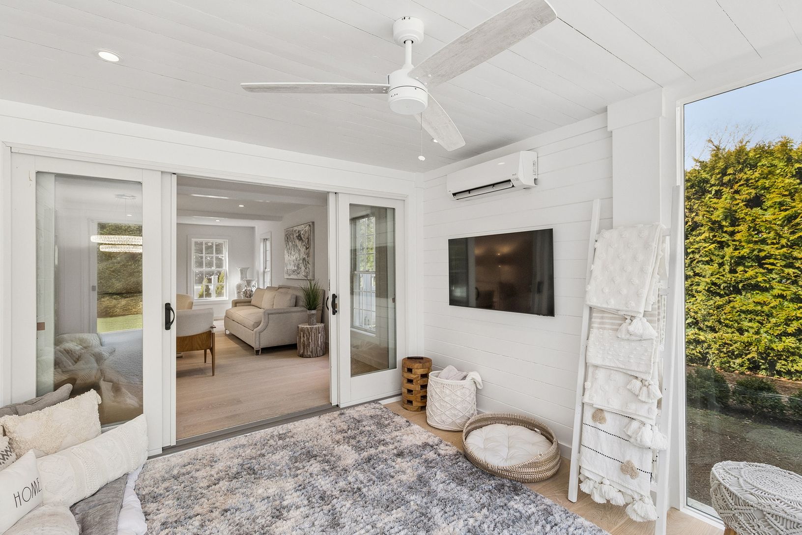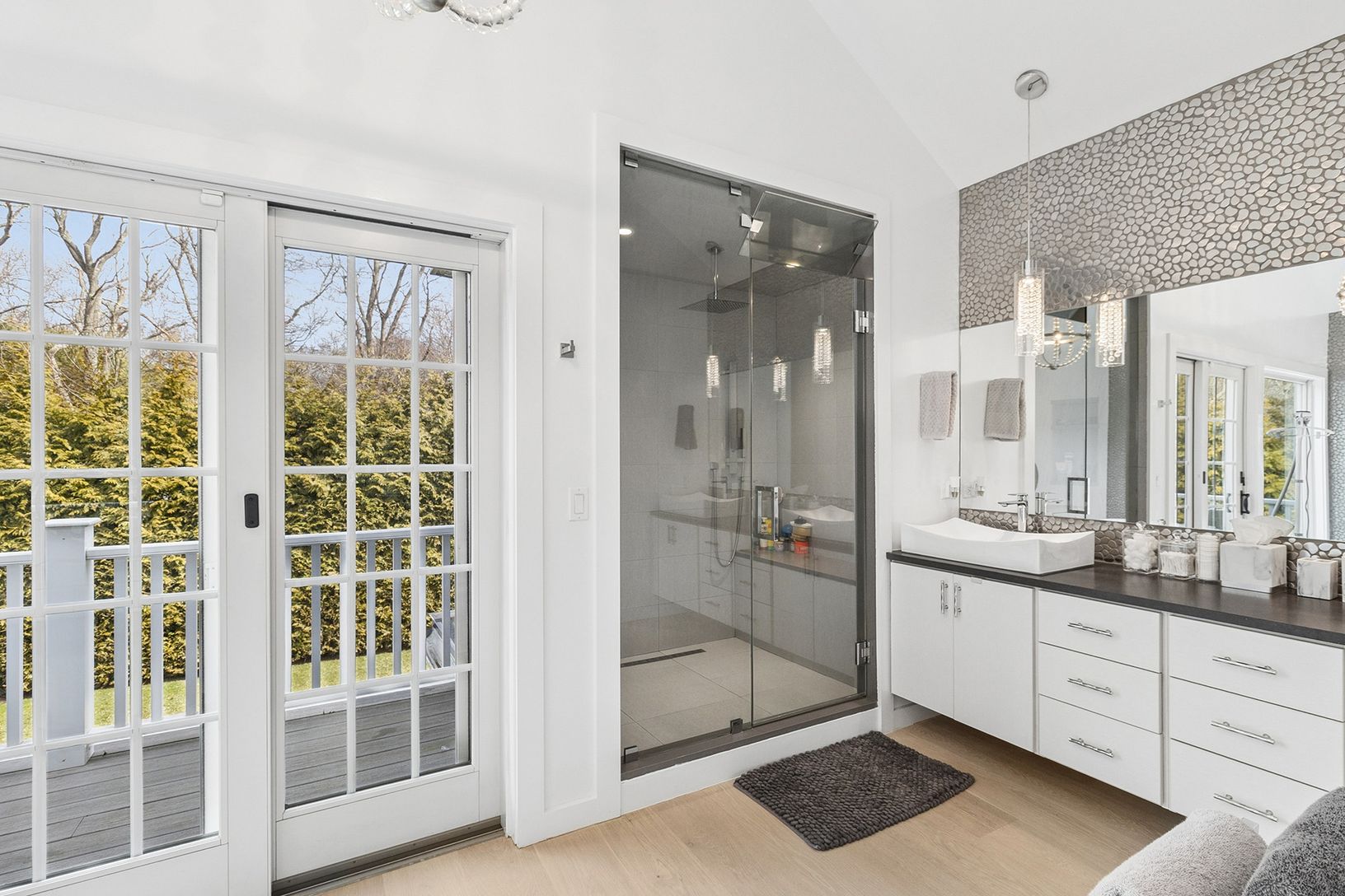 Nestled within the desirable East Hampton Springs, this fully renovated gated residence is set on +/- 0.40 beautifully landscaped acres, offering a seamless blend of modern design and luxury living. The home showcases an open-concept layout enhanced by double-height ceilings and wide-plank hardwood floors throughout. At the center of the home, a spacious living and dining area is anchored by a charming wood-burning fireplace, creating a warm y