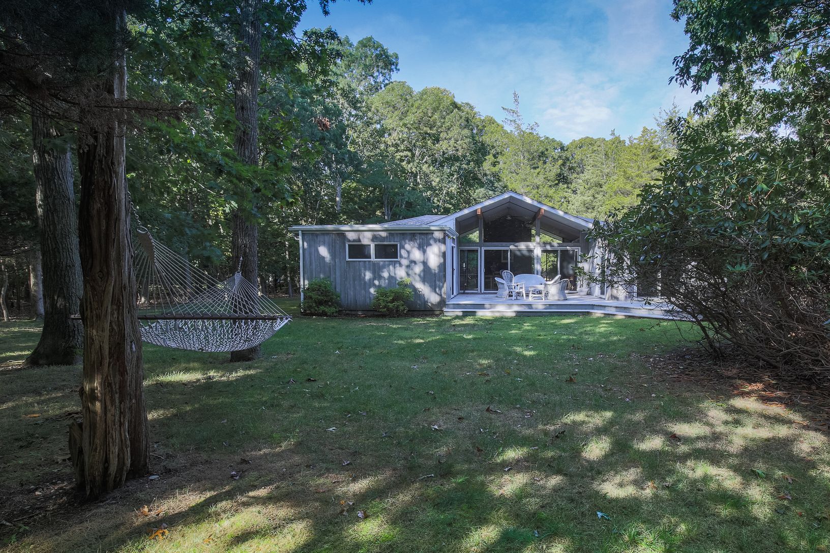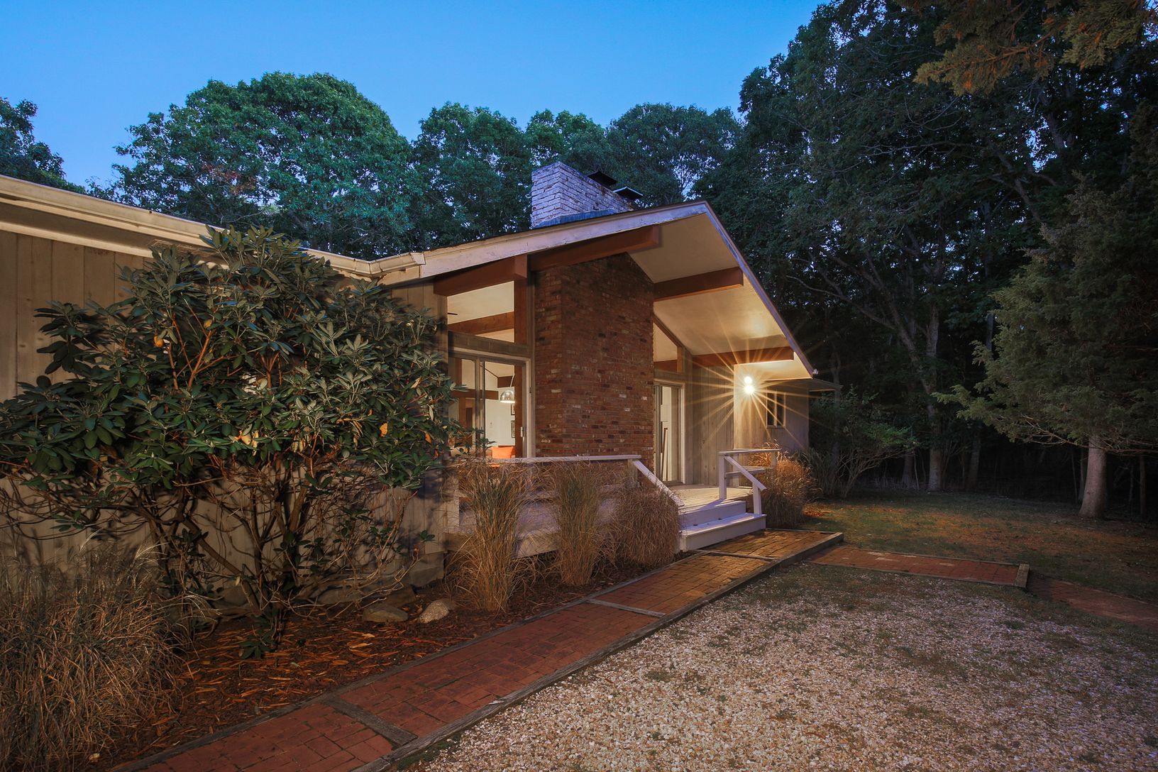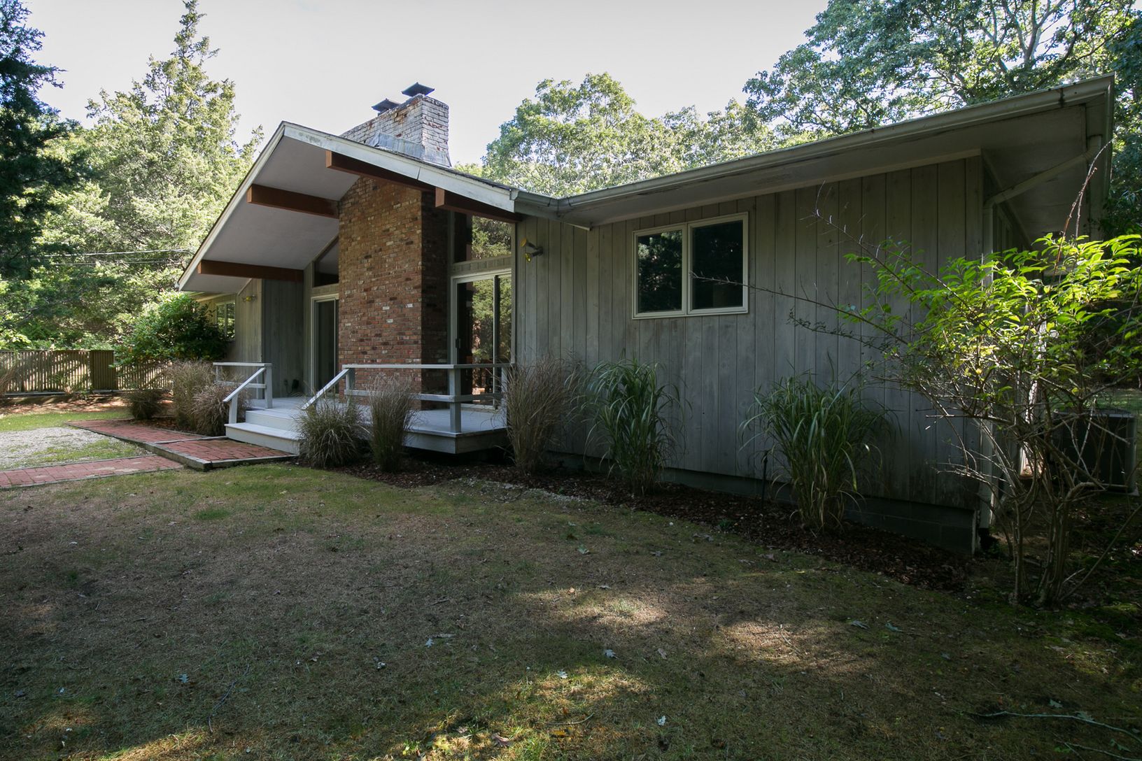 A coveted area within Springs, East Hampton, Louse Point Road is home to some of the most beautiful beaches on Gardiners Bay. This property features a mid-century modern house with a high-ceiling, light-filled open plan living room with fireplace and large glass doors and windows for indoor-outdoor living, and three bedrooms plus den/fourth bedroom. Multiple decks offer a variety of options for relaxing or entertaining. The private 1.7 acre