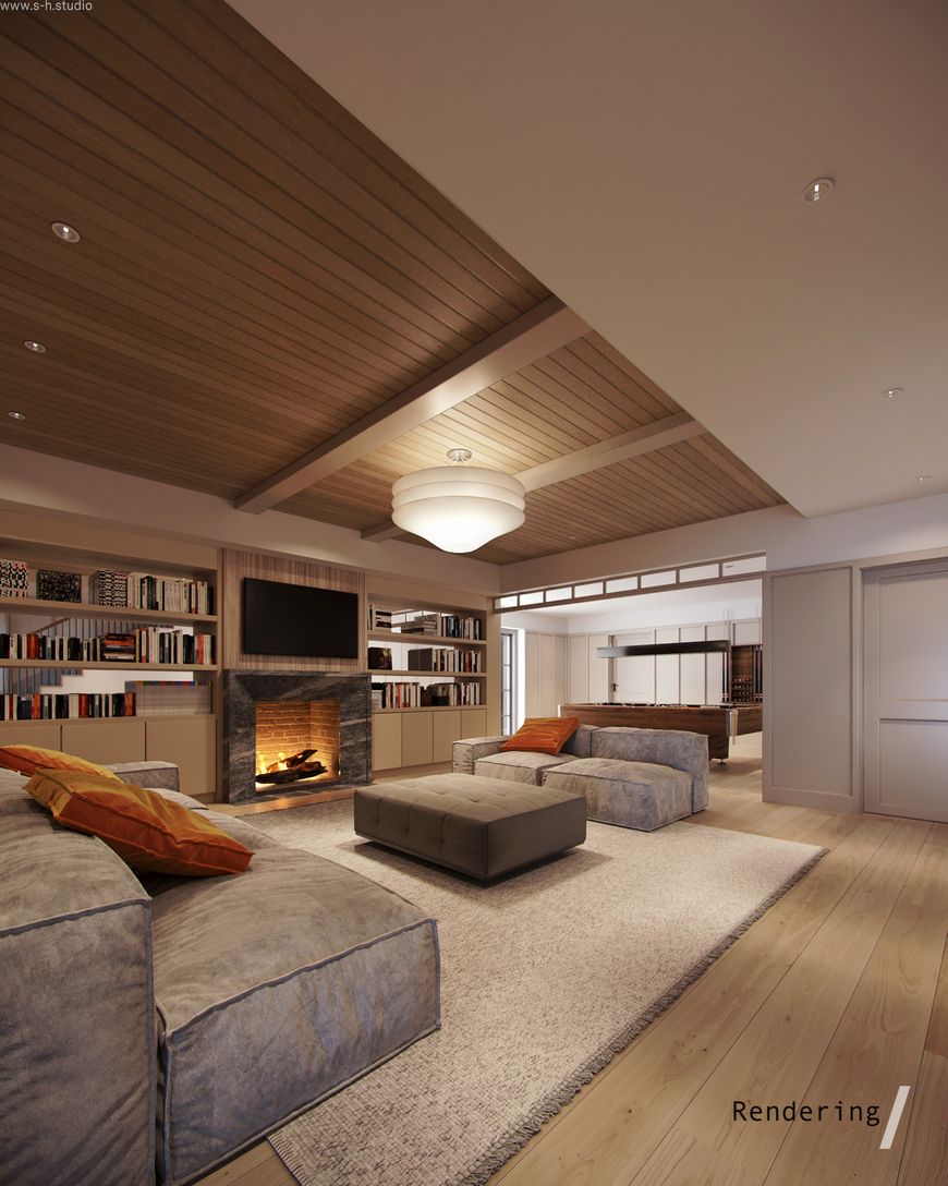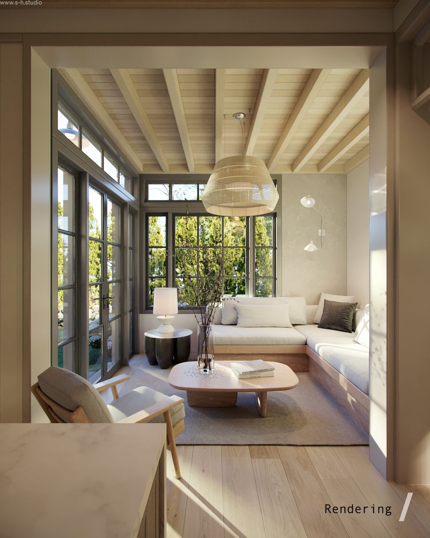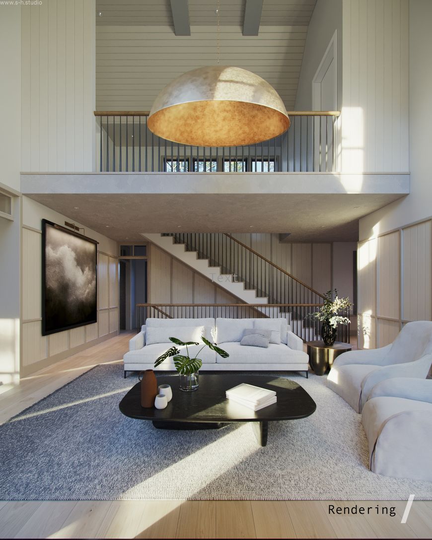 An entry foyer leads to a double-height living room with steel windows. Adjacent to the living room there is a junior suite that opens to the garden. Opposite the living r