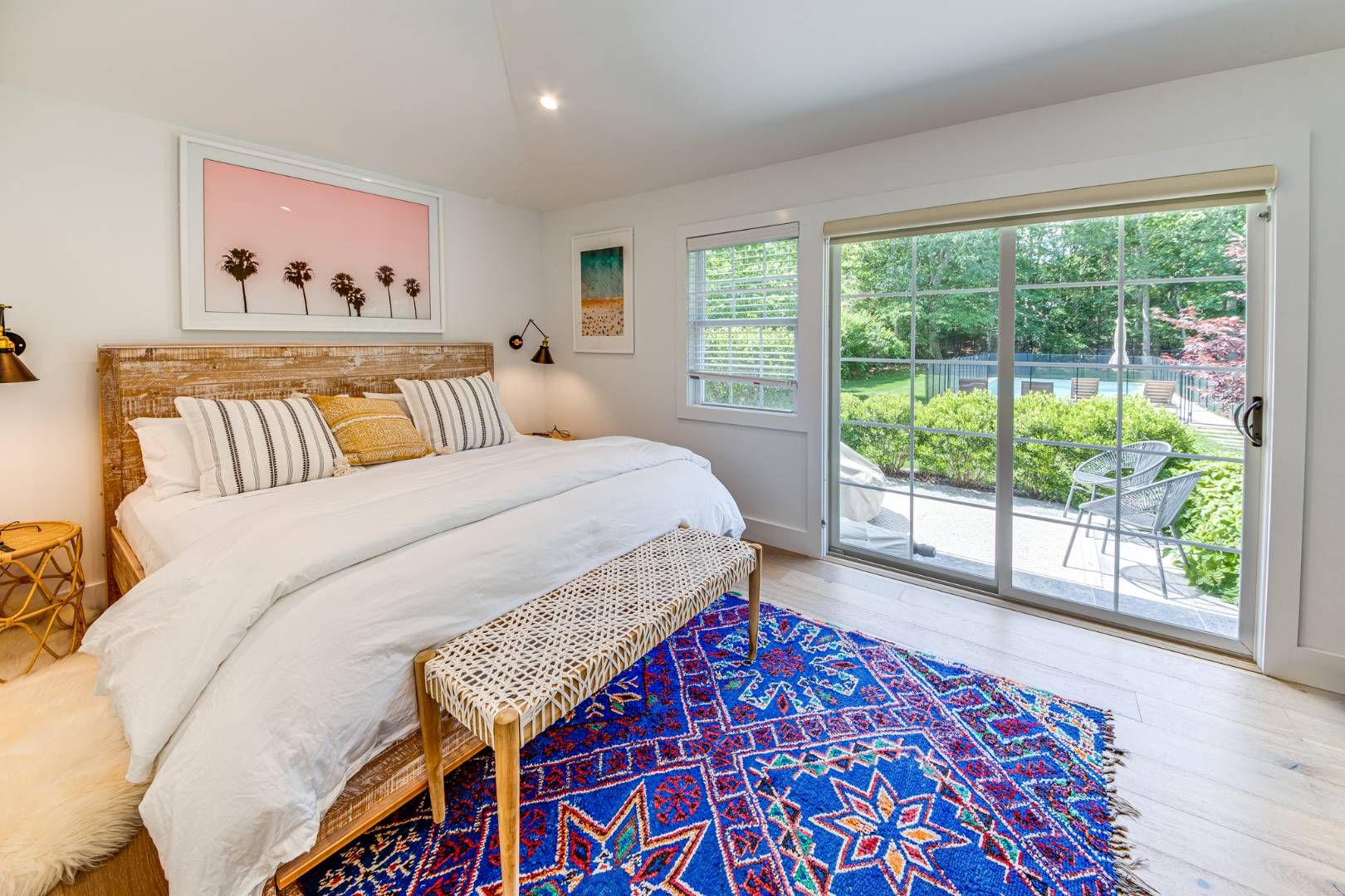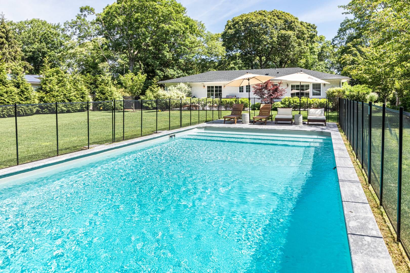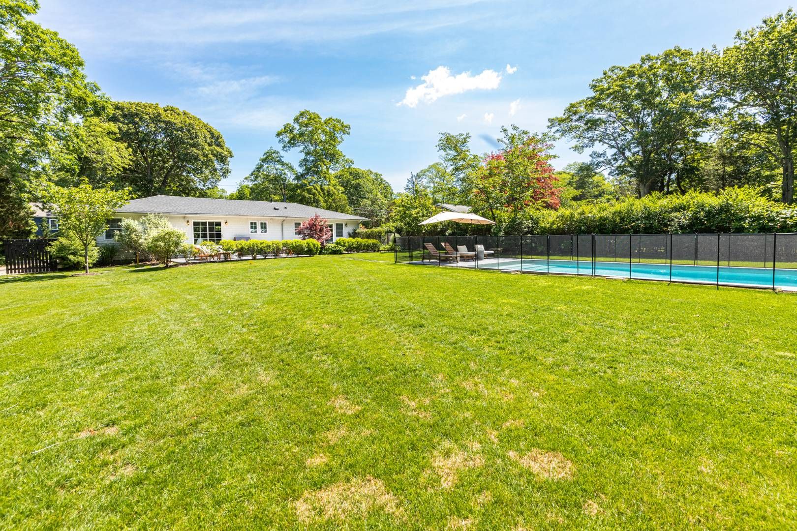 One level home on quiet street in East Hampton. Four bedrooms, newly furnished, central air and chefs kitchen. Finished lower level with large screen TV and great hang out space. Heated gunite pool with childproof fence if needed, outdoor shower, private and nicely landscaped .Lovely patio off of the kitchen with large table and chairs for al fresco dining and space for lounging with fire pit. Great location, near marinas, restaurants and bay