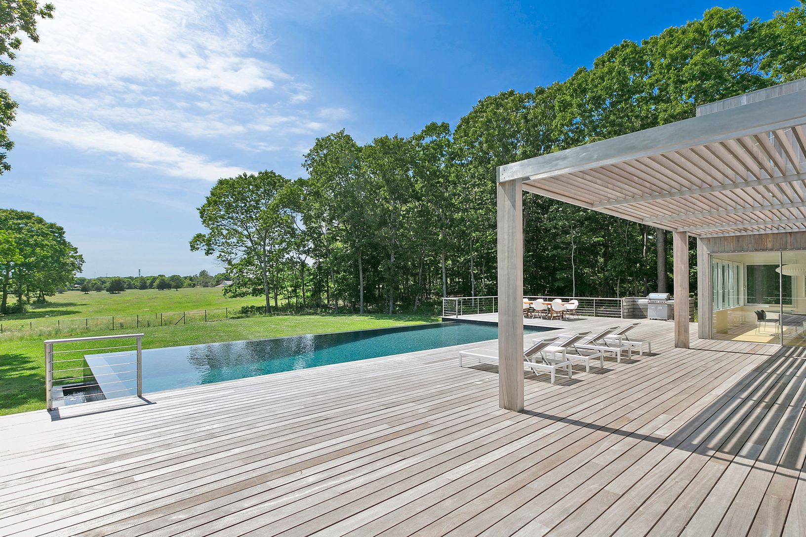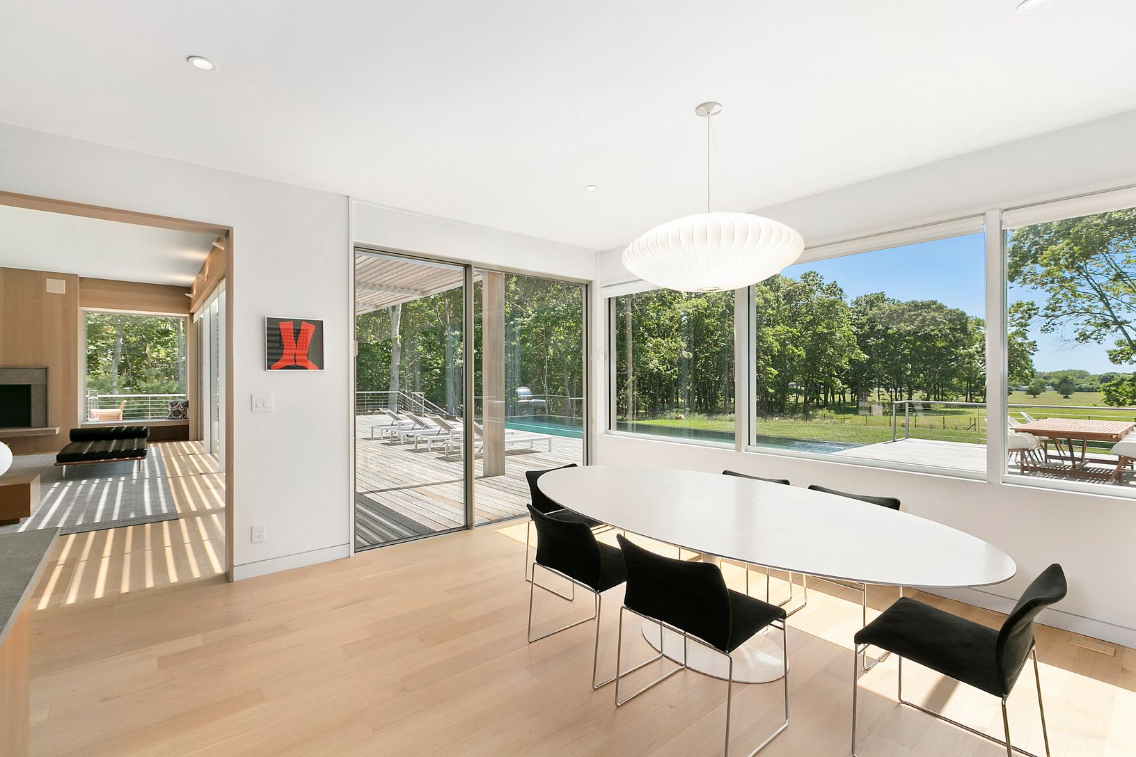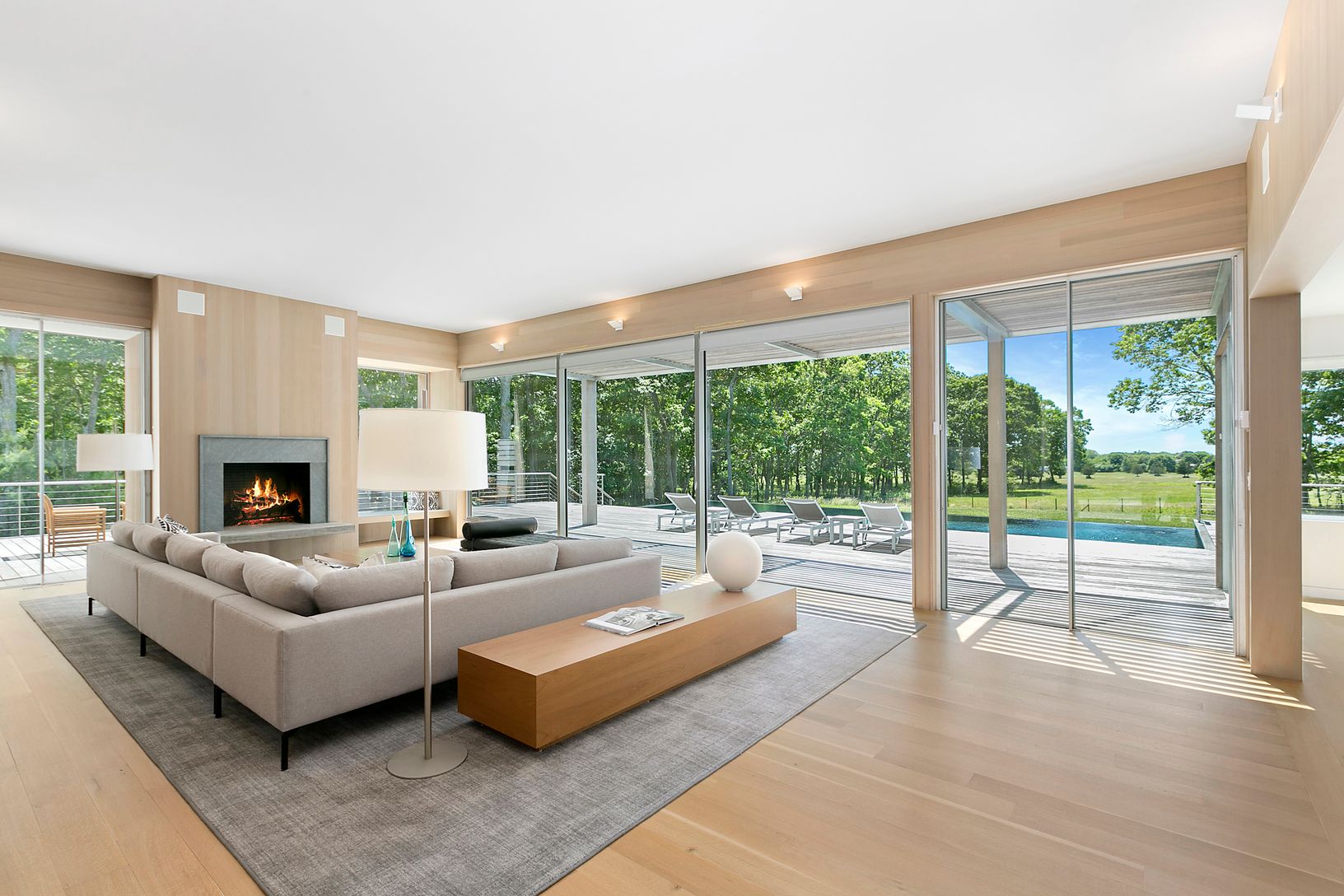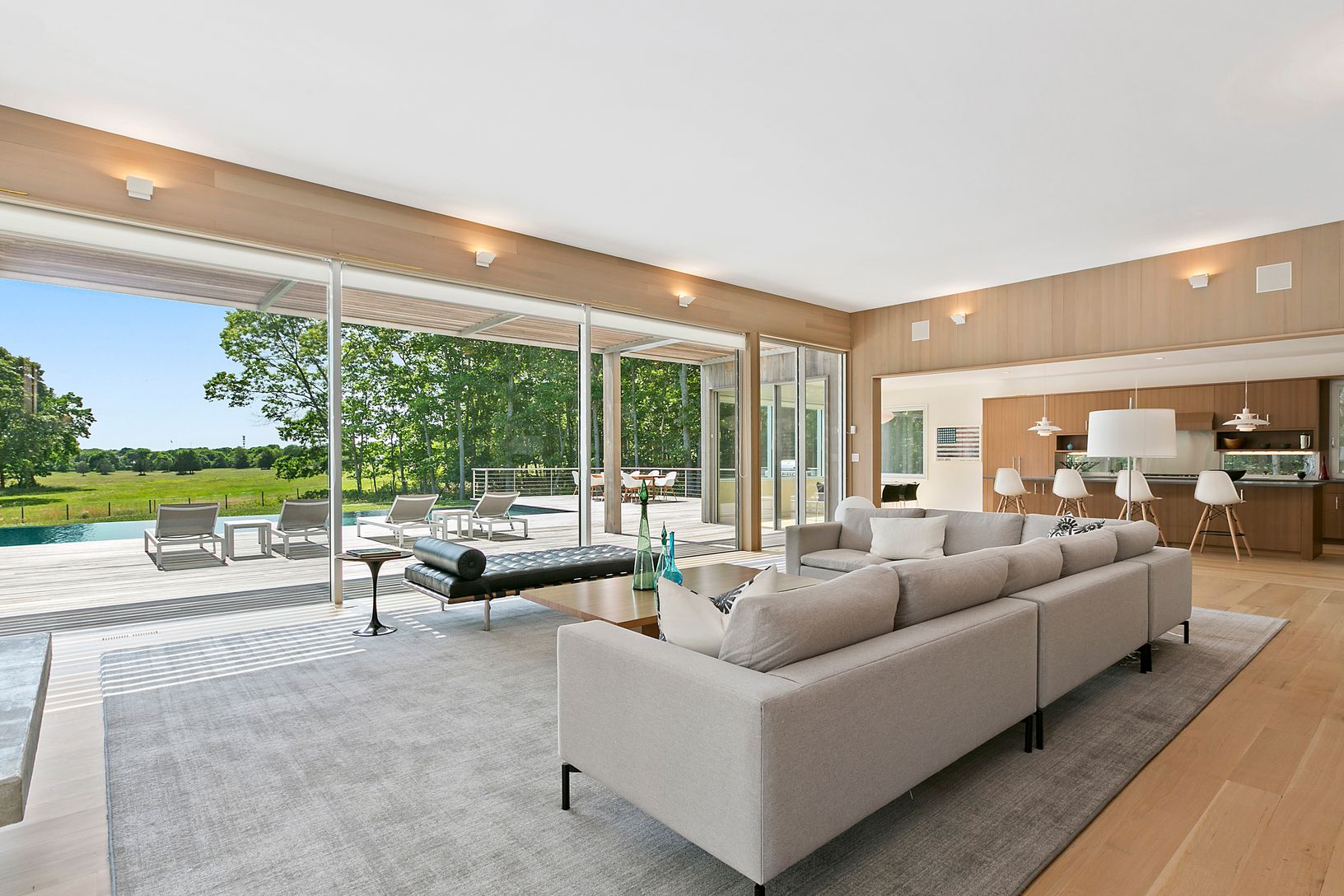 Amagansett Village Fringe. New modern completed in 2017. Designed by noted architect Andrew Pollock, set on 1.4+/- tranquil acres and featuring endless sunset views onto an open field. Extensive use of glass walls and oversized windows allow the Hamptons light to flow throughout. Cedar walls and wide plank quarter sawn white oak floors add warmth to the spacious 6,500+/- sq. ft. interior, offering 7 bedrooms and 6.5 baths. A magnificent living